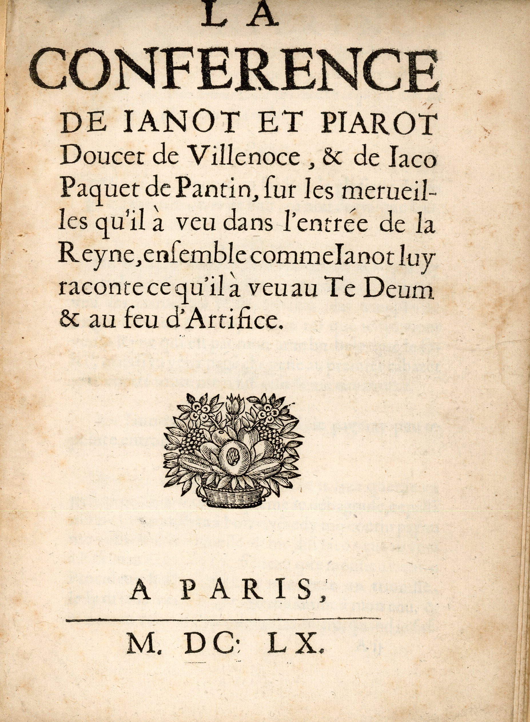 La conférence de Ianot et Piarot Doucet de Villenoce, & de Iaco Paquet de Pantin, sur les merveilles quil a veu dans lentrée de la Reyne, ensemble comme Ianot luy raconte ce quil a veu au Te Deum & eu feu dartifice, Paris, 1660, in-8, 15 pp. ;