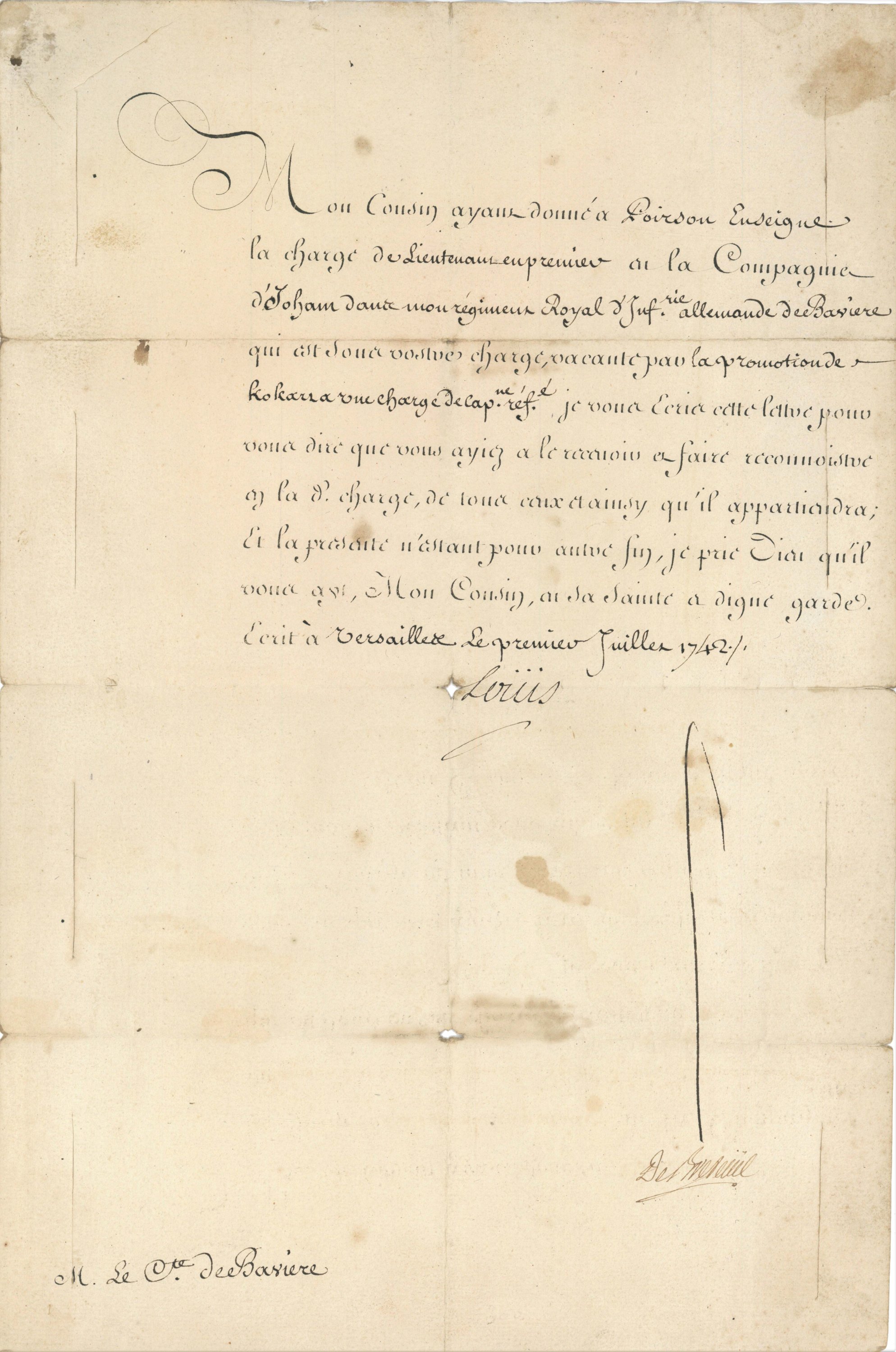 • L.S., Versailles, 1er juillet 1742, « Louis » (secrétaire), et contresignée par François Victor Le Tonnelier de Breteuil, ministre de la Guerre, à Charles Théodore de Bavière, comte palatin du Rhin, au sujet d’une promotion au sein du régiment Royal d’Infanterie allemande de Bavière, 1 page in-fol., avec adresse ;