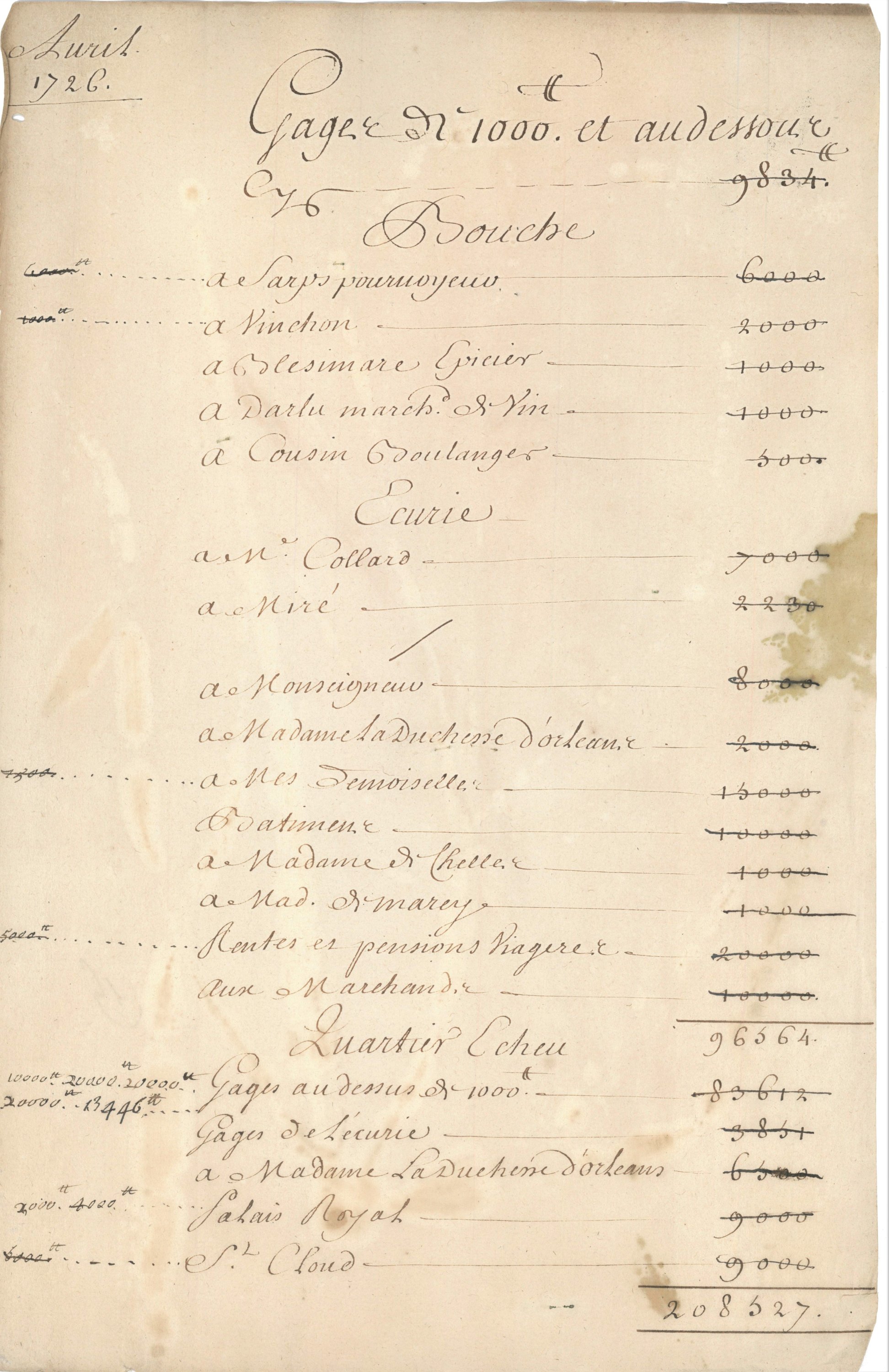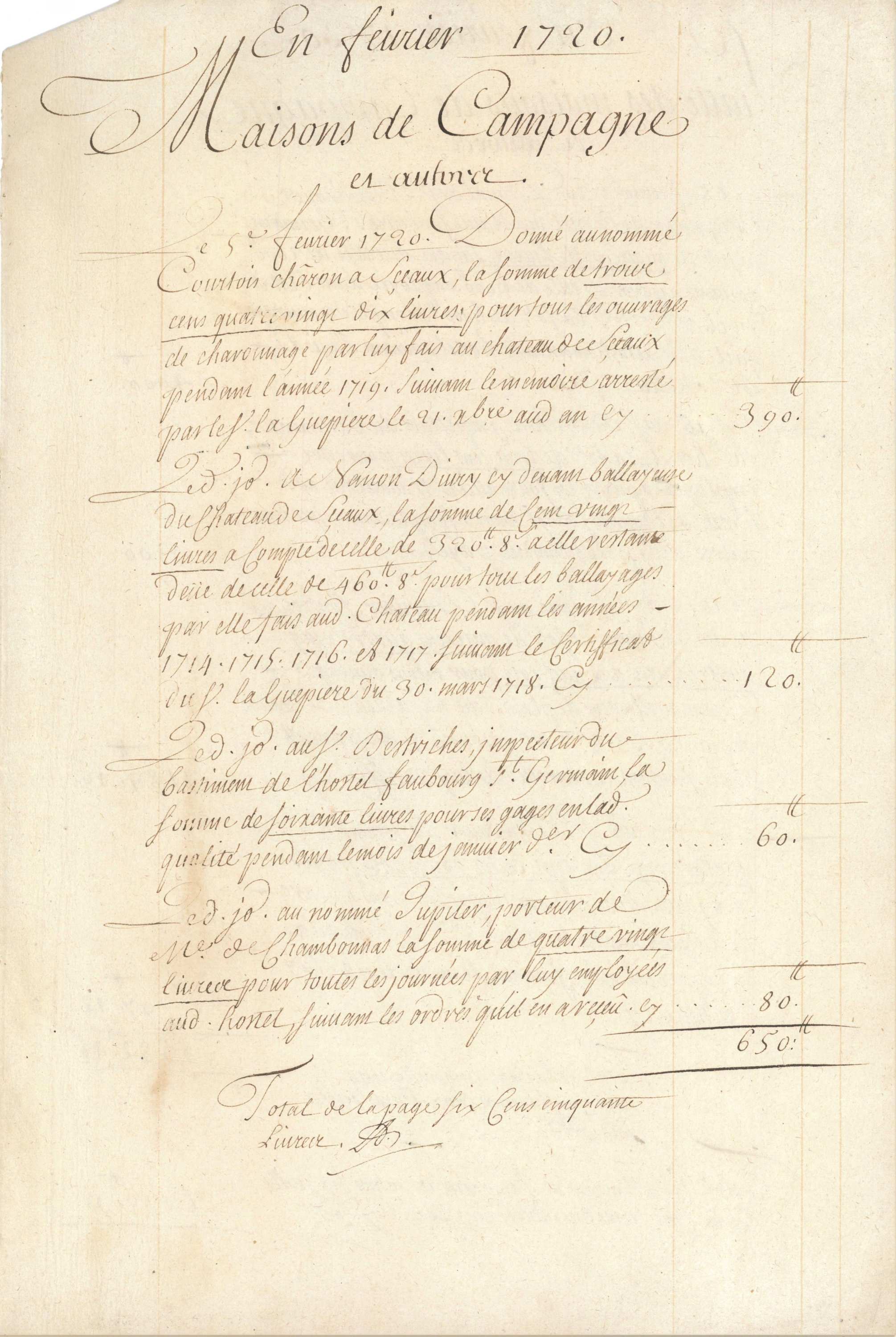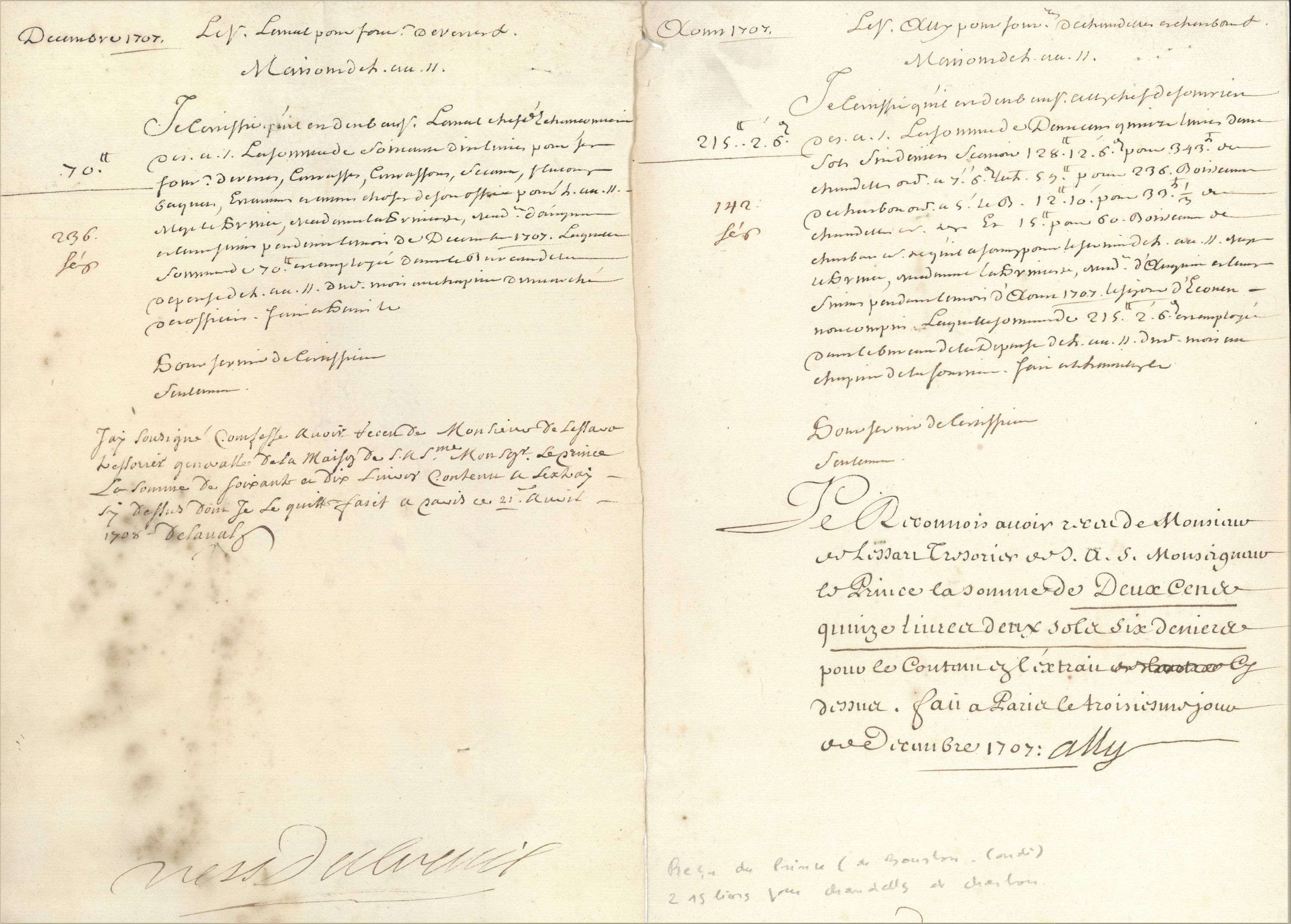• Réunion de + de 20 feuillets in-folio manuscrits ; extraits de comptes divers en provenance de maisons princières, dont celle du duc du Maine, Louis Auguste de Bourbon, prince légitimé, avec dépenses au château et au parc de Sceaux, 1720 ; celle du prince de Condé, 1707-1708, dépenses en bougies et flambeaux fournis pendant les états de Bourgogne en juin et juillet 1706 ; etc ;