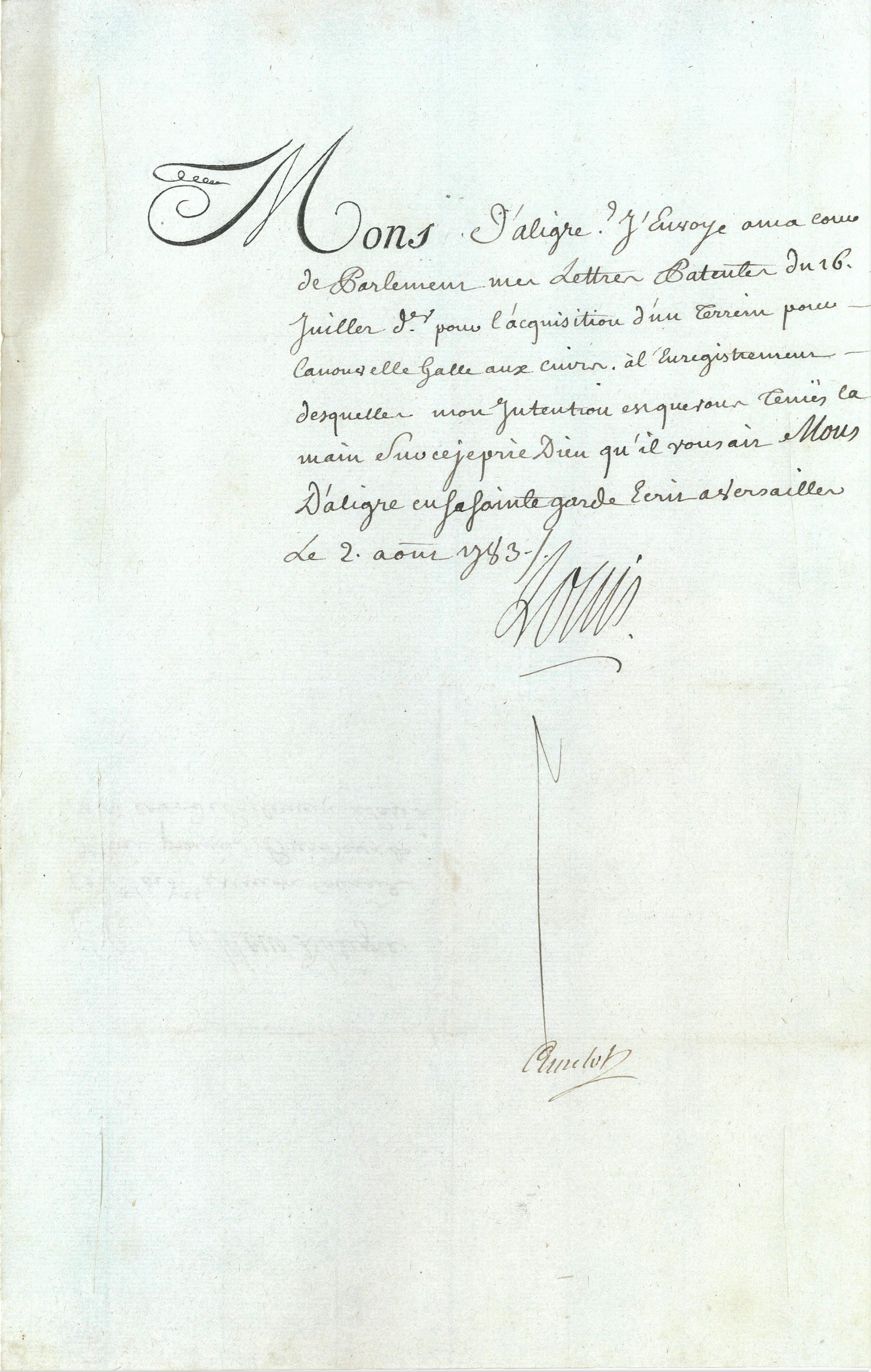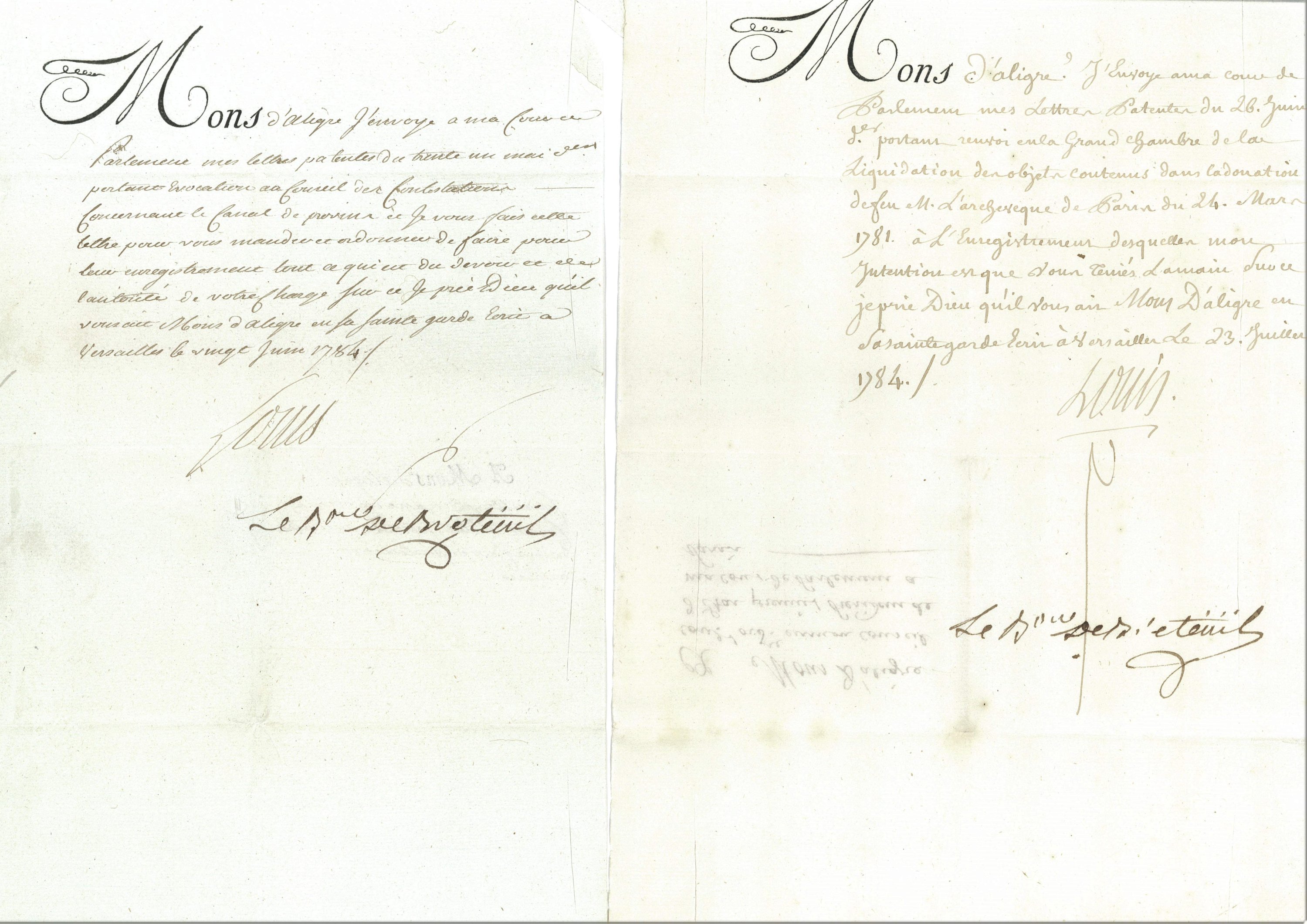 Réunion de 5 L.S., Versailles, 1783-1784, « Louis » (secrétaires du roi), contresignées par les secrétaires d’Etat à la Maison du roi Antoine-Jean Amelot de Chaillou et Louis Auguste Le Tonnelier baron de Breteuil, adressées à Etienne comte de Marans et marquis d’Aligre (1727-1798), président du parlement de Paris, 5 pages in-folio, relatives à la liquidation de la donation de l’archevêque de Paris, à la réunion de la justice de Fleury à celle de Villers-Cotterêts, à l’abolition du droit d’Aubaine entre la France et la principauté de la Leyen (Etat allemand), à l’acquisition d’un terrain pour la nouvelle halle aux cuirs à Paris, au canal de Provins.