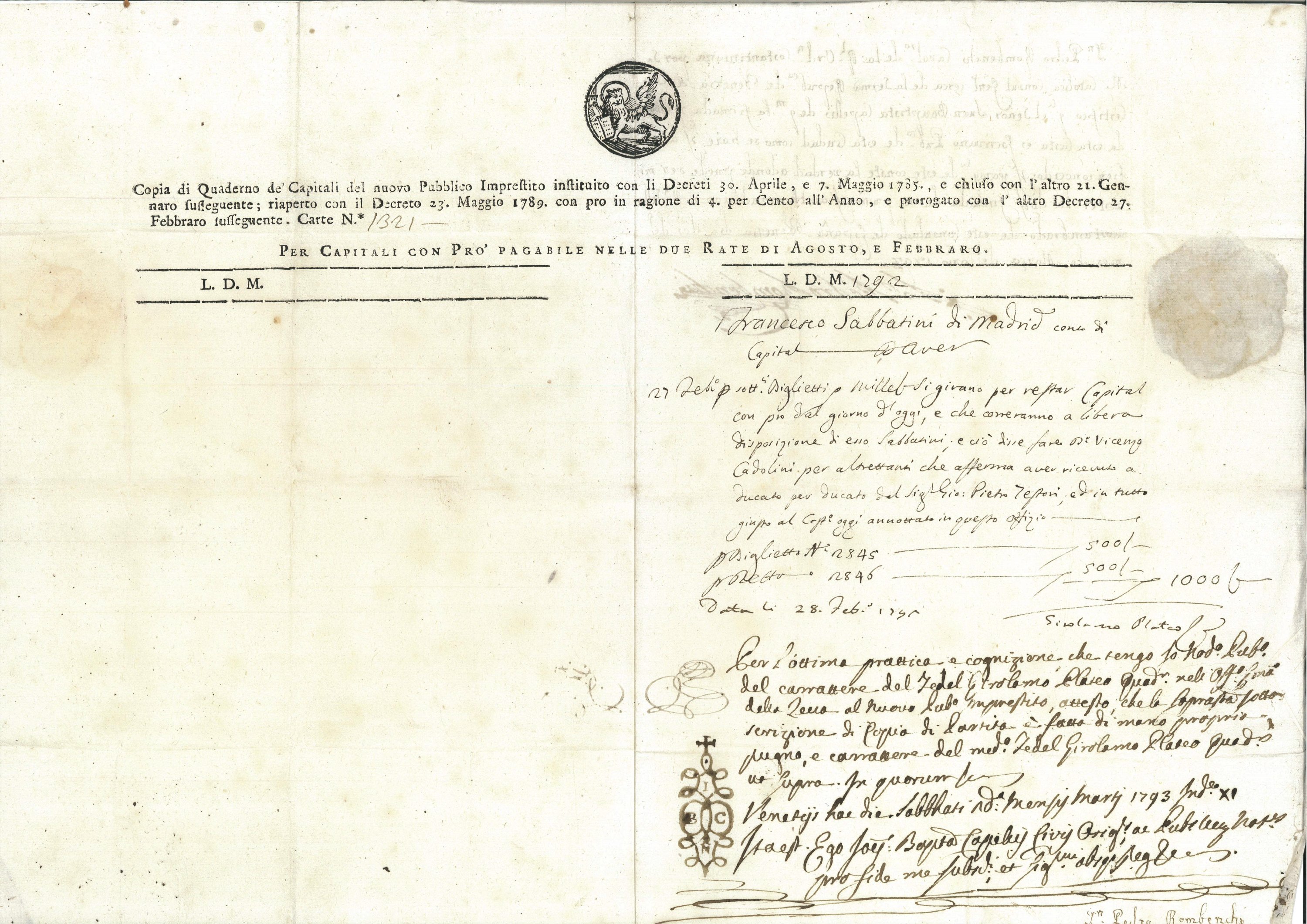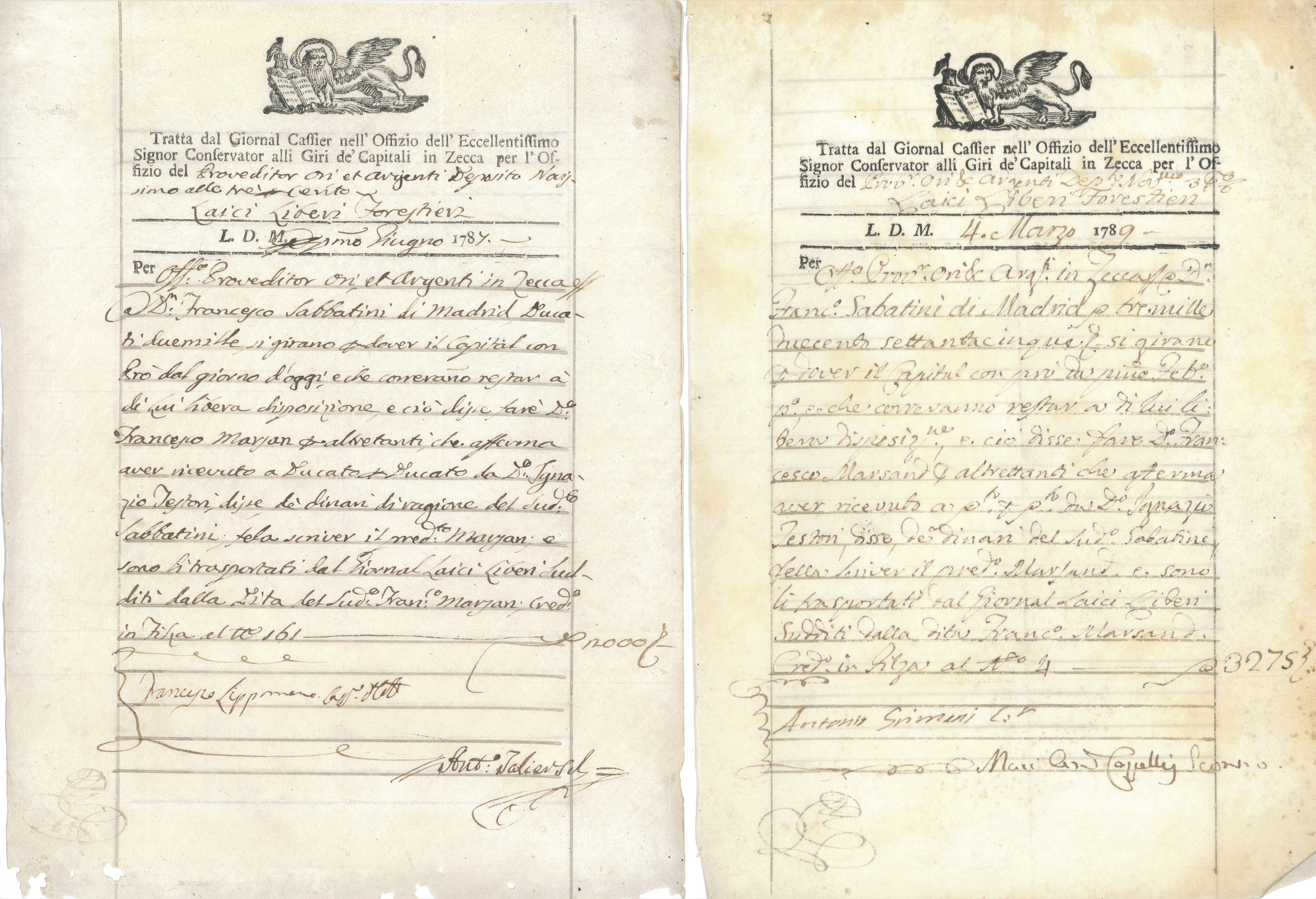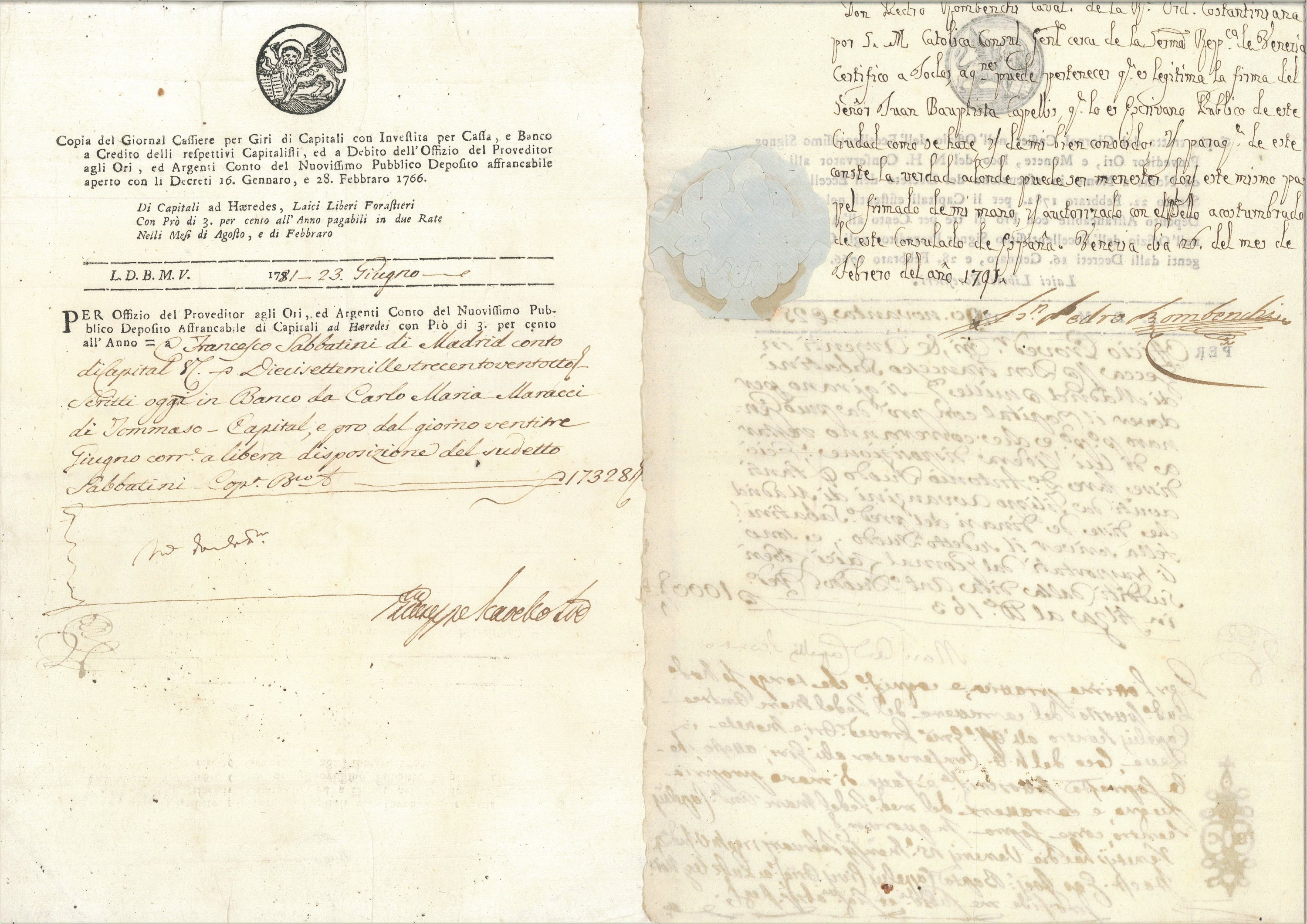 • env. 35 pièces manuscrites, dont rarissime ensemble de 30 lettres de crédit ou d’escompte bancaire, à entête du Lion de Venise, établies au nom de Francisco Sabatini entre 1774 et 1796 ;