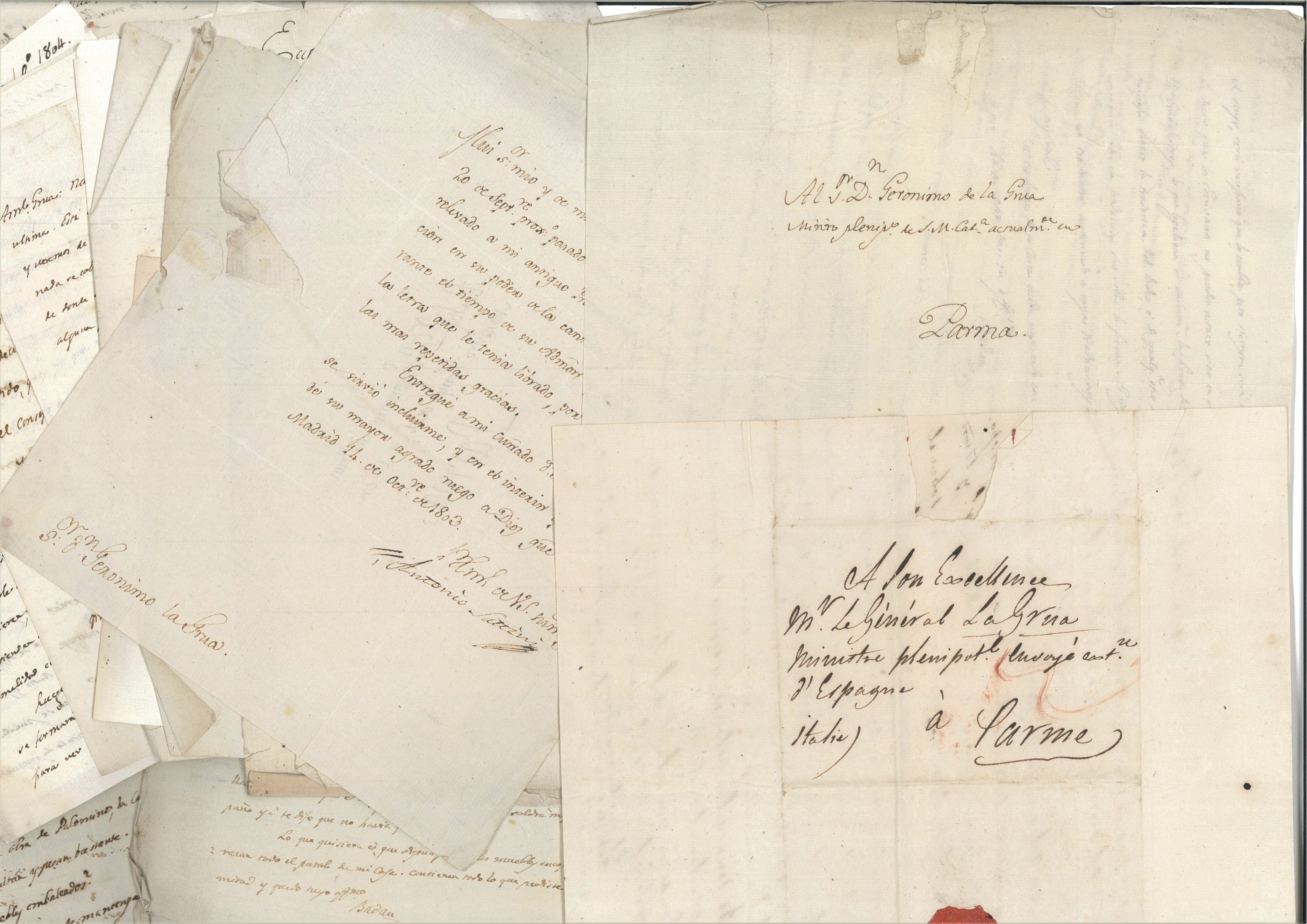 • env. 75 L.A.S. ou L.A. in-8, 1803-1804, écrites de Madrid, Parme, Naples, etc, par Geronimo de la Grua, ministre plénipotentiaire d’Espagne auprès des cours de Gênes, Parme et de Stockholm, Antonio de Zayas, Joseph Badan l’un des mandataires à la pairie royale d’Espagne, le baron Luigi Casimiri Ventromile, etc.