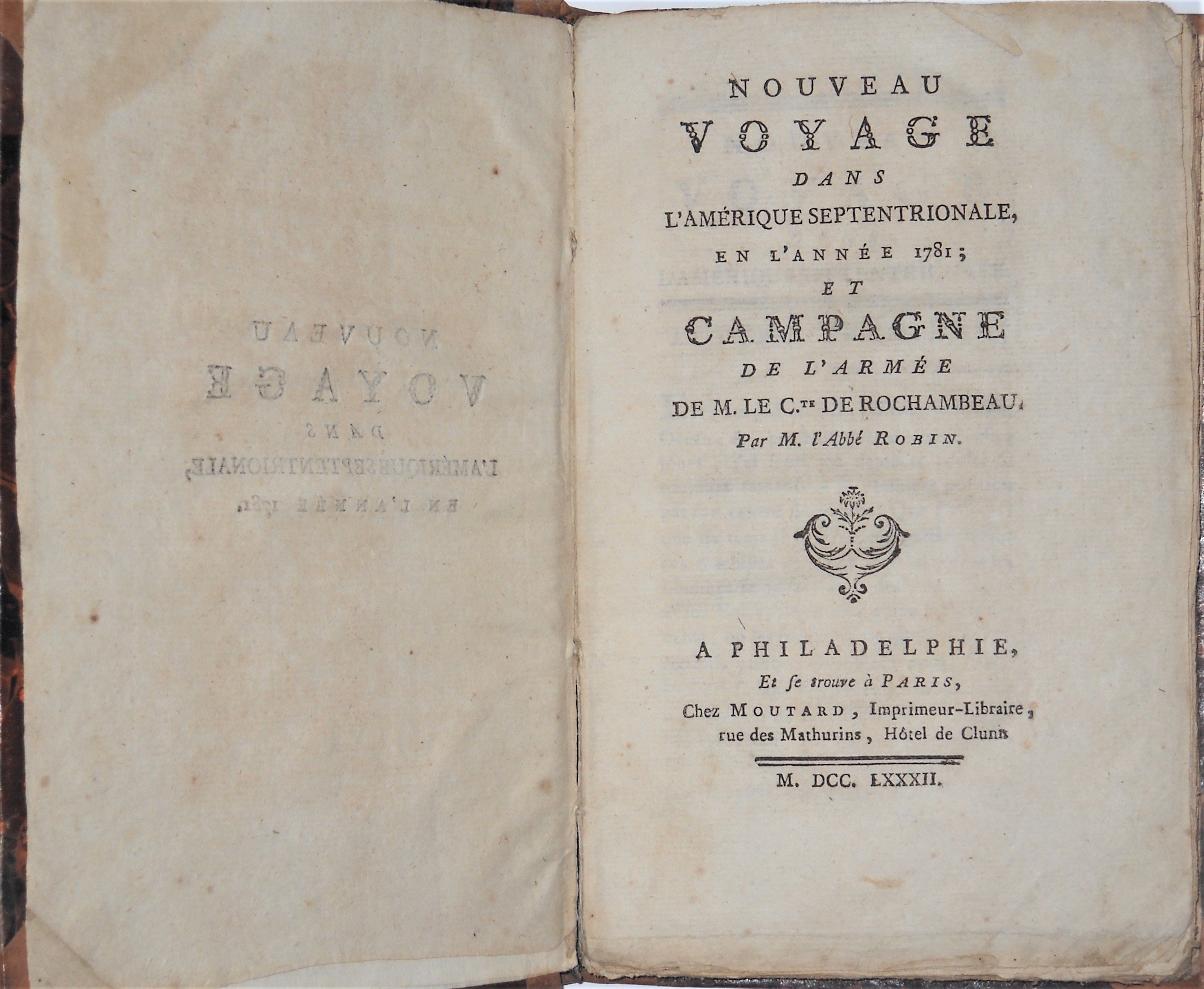 Nouveau voyage dans l'Amérique septentrionale, en l'année 1781 ; et campagne de l'armée de M. le comte de Rochambeau, Philadelphie, Paris, Moutard, 1782, in-8, 191 pp., rel. 1/2 basane brune 19e s. (rousseurs).