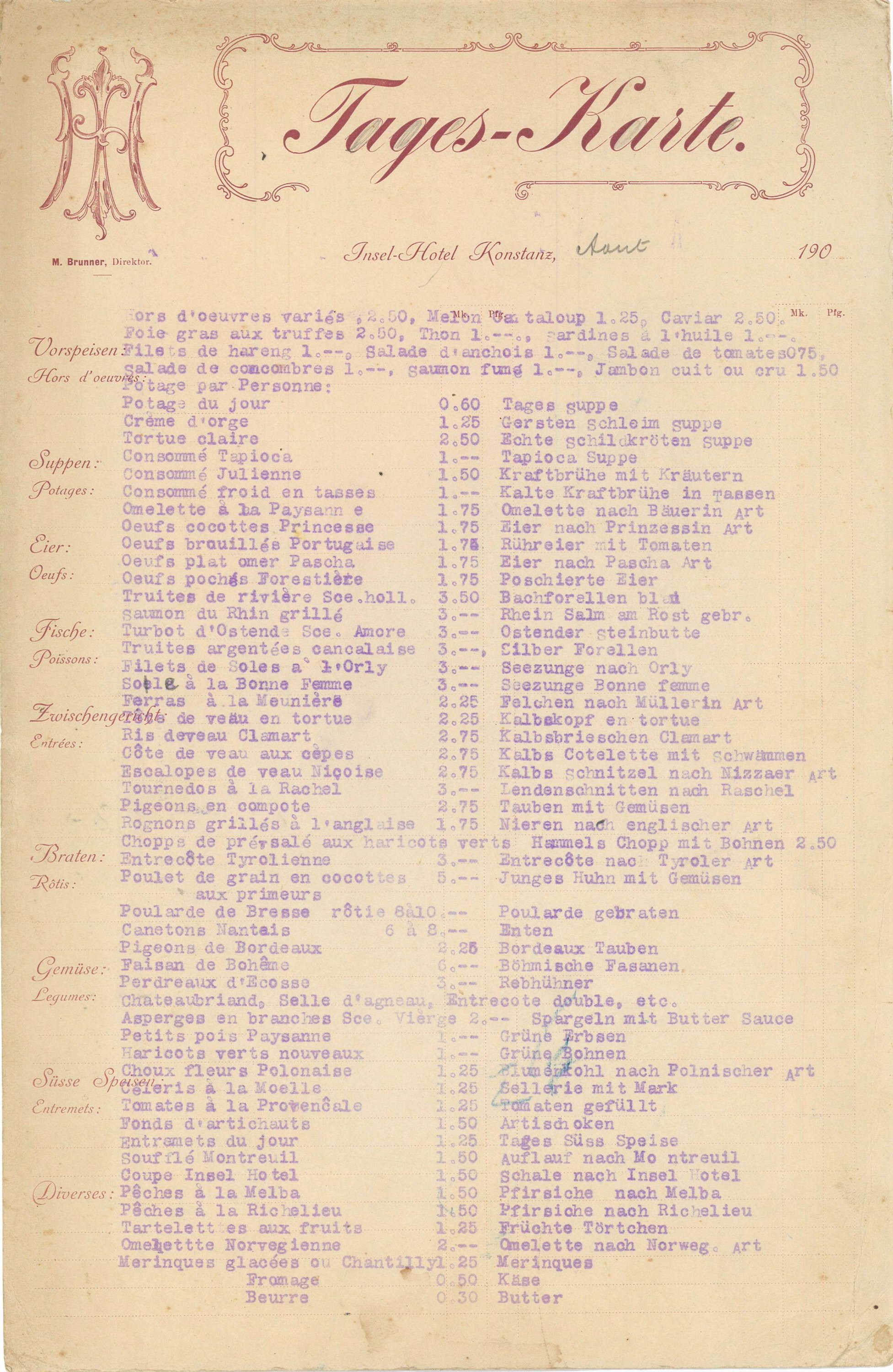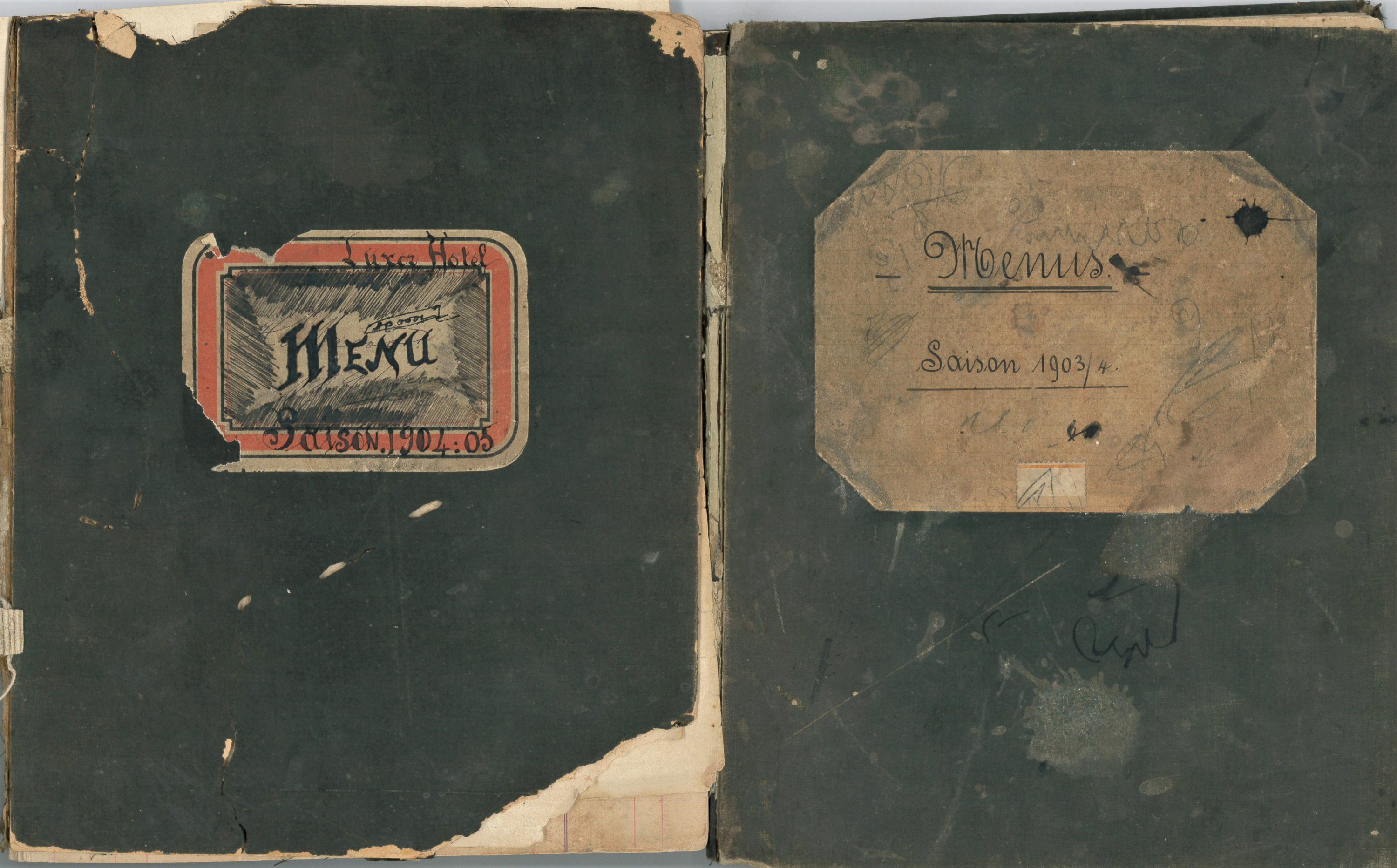 Réunion de 3 registres et 11 pages volantes, menus des lunches et diners proposés au palace de lInsel Hotel (Allemagne) entre 1903 et 1907, écrits majoritairement en français, rel. en létat :
