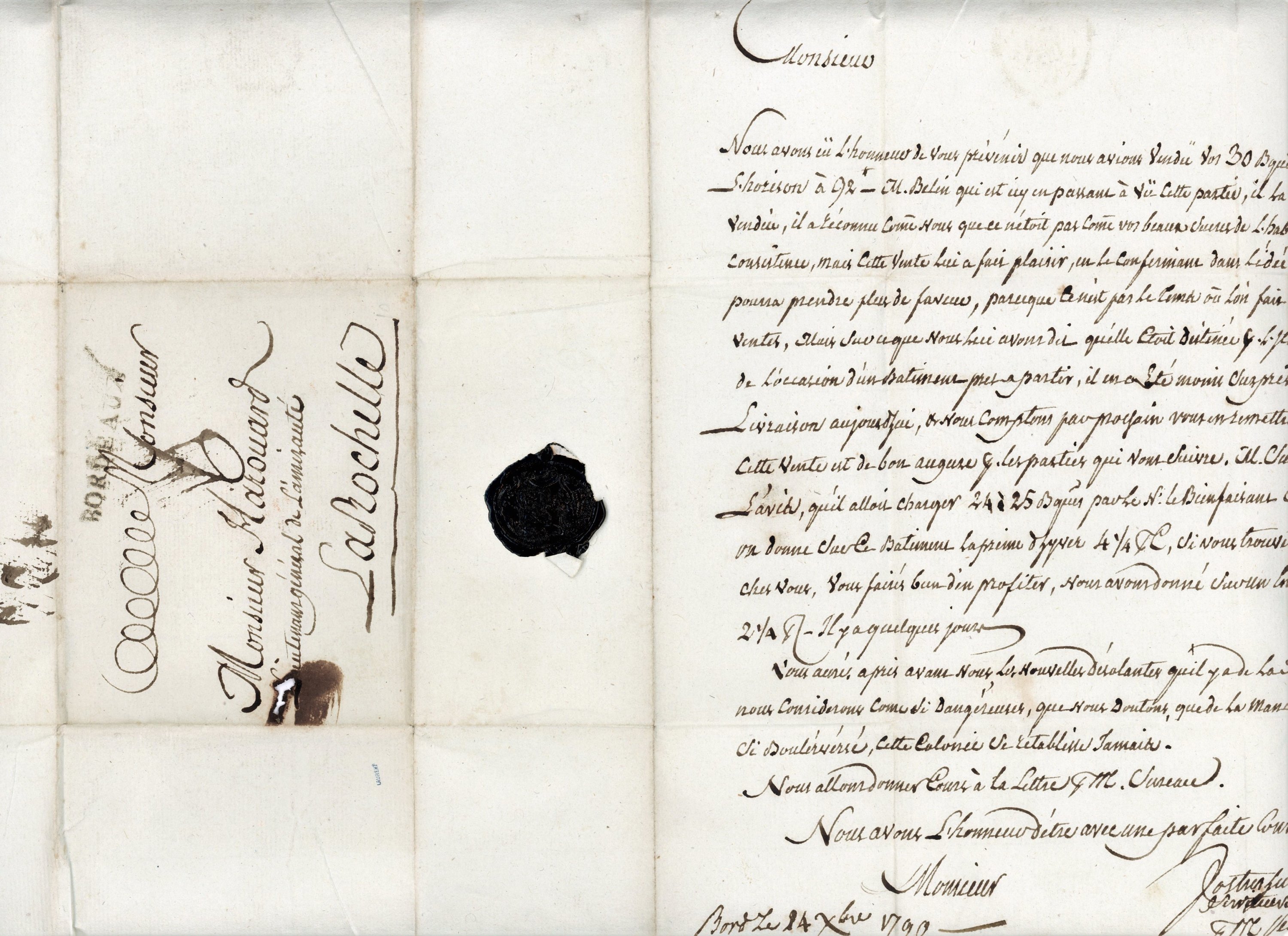 3 L.A.S, 1790, 4 pages in-8, avec beaux cachets de cire rouge et noire, écrites au début de la Révolution par des armateurs bordelais adressées à Pierre Etienne Louis Harouard, lieutenant général en lAmirauté de la Rochelle et copropriétaire dune des sucreries les plus riches de Saint Domingue, la plantation Saint Michel au Quartier-Morin, aux portes de la ville du Cap Français.