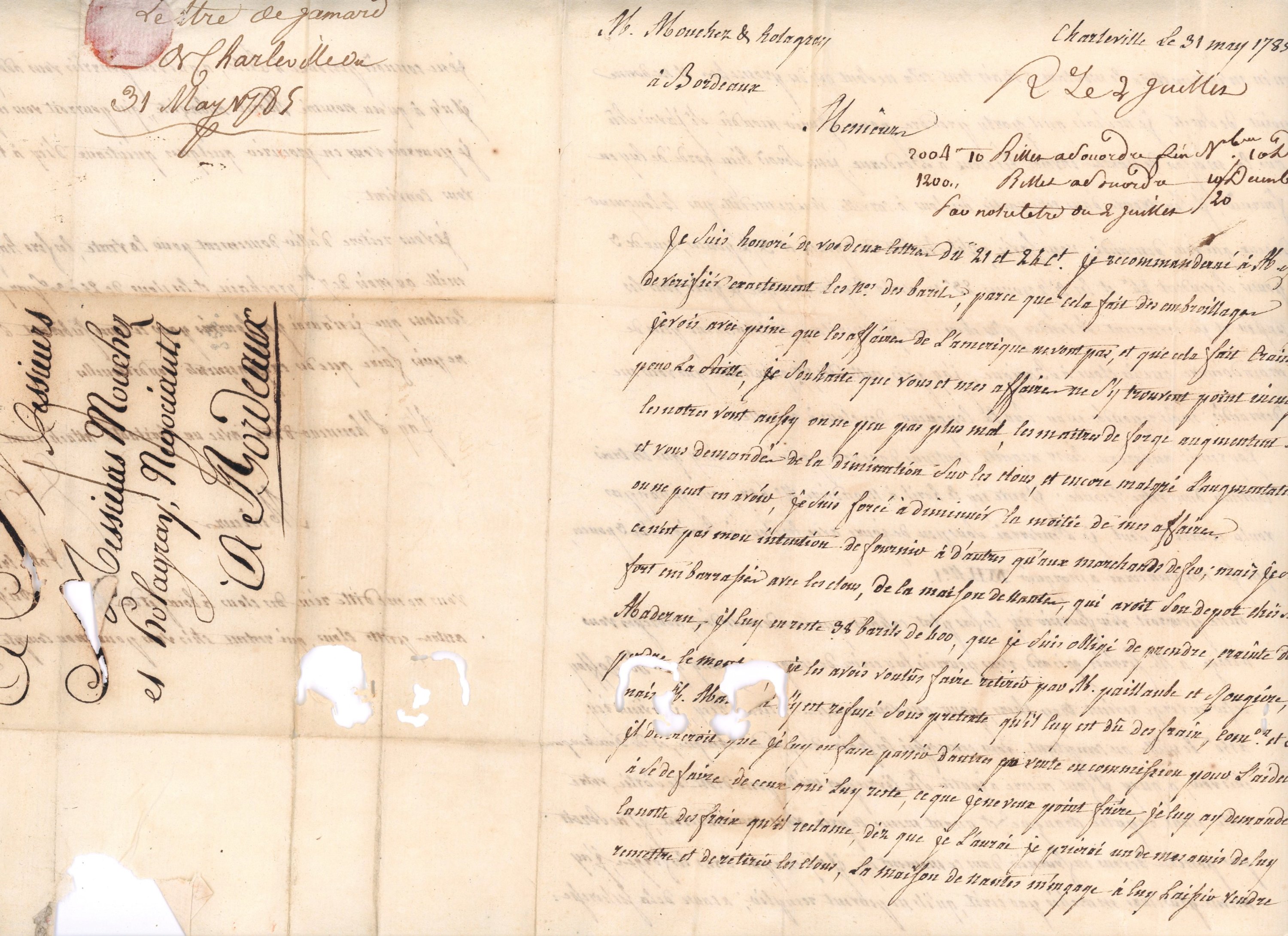 Joint : 17 L.A.S., 18e siècle, divers auteurs et destinataires en France métropole, dont une lettre, 3 pages in-8, écrites par Jean Joseph Smet, marchand de fer à Charleville-Mézières le 31 mai 1785 et adressée à Mouchez et Holagray négociants en fer à Bordeaux.
