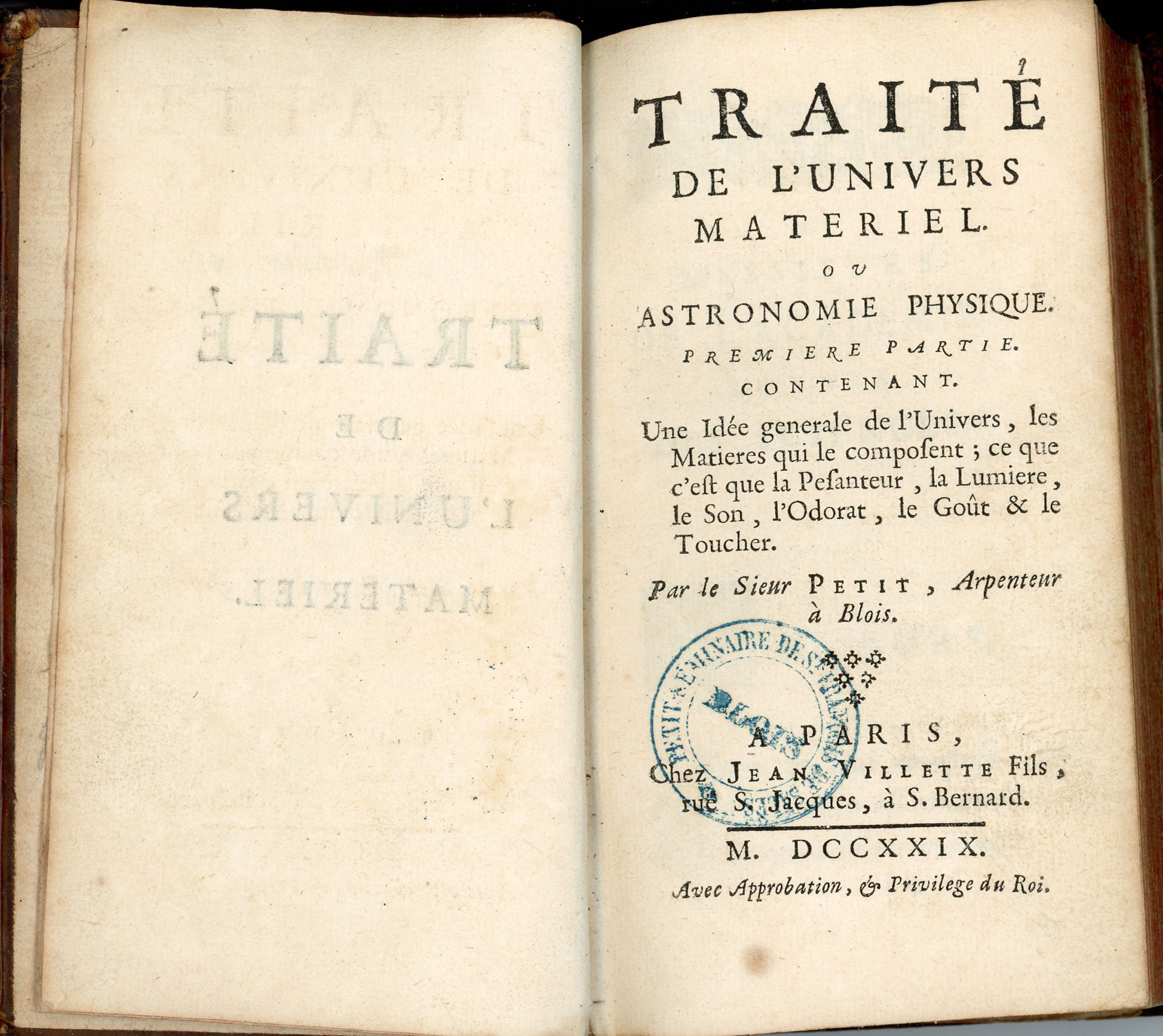 Traité de l'univers matériel ou astronomie physique. Première partie contenant une idée générale de l'Univers, les matières qui le composent ; ce que cest que la pesanteur, la lumière, le son, lodorat, le goût & le toucher, Paris, Jean Villette fils, 1729, rel. plein veau dépoque (en létat), (11 ff.)-234 pp. avec 1 planche hors-t.