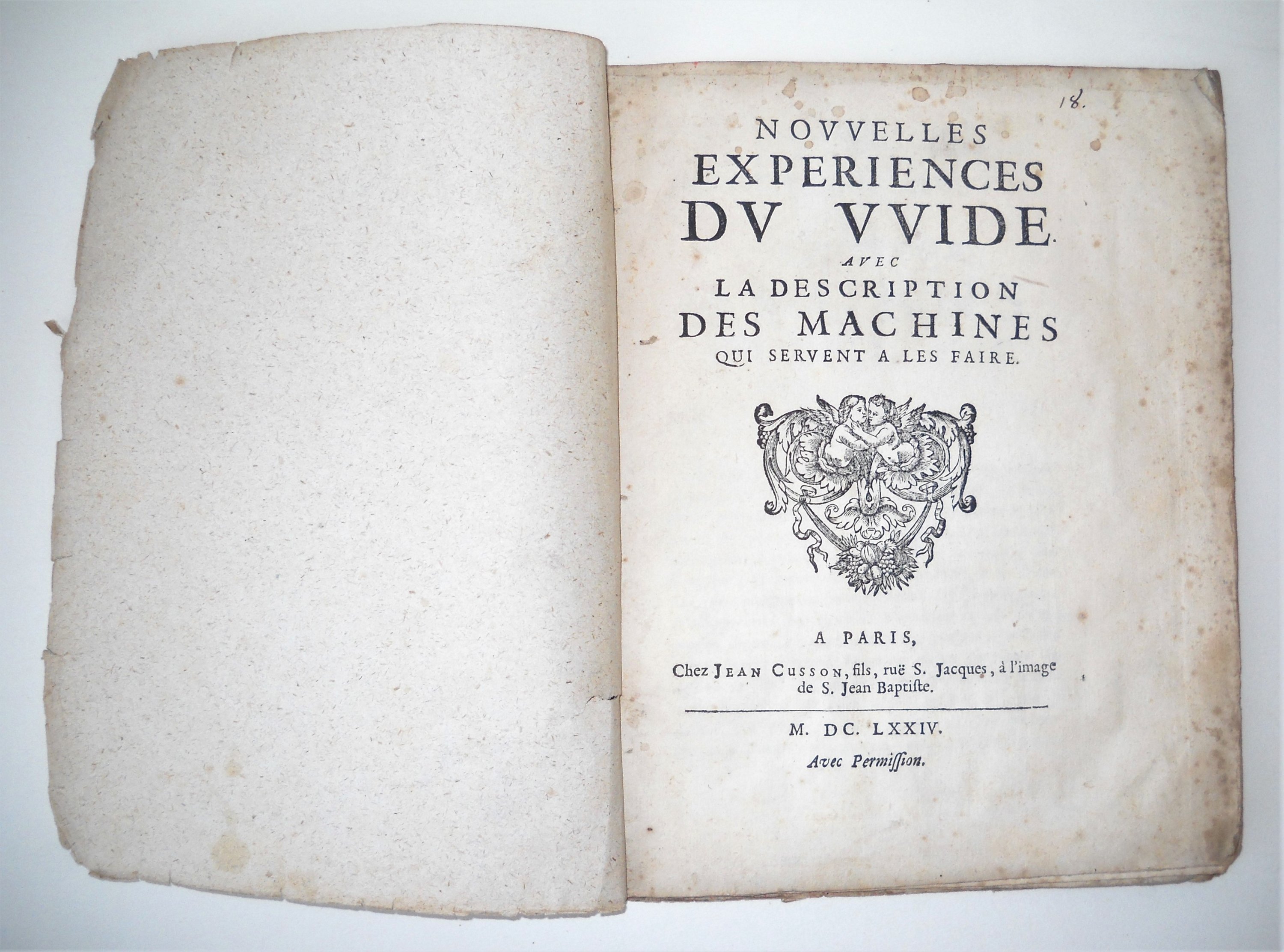 Nouvelles expériences du vuide avec la description des machines qui servent à les faire, Paris, Jean Cusson, 1674, in-4, 28 pp. (mouillures, rousseurs).