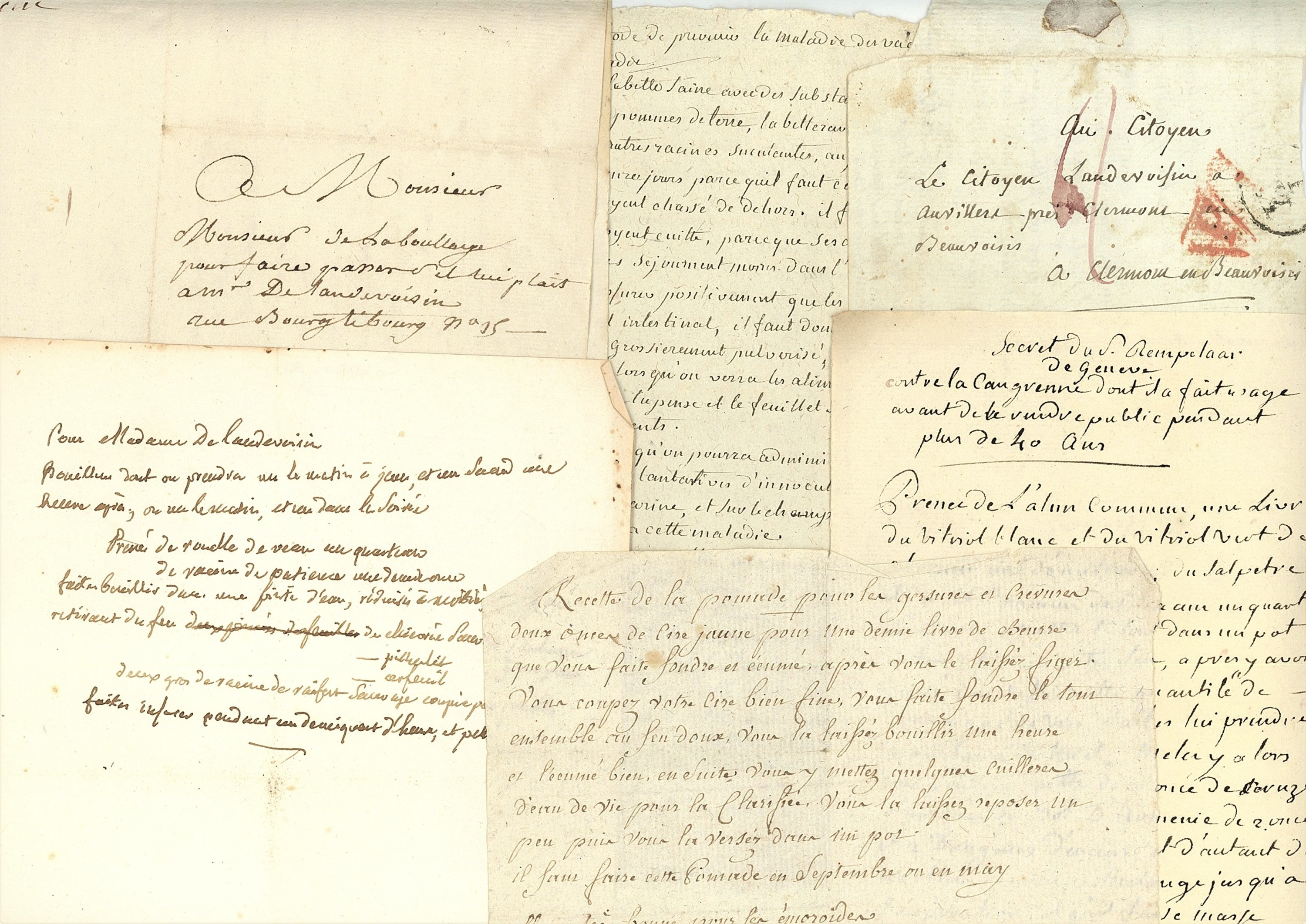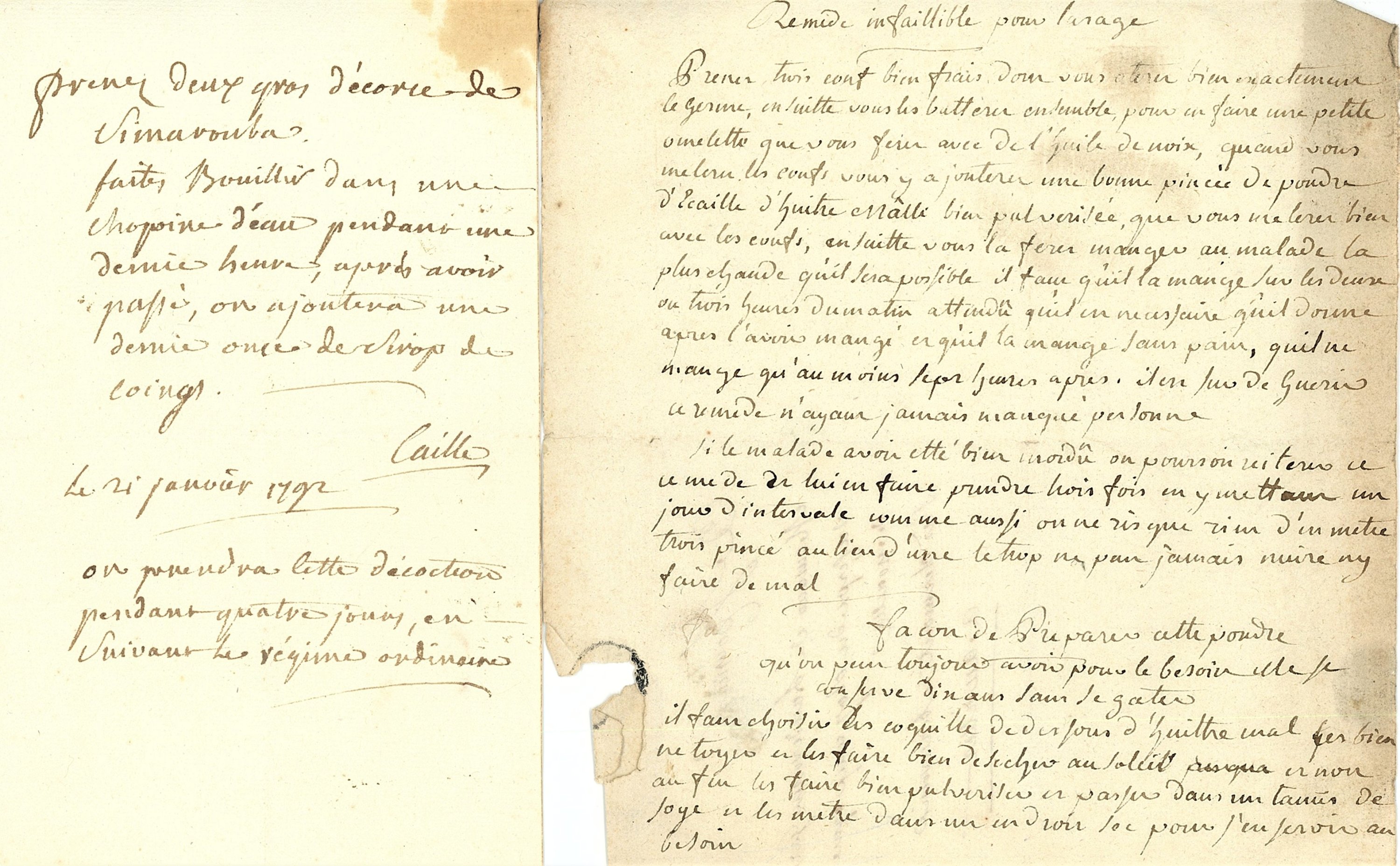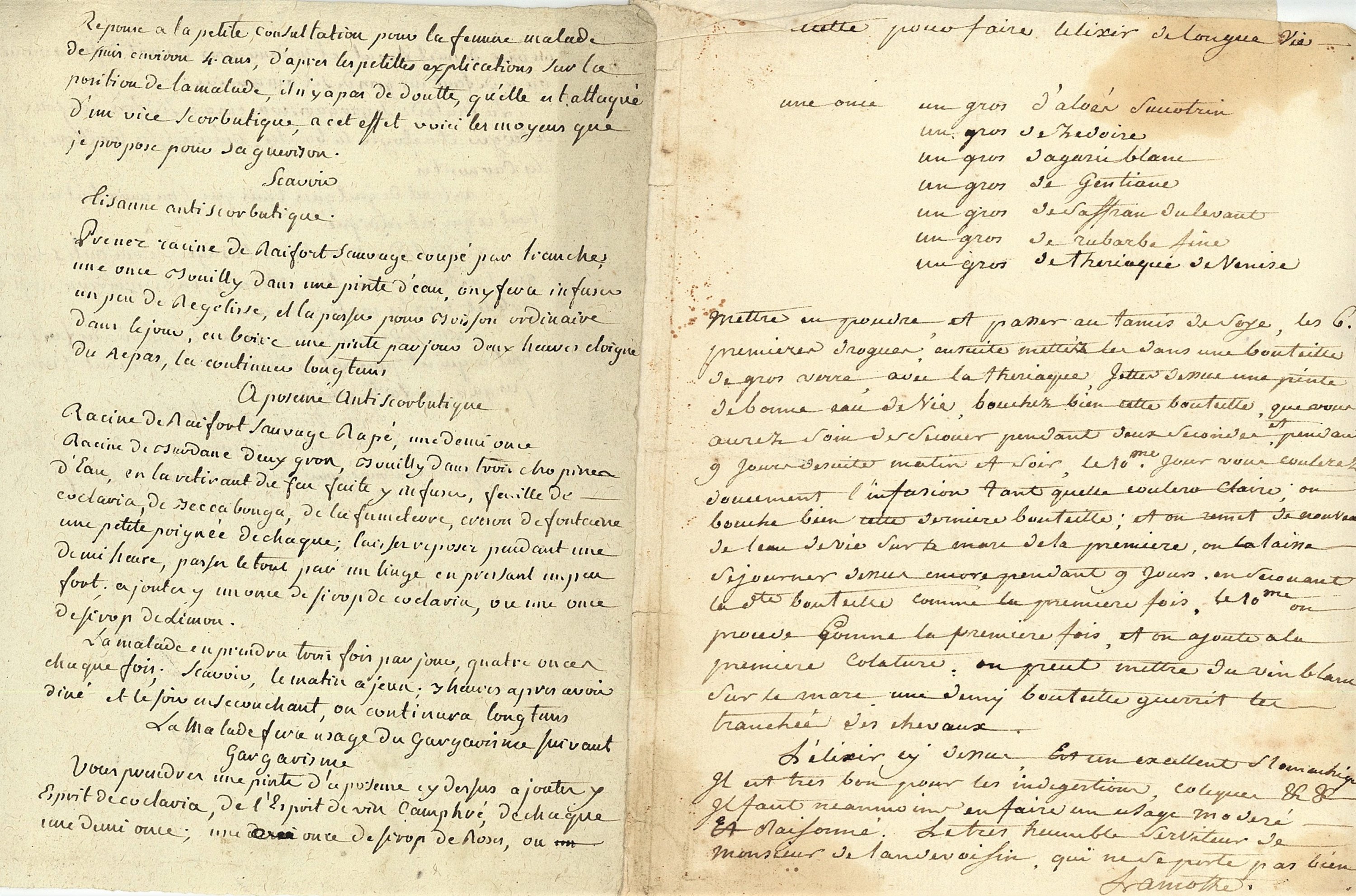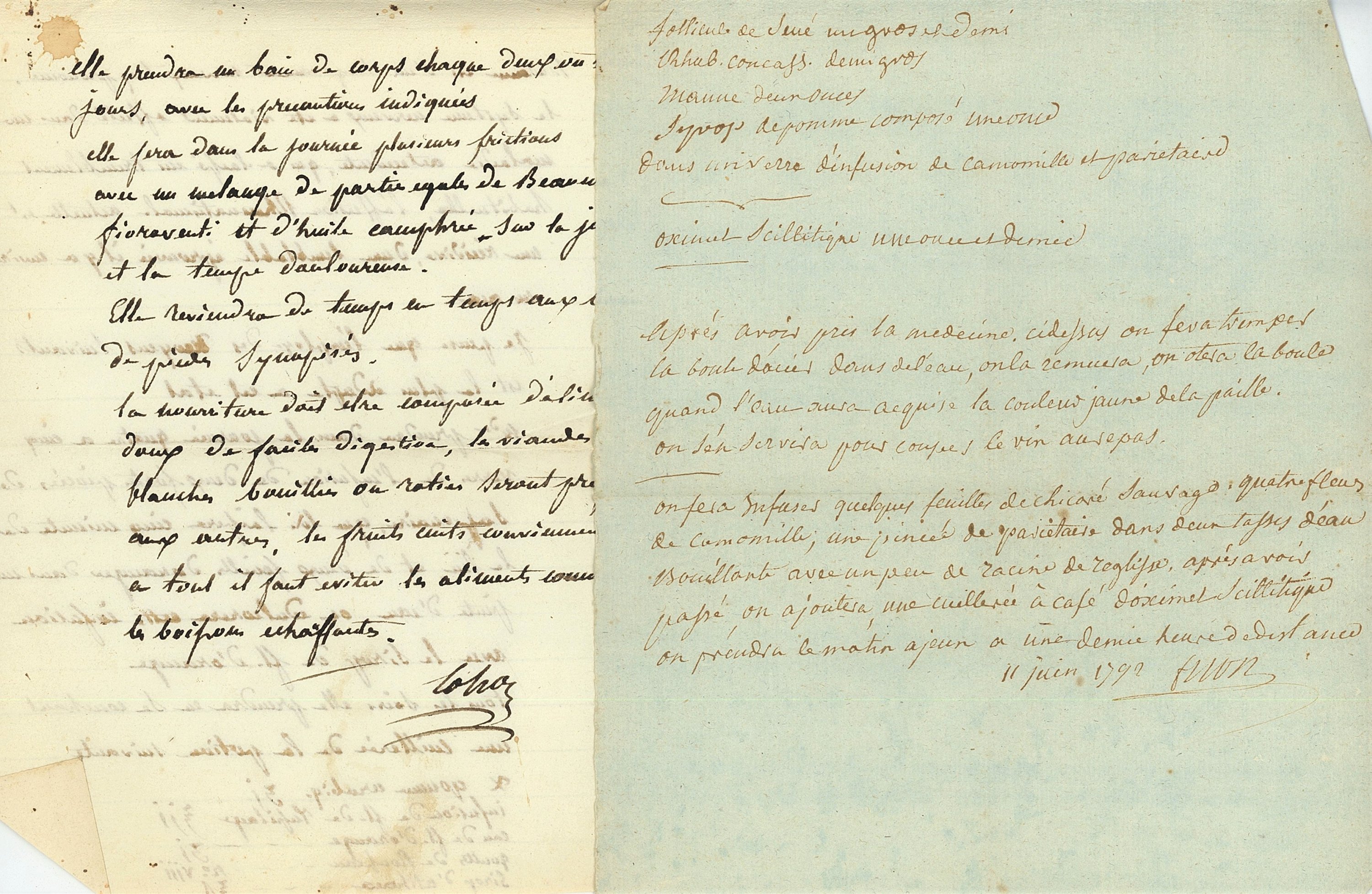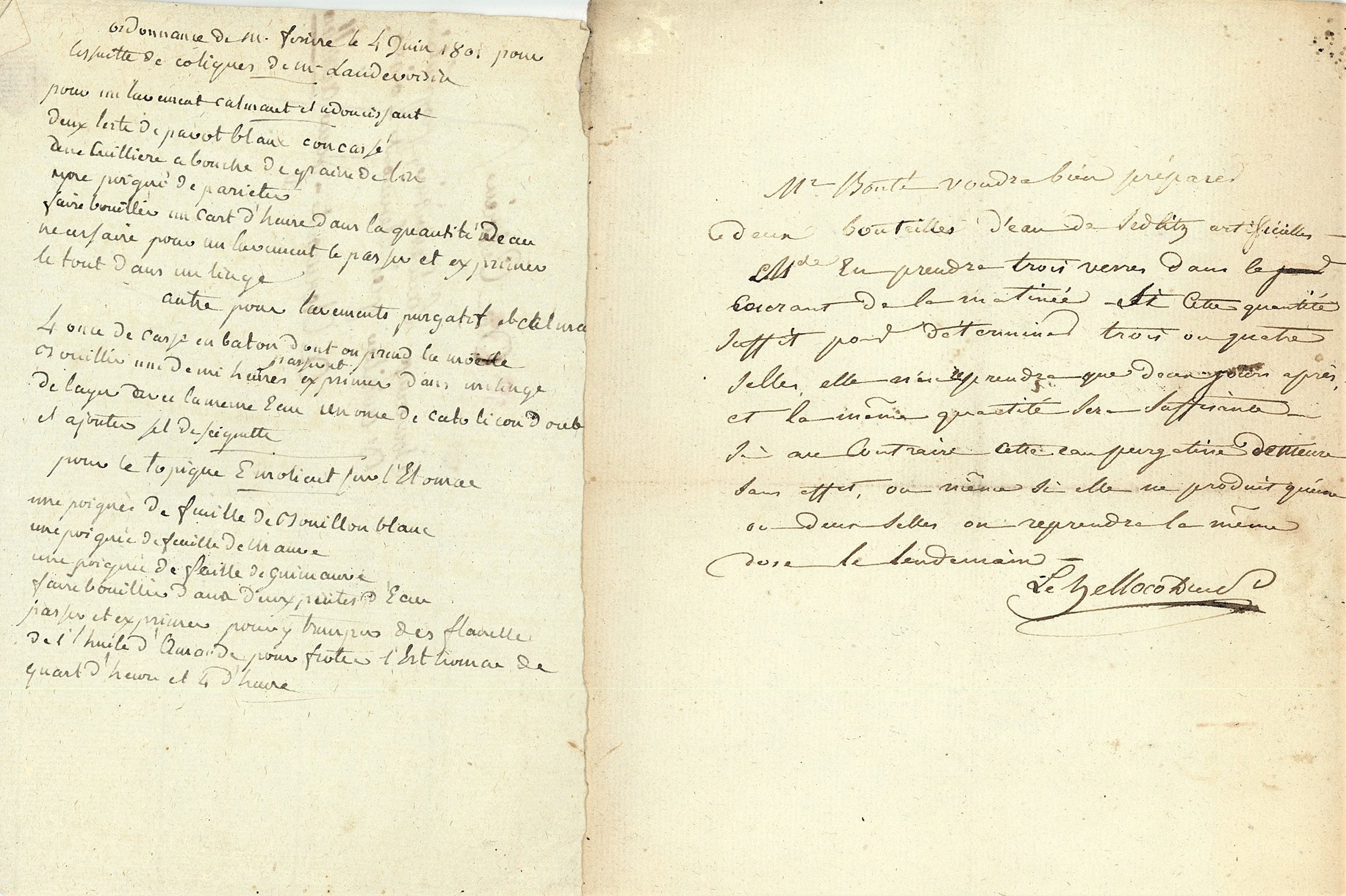 Lot de + de 60 pièces manuscrites, fin du 18e et début du 19e siècle, formats divers, adressées à la famille Soucanye de Landevoisin au château dAuvillers (Neuilly-sous-Clermont) prescriptions et recommandations médicales, certaines écrites par des praticiens de Liancourt et alentours (Oise) tels que le docteur Lehelloco, Lohon, Carré, etc. Ordonnances pour soigner les coliques, les rhumastismes, la gangrène, bouillons apéritifs propres à guérir les obstructions, remède infaillible pour la rage