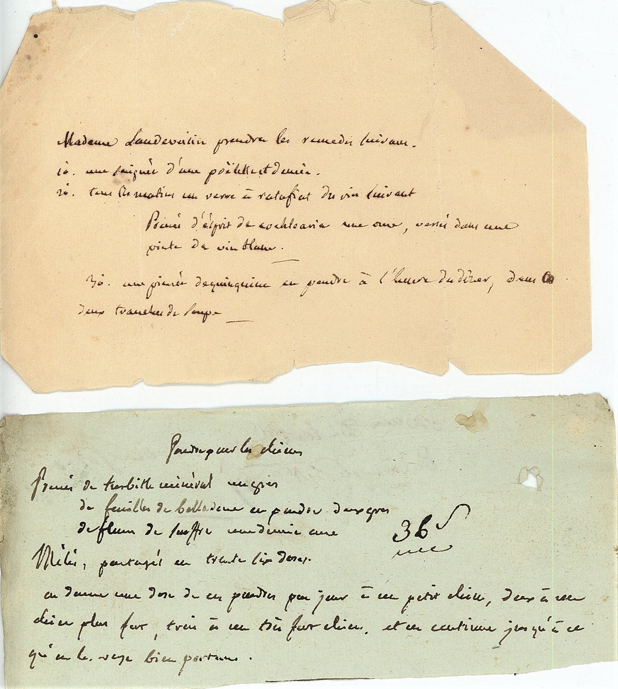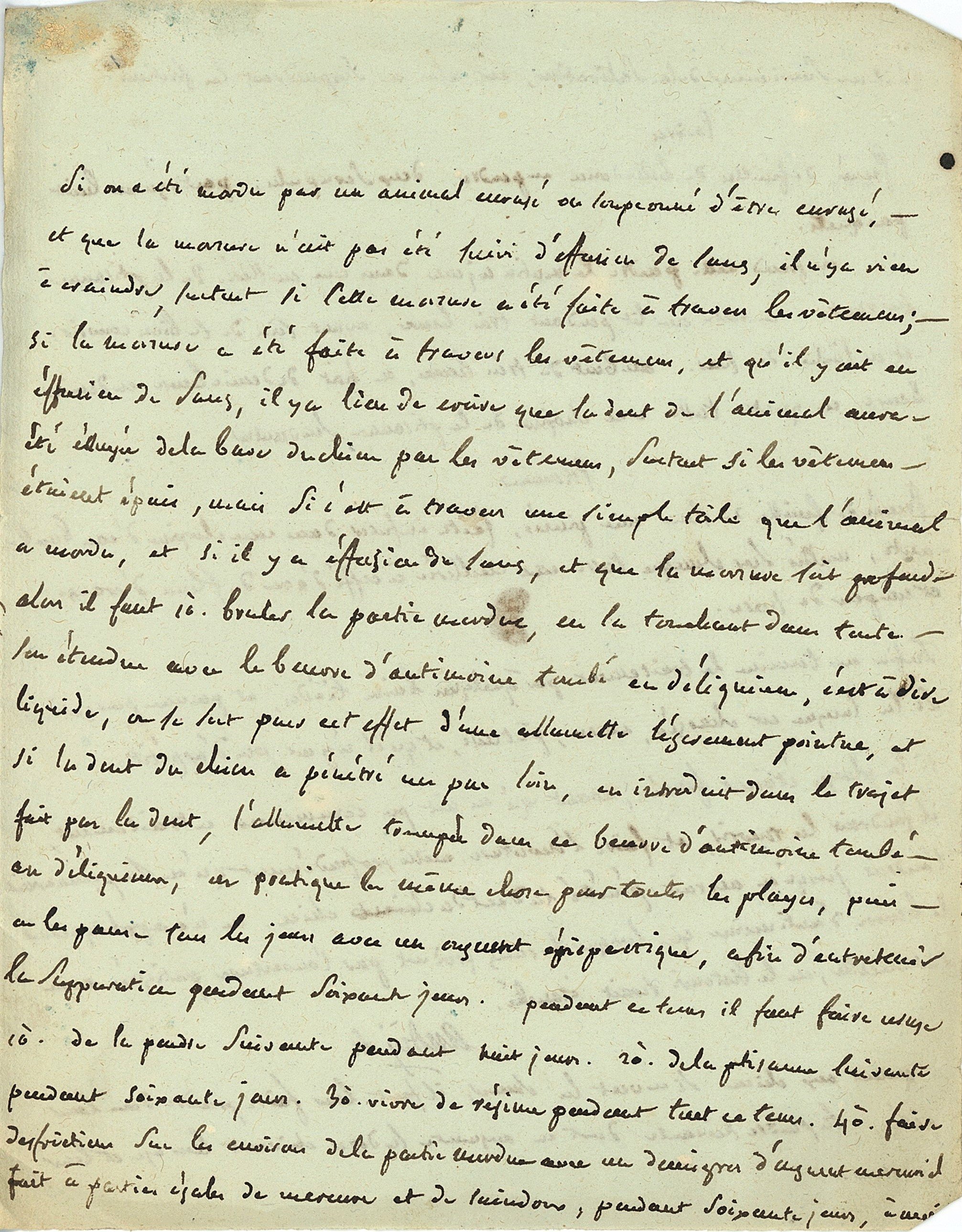 Réunion de 1 L.A.S. et de 5 P.A., fin du 18e siècle, adressées à la famille Soucanye de Landevoisin au château d’Auvillers à Neuilly-sous-Clermont (Oise) ; prescriptions médicales dont intéressante L.A.S. sur la manière de réagir en cas de morsure par un animal enragé : « Si on a été mordu par un animal enragé ou soupçonné d’être enragé et que la morsure n’eut pas été suivi d’effusion de sang, il n’y a rien à craindre, surtout si cette morsure a été faite à travers les vêtemens ; si la morsure a été faite à travers les vêtemens, et qu’il y ait eu effusion de sang, il y a lieu de croire que la dent de l’animal aura été essuyée de la bave du chien par les vêtemens (…) mais si c’est à travers une simple toile que l’animal a mordu, et s’il y a effusion de sang, et que la morsure soit profonde alors il faut 1/ bruler la partie mordue, en la touchant dans toute son étendue avec le beure d’antimoine… »