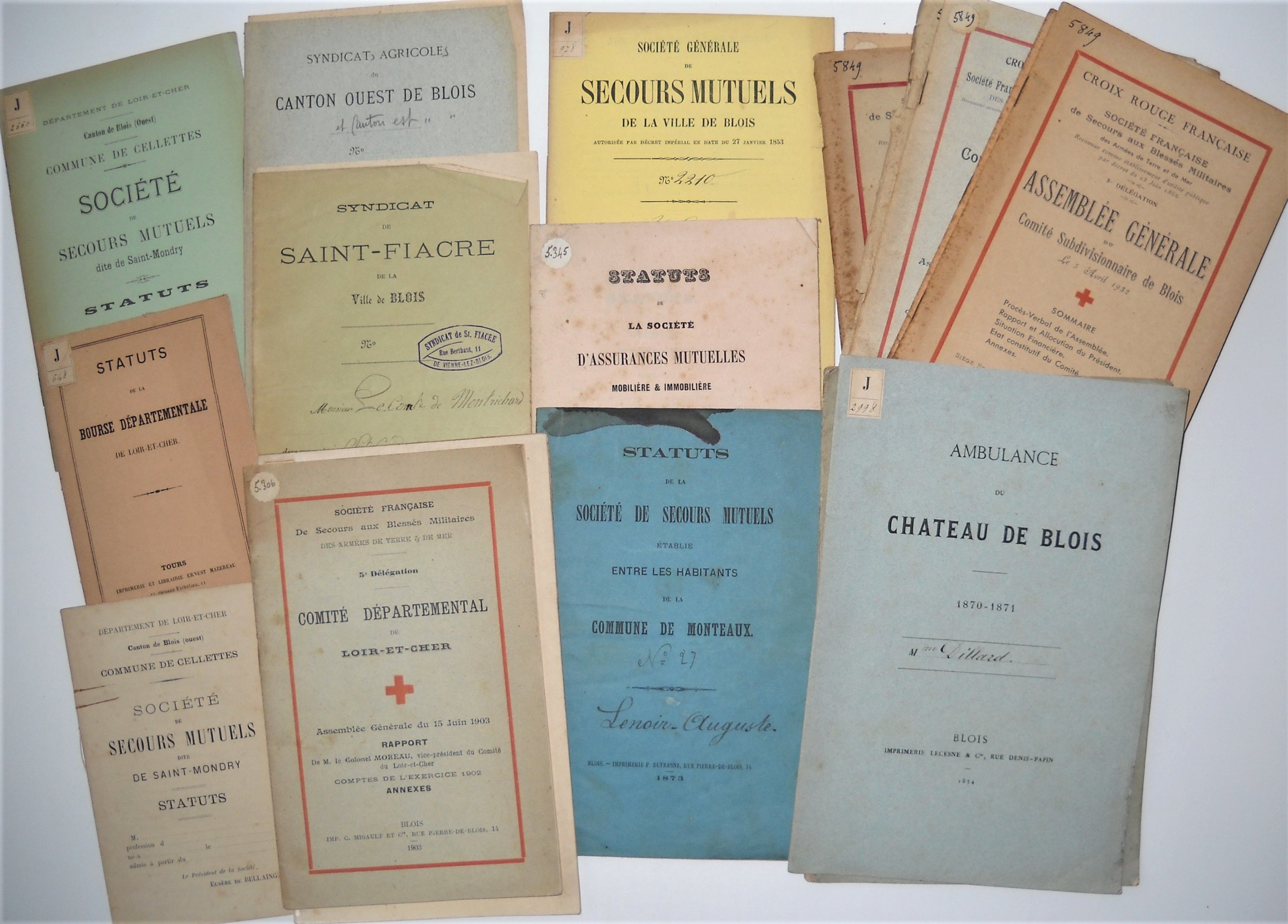 21 opuscules : Ordonnance du roi et statuts de la compagnie dassurance mutuelle contre lincendie pour le département de Loir-et-Cher, Blois, Veuve Jahyer, 1821 ; Statuts et règlements de la société de secours mutuels de St Joseph établie à Blois, 1866 ; Société de secours mutuels de la ville de Blois (femmes) dite Société de Notre-Dame-des-Aydes, 1880 ; Société générale de secours mutuels de la paroisse des Grouëts de Blois, 1872 ; Statuts des sociétés de secours mutuels de Monteaux, Cellettes, Mesland ; etc.