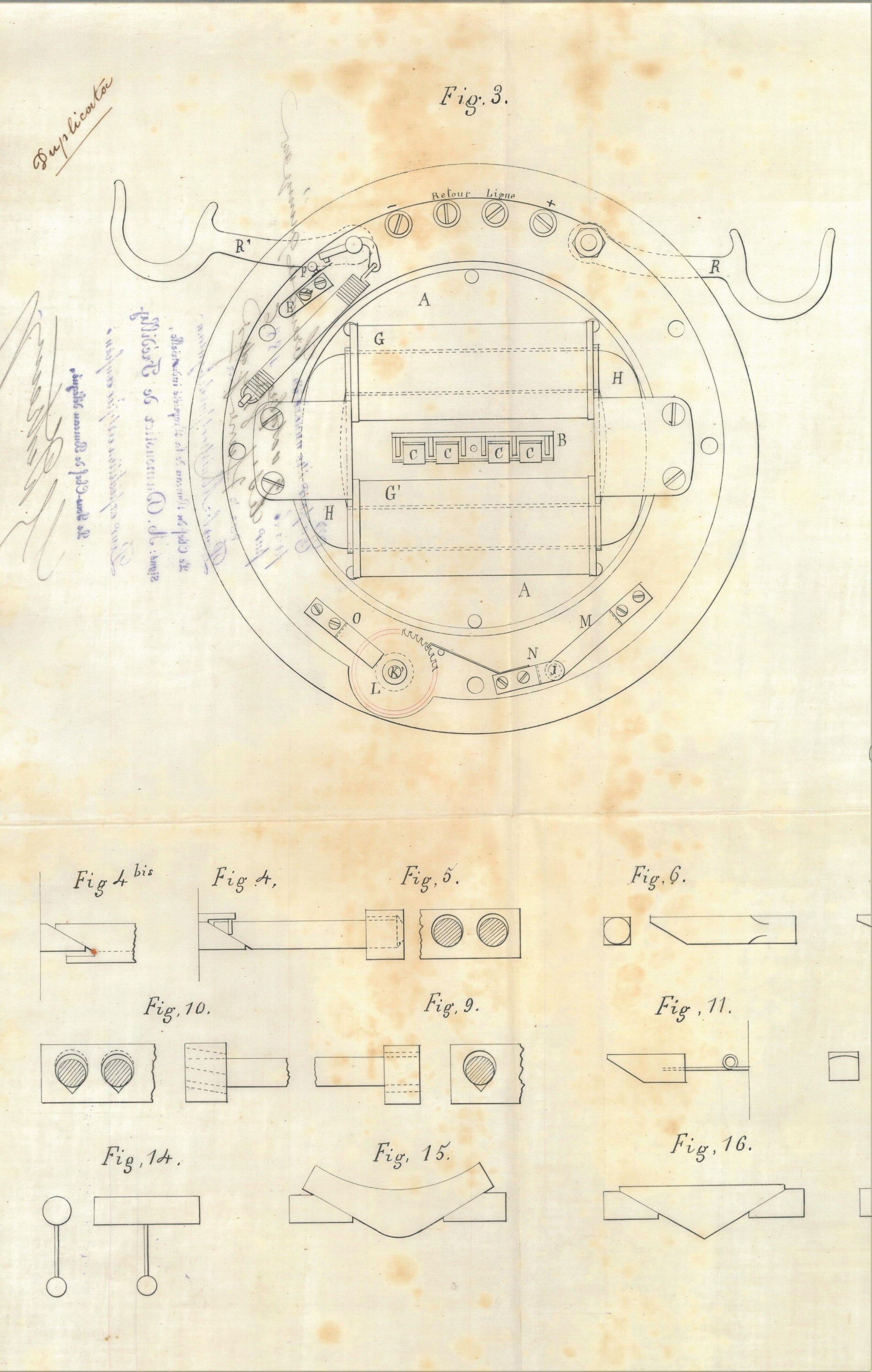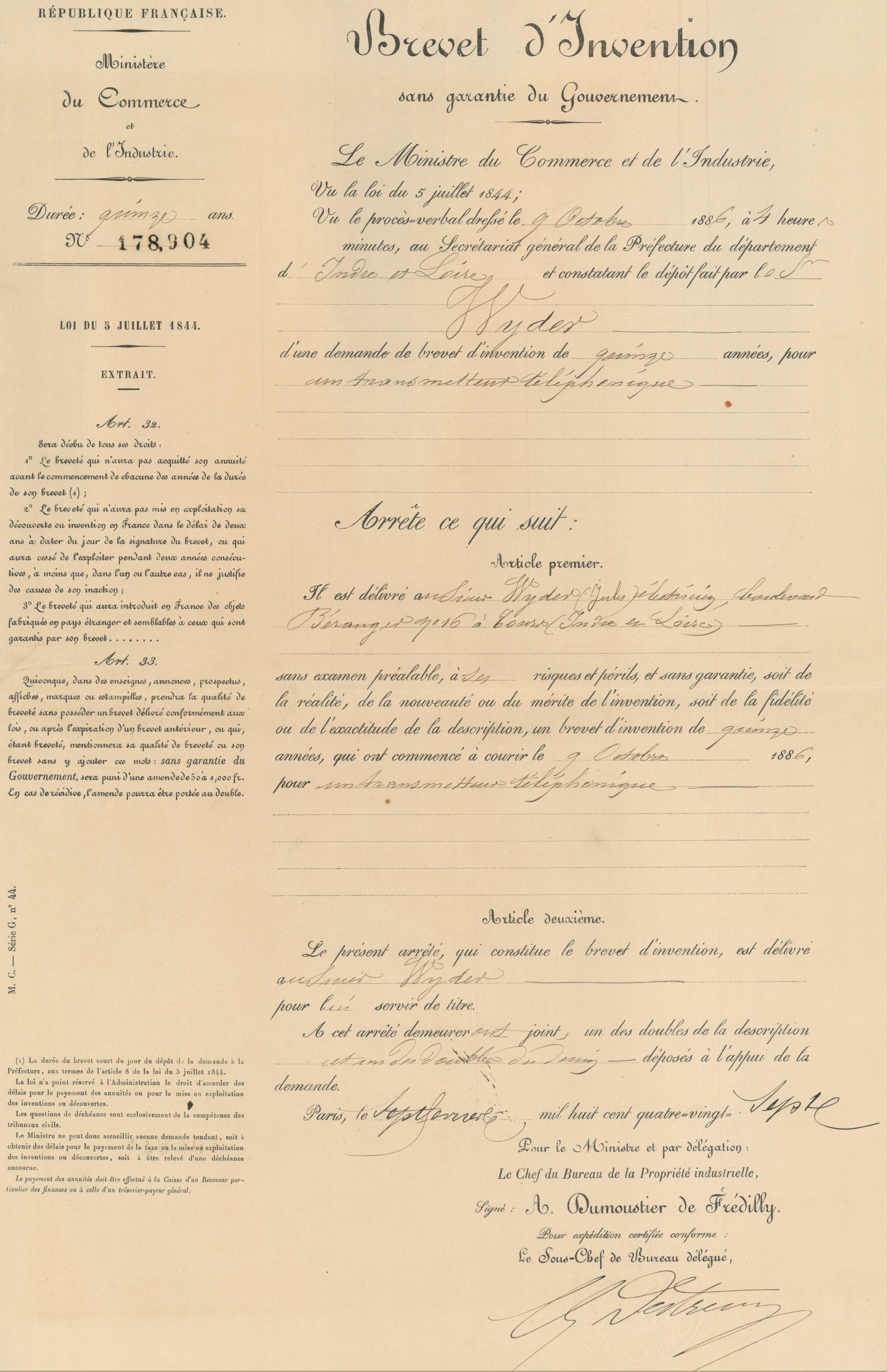 Réunion de 7 documents manuscrits, tous formats, relatifs au brevet d’invention d’un transmetteur téléphonique déposé en 1886 par Jules Wyders, électricien, boulevard Béranger à Tours, dont le brevet officiel déposé le 9 octobre 1886 avec notice détaillée et croquis, ébauches de dessins et calque.