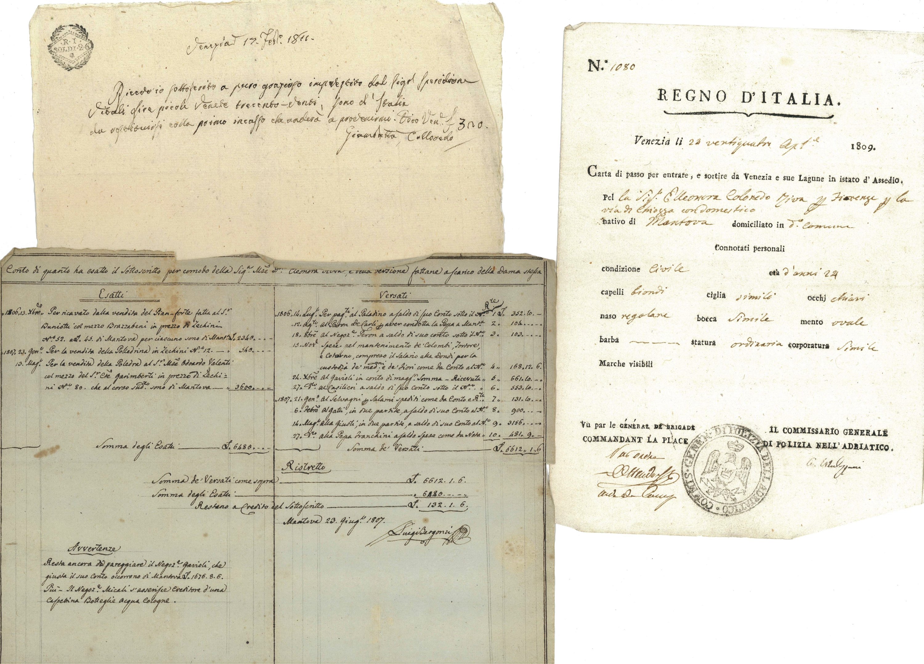Correspondances, factures, notes appartenant à Spiro Vitali (1782-1852) et à son épouse Eleonora di Colloredo provenant de familles de la noblesse italienne (Guerrieri Gonzaga, Nerli), fournisseurs, orfèvres, hommes daffaires, etc, de Milan, Florence, Venise, Brescia. Dont deux diplômes de linstitut de jeunes filles Maria Luisa à Lucques (ex-institut Elisa Bonaparte), passeport, etc.