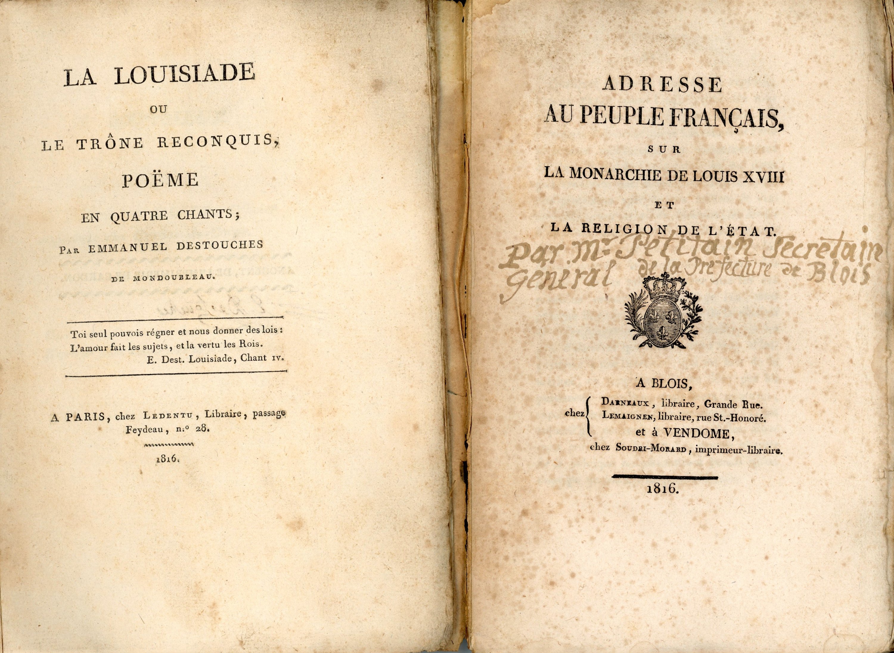 Emmanuel Destouches (de Mondoubleau), La Louisiade ou le trône reconquis, poëme en quatre chants, Paris, Ledentu, 1816 ;
