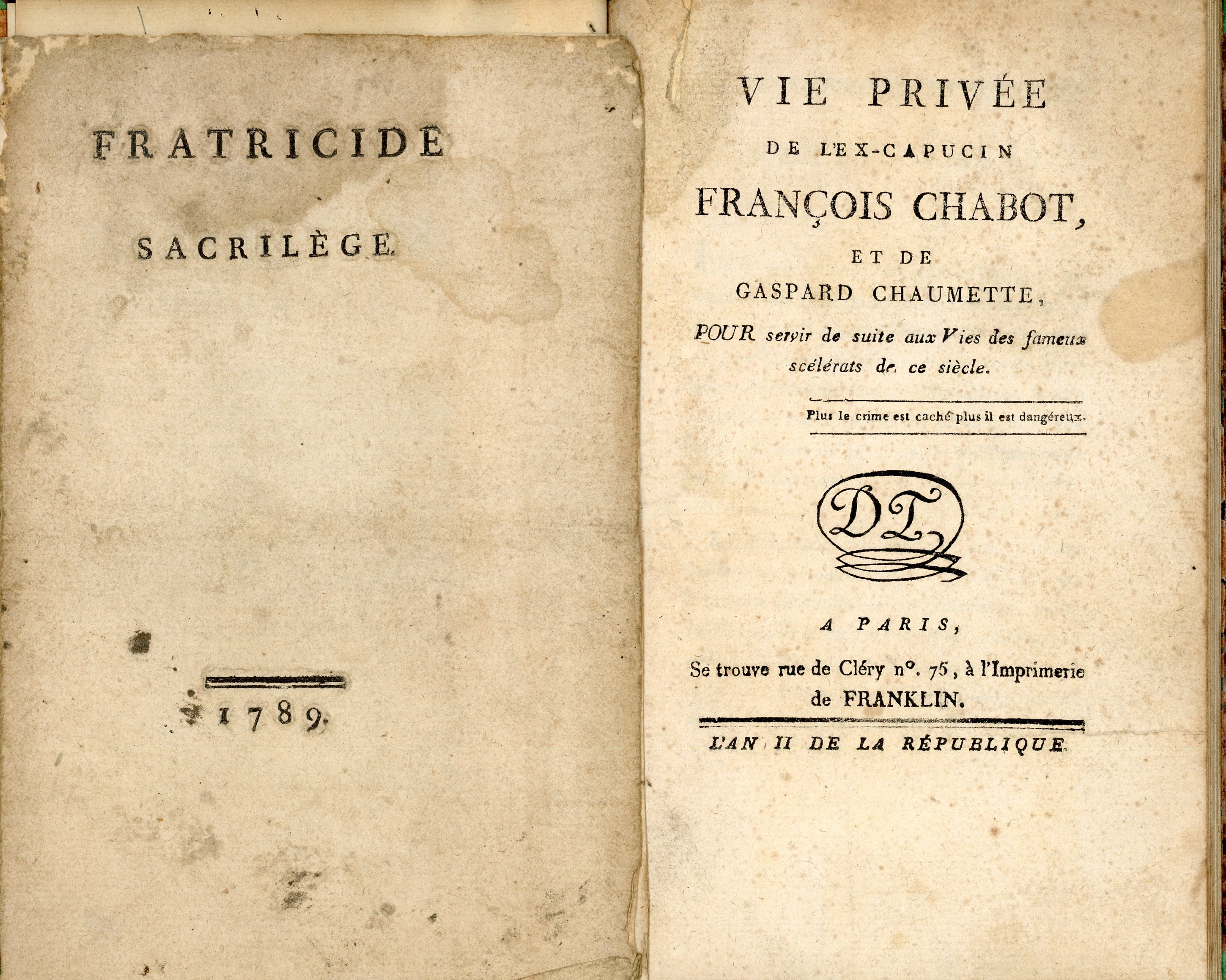 Vie privée de lex-capucin François Chabot, et de Gaspard Chaumette, pour servir de suite aux Vies des fameux scélérats de ce siècle, À Paris, se trouve rue de Cléry n° 75, à lImprimerie de Franklin, lAn II de la République (1794), in-8 rel., vi-43-16 pp. ; Édition originale de ce virulent pamphlet contre Chabot et Chaumette, victimes tous deux de la guillotine.