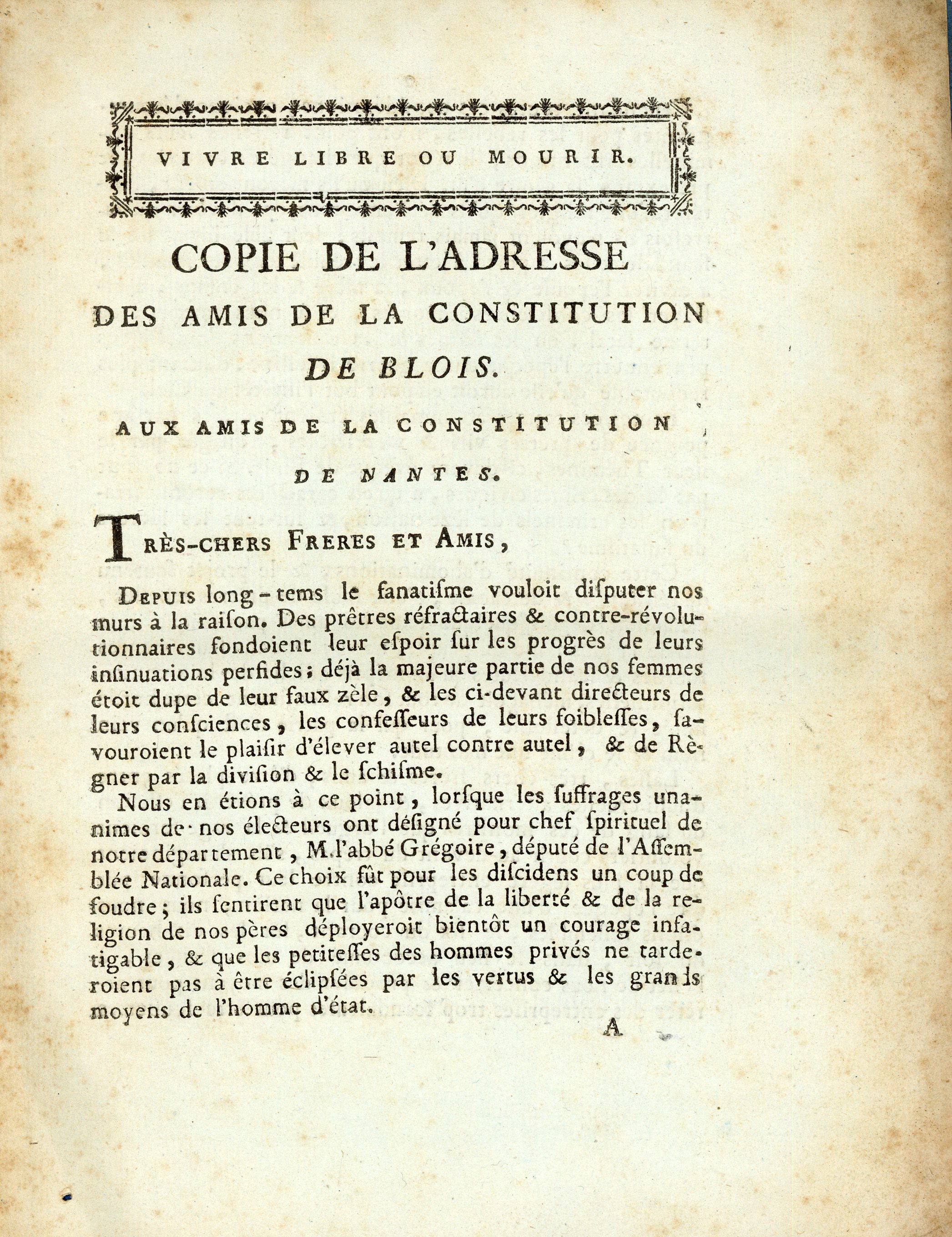 Vivre libre ou Mourir ; Copie de ladresse des Amis de la Constitution de Blois aux Amis de la Constitution de Nantes, Blois, J.P.J. Masson, 1791, in-4, 4 pp. ;