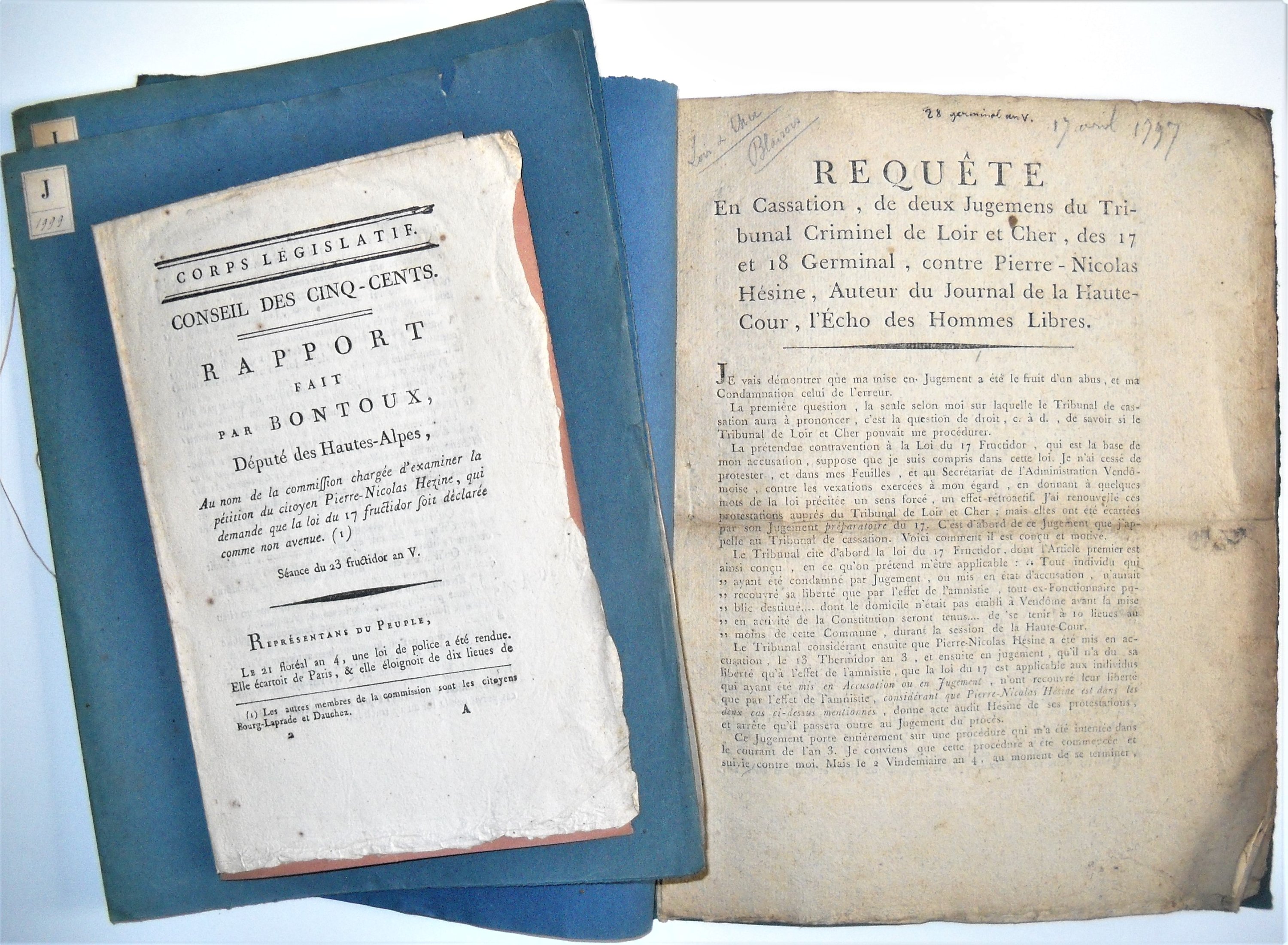 , Paris, impr. nationale, 8 pp. in-8 ; Le Censeur des Journaux, n°13 du 4 octobre 1796, n°80 du 20 frimaire an V et n°106 du 5 janvier 1797 ; Requête en cassation de deux jugemens du tribunal criminel de Loir-et-Cher des 17 et 18 germinal contre Pierre-Nicolas Hésine, auteur du journal de la Haute-Cour, lEcho des Hommes Libres, Vendôme, impr. Cottereau-Pinçon, 1797, 11 pp. in-4 ;