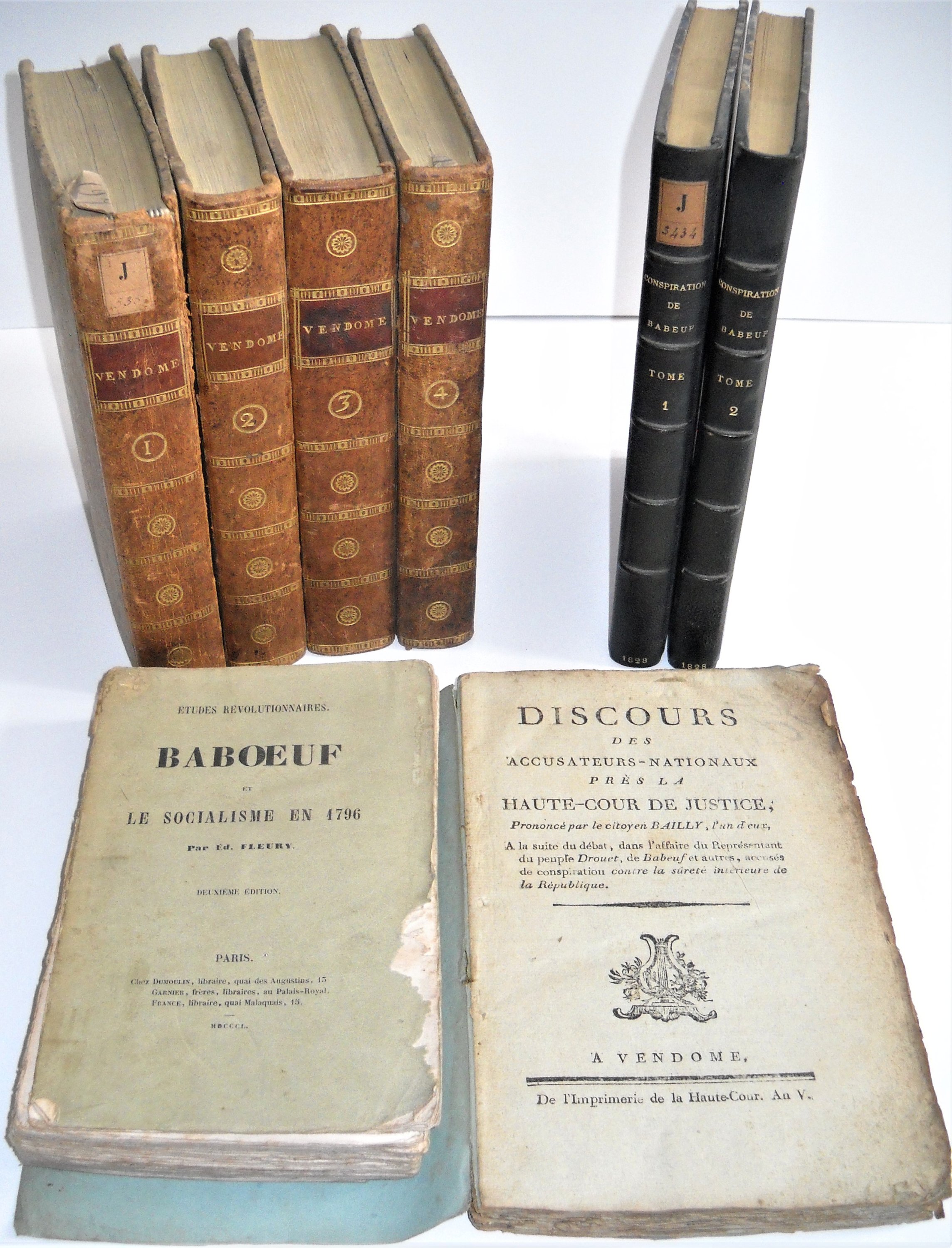 Philippe Buonarroti, Conspiration pour l'égalité dite de Babeuf, suivie du procès auquel elle donna lieu, et des pièces justificatives, etc, 2 tomes, Bruxelles, Librairie romantique, 1828, 2 vol. in-8 de viii-325 pp. et (4)-327 pp., rel. demi-chagrin, dos à nerfs, édition originale. Bon exemplaire. Qqs rousseurs ; Ed. Fleury, Baboeuf et le socialisme en 1796 - Etudes révolutionnaires, 2e édition, Paris, 1850, br. in-12, 352 pages (rousseurs, en létat).