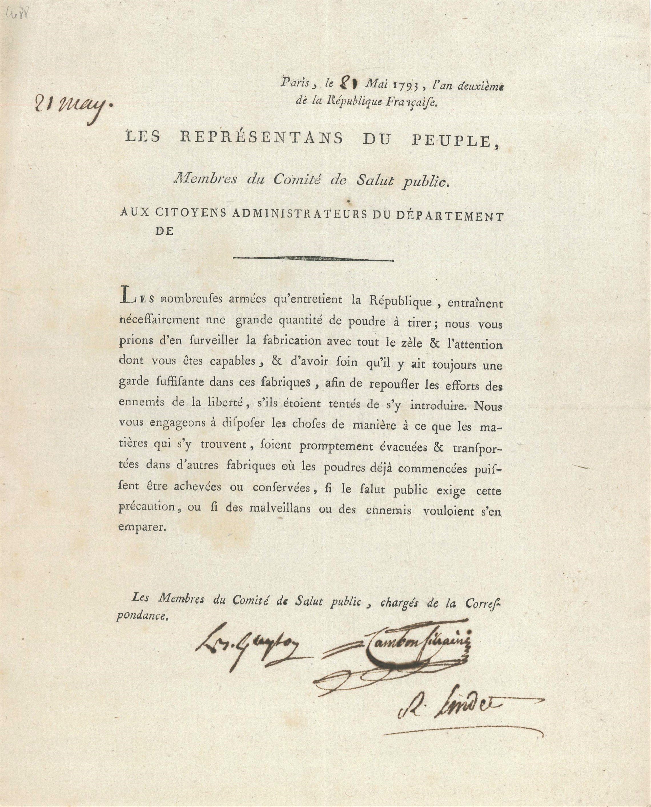 P.S., Paris, 21 mai 1793, instruction imprimée, 1 page in-4, relative à la surveillance de la poudre à canon, signée à la plume par trois membres du Comité de Salut Public : Pierre-Joseph Cambon (1756-1820) président du comité des finances ; Louis-Bernard Guyton-Morveau (1737-1816) chimiste qui démissionne du Comité le 10 juillet 1793 pour se consacrer à la fabrication de canons et à la formation dune compagnie daérostiers ; Robert Lindet (1746-1825) en charge de la correspondance.