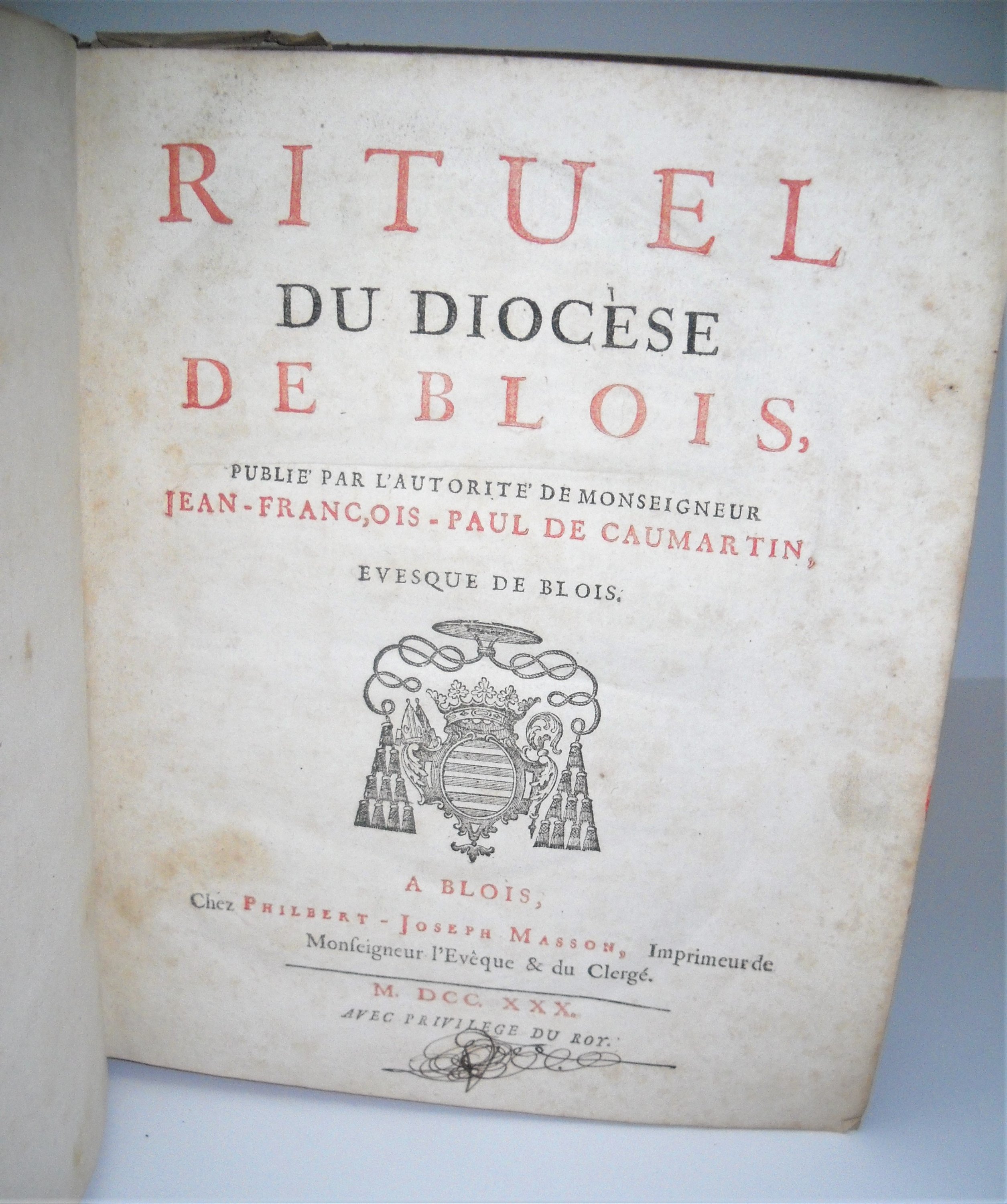 • Rituel du diocèse de Blois, publié par l’autorité de monseigneur Jean-François-Paul de Caumartin, évesque de Blois., Blois, Philbert Joseph Masson, 1730, in-4, (16 ff.)-598 pp., rel. veau brun marbré, (défauts d’usage à la couv., épidermures) ; L’année 1730 est une année de réforme dans le diocèse de Blois conduite par Jean François Paul de Caumartin évêque de Blois : élaboration d’un nouveau rituel rédigé en termes simples pour son diocèse dans le but d’y établir une discipline uniforme dans l’administration des sacrements et autres cérémonies, tenue d’un nouveau synode, saint Louis remplace saint Solenne comme patron de la cathédrale le 9 juillet 1730 ;