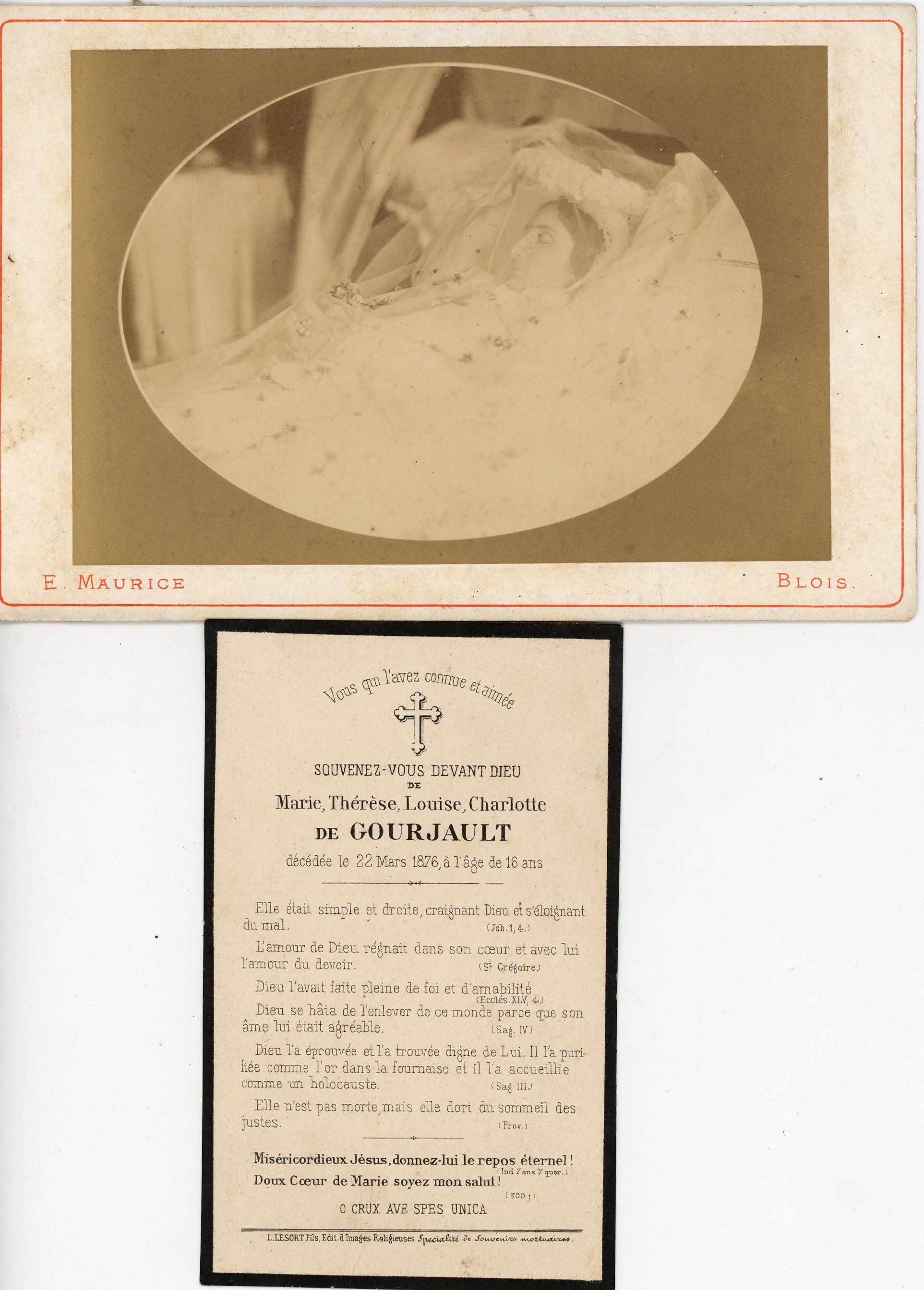 JOINT : Photographie de Marie Thérèse Louise Charlotte de Gourjault sur son lit de mort, 1876.