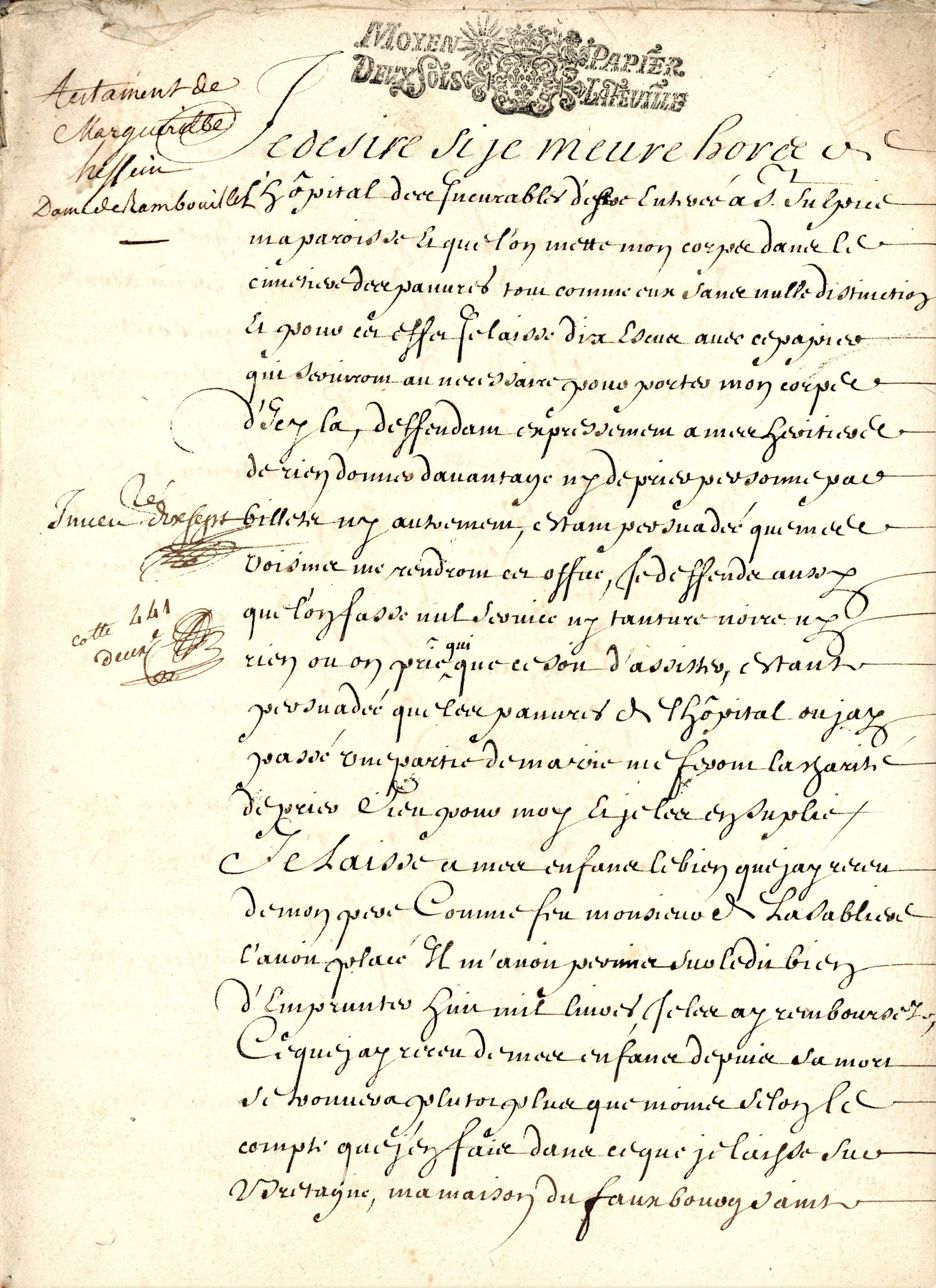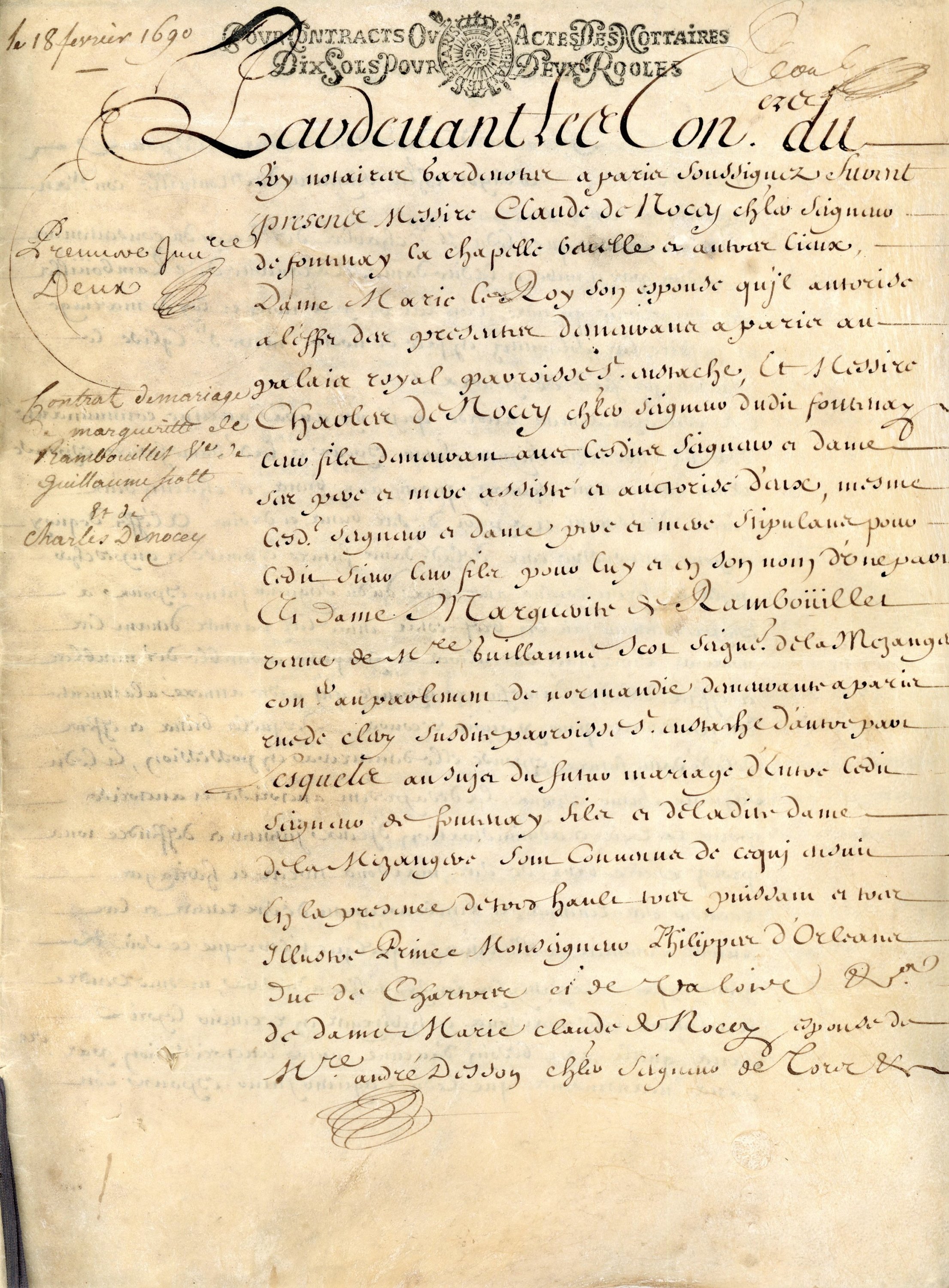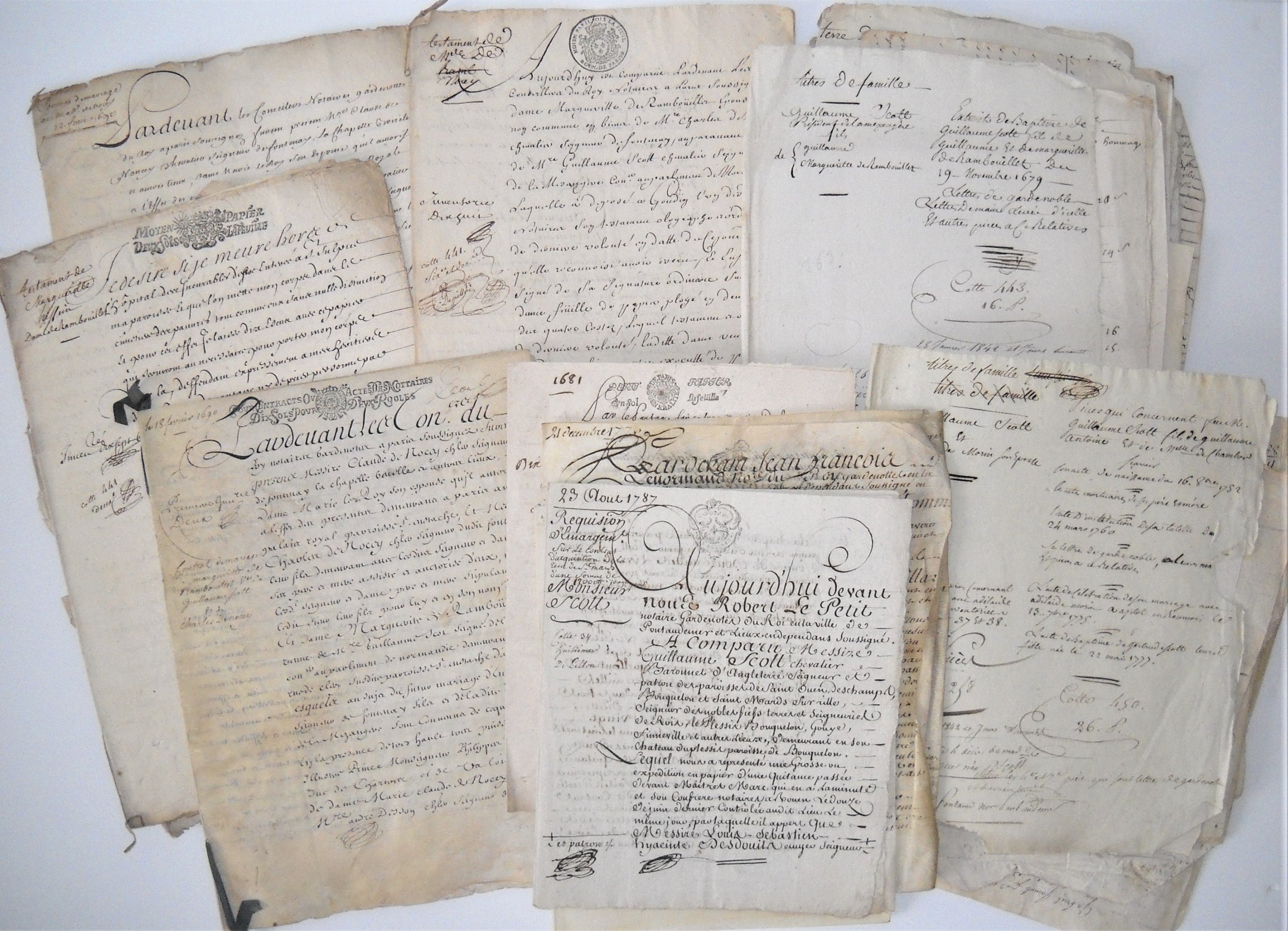 Lot de + de 55 pièces manuscrites, papier et parchemin, formats divers, dont copie du : testament de Marguerite Hessein, dame de la Sablière (1640-1693), célèbre salonnière de la Folie-Rambouillet et muse de Jean de la Fontaine, 8 janvier 1693 ; du contrat de mariage entre Marguerite de Rambouillet et Charles de Nocé chevalier seigneur de Fontenay, 18 février 1690 ; du testament de Marguerite de Rambouillet, épouse en secondes noces de Charles de Nocé chevalier seigneur de Fontenay, et veuve de Messire Guillaume Scott chevalier seigneur de la Mésangère conseiller au parlement de Normandie à Rouen, 9 octobre 1714 ; acte de tutelle de Guillaume Scott de la Mésangère, enfant mineur (né à Bouquelon le 16 octobre 1752) de Guillaume Antoine Scott de la Mésangère et de Marie Anne Michel de Chambord, 24 mars 1760 ; actes de propriété de la seigneurie du Plessis à Bouquelon (Eure), 1649-1662 ; etc.