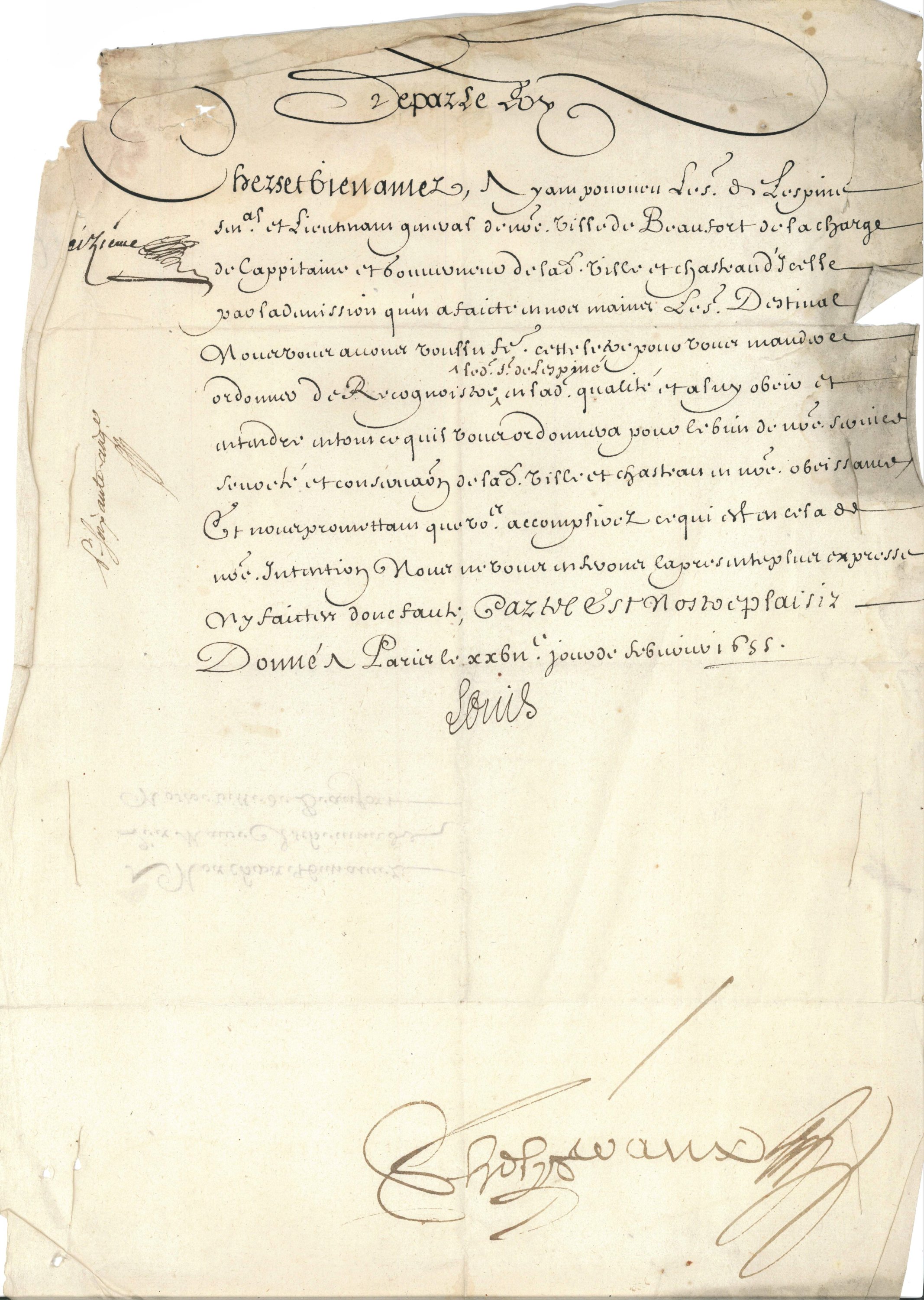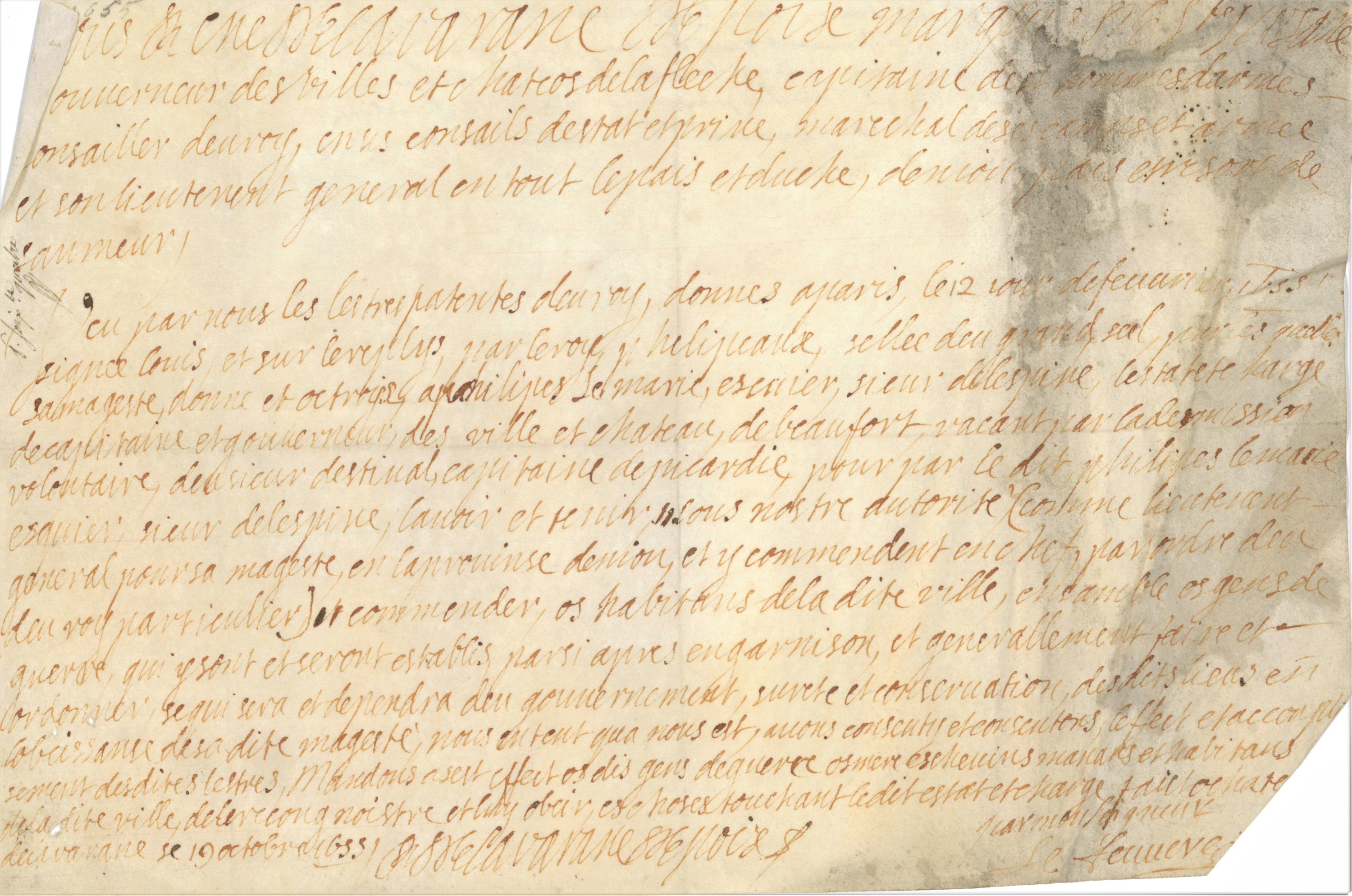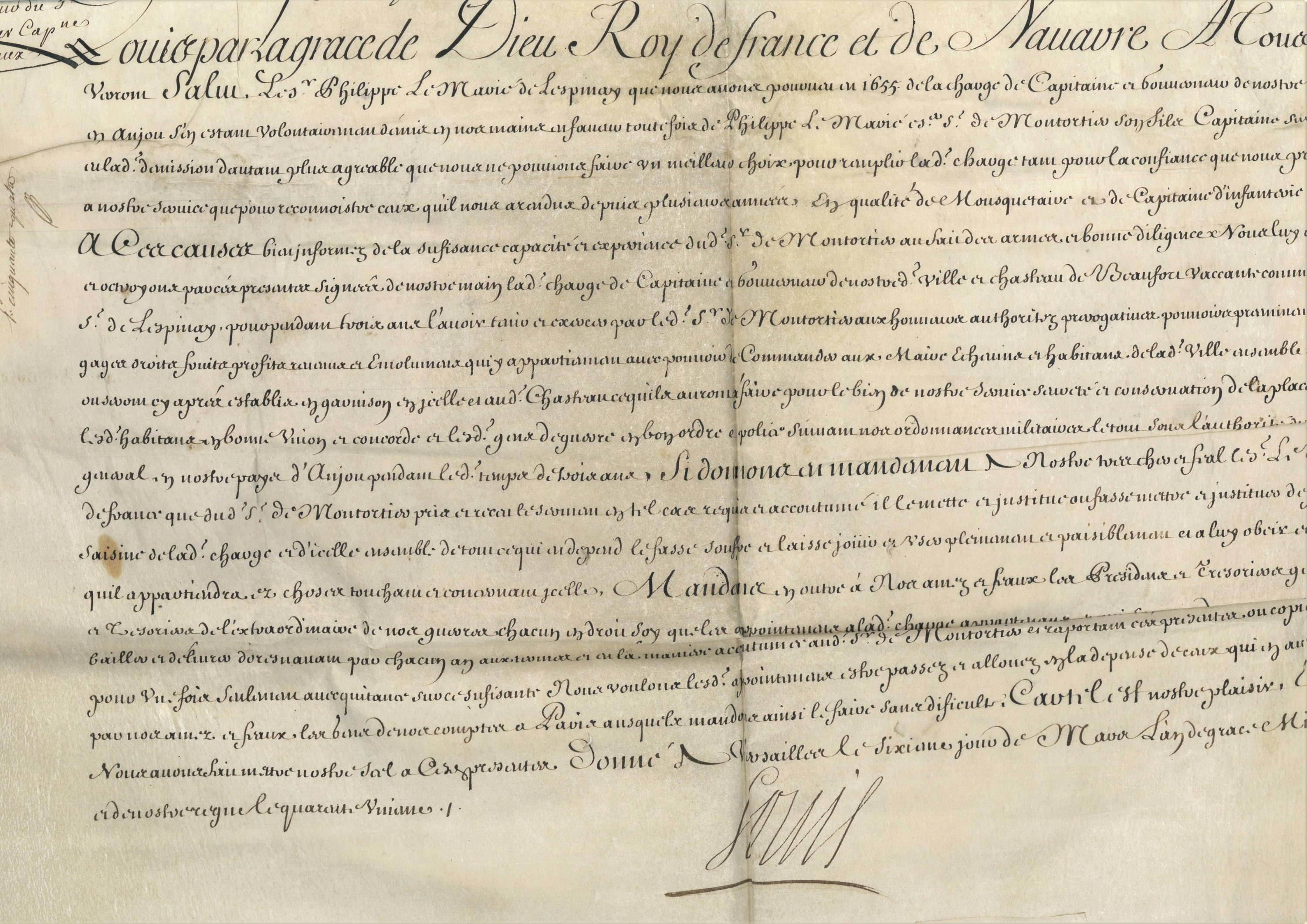 L.S., Paris, 27 février 1655, « Louis » et contresignée par Louis Phélypeaux de la Vrillière (1599-1681), secrétaire dÉtat, 1 page in-folio (accdts) ; Nomination de Philippe Le Marié, sénéchal et lieutenant général de la ville de Beaufort à la charge de capitaine et gouverneur de la ville et du château de Beaufort-en-Vallée ;