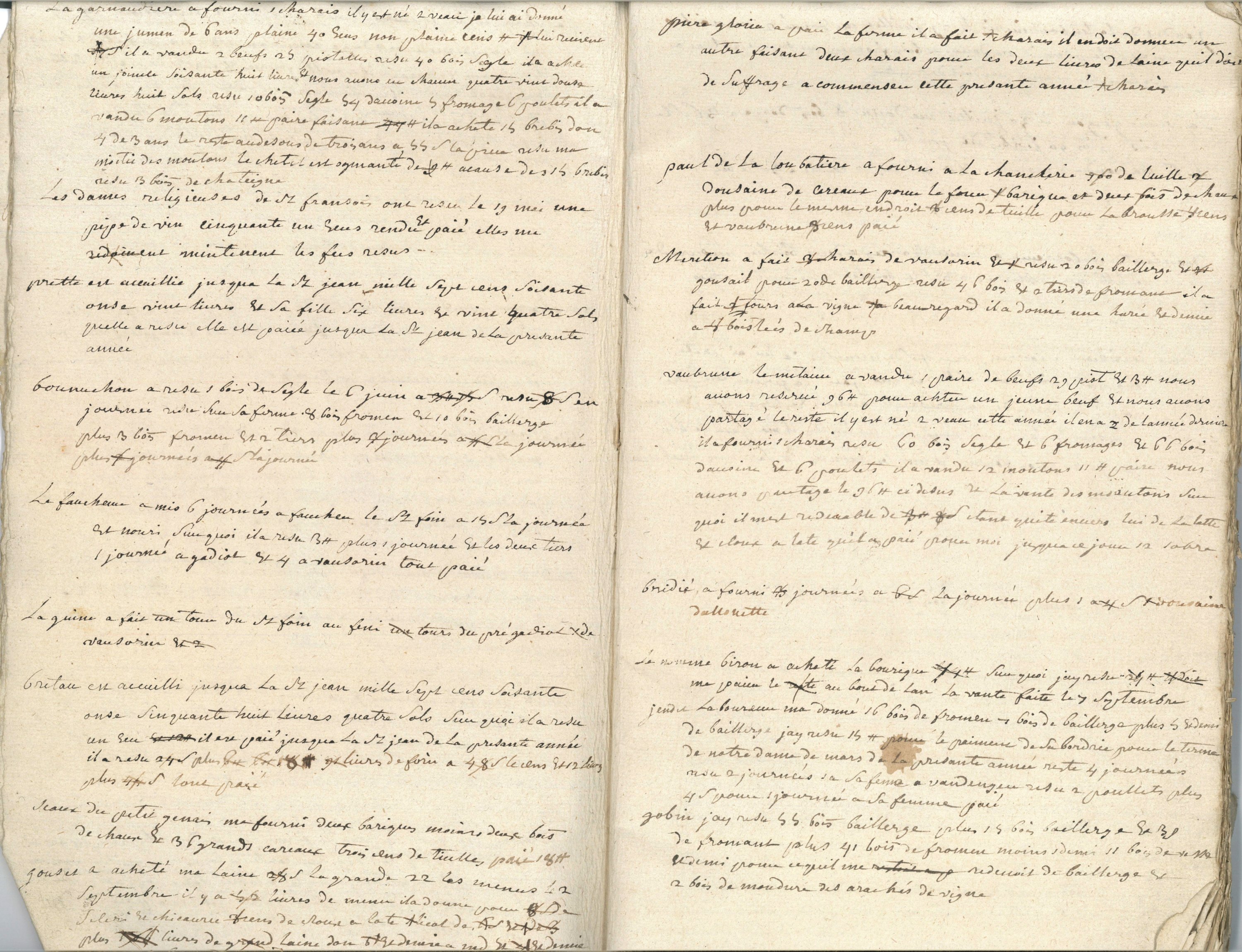 Cahier manuscrit anonyme, 1769-1775, 86 pages in-folio ; livre de comptes tenus par des régisseurs inscrivant les paiements des fermes et locatures, ventes de bleds, vins et bétails, des rentes dues, du coût de la main d’œuvre journalière, des travaux de maçonnerie, de ferronnerie, etc ; Concerne des exploitations agricoles des communes de Vasles et alentours (Deux-Sèvres et Vienne) : Vaubrune, la Giborlière, la Gourjaudière, la Bourie, etc.