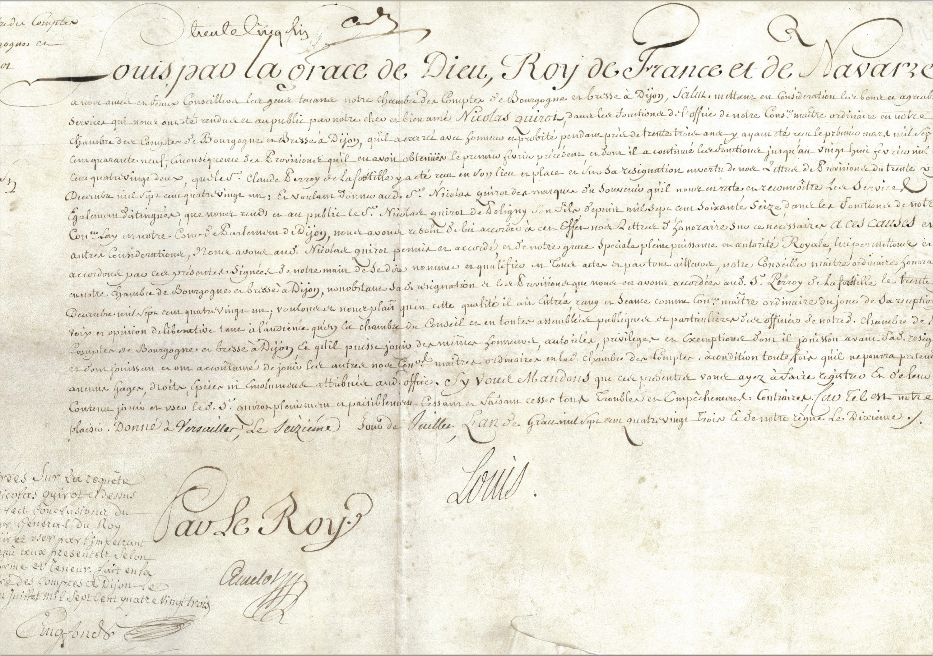 - P.S., Versailles, 16 juillet 1783, « Louis » (secrétaire) et contresignée par Antoine-Jean Amelot de Chaillou, secrétaire détat à la Maison du roi, parchemin oblong ; lettres de provision de conseiller du roi et maître ordinaire des comptes en la chambre de Bourgogne et de Bresse à Dijon accordées à Nicolas Quirot de Poligny le jeune ;
