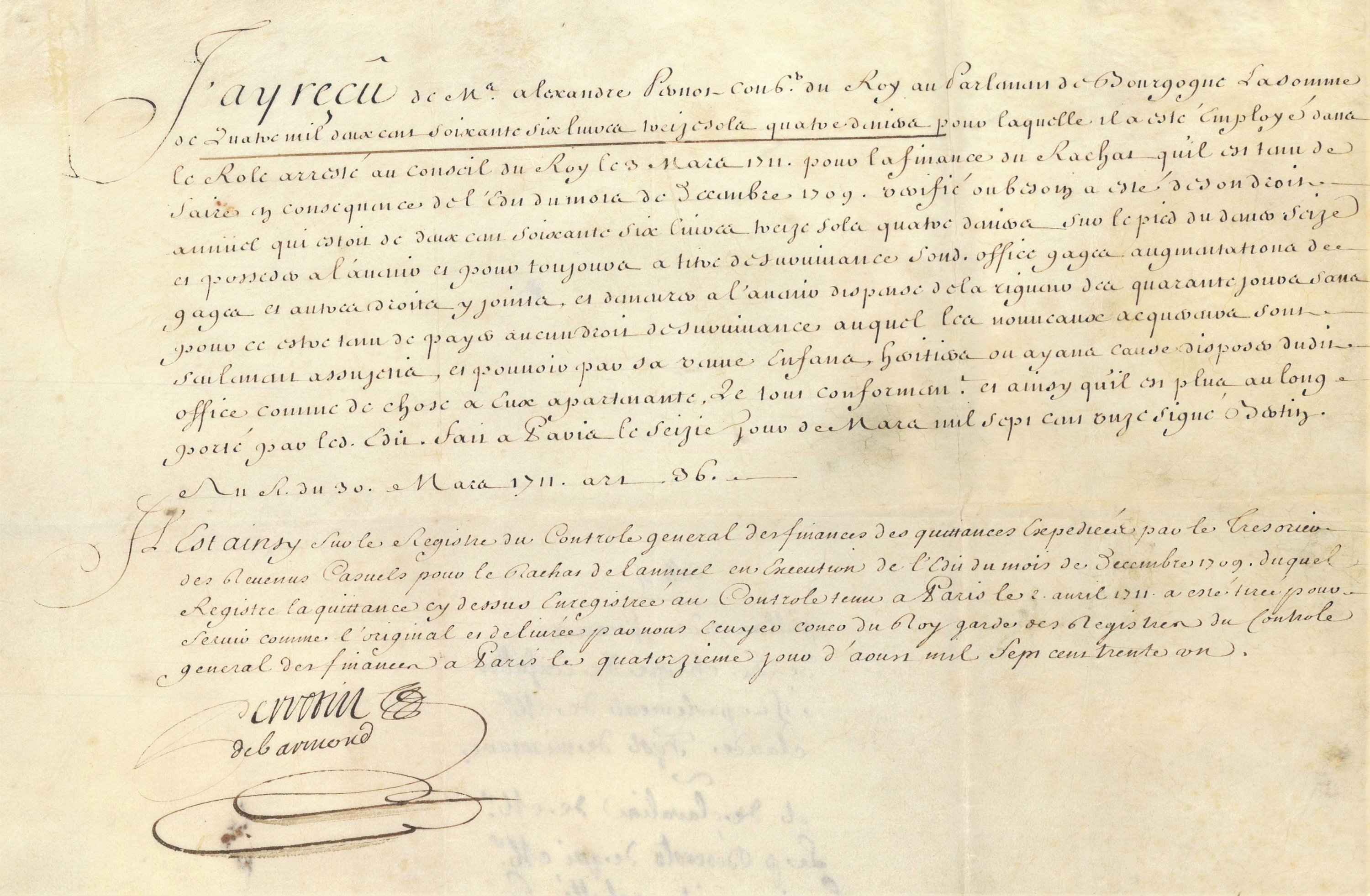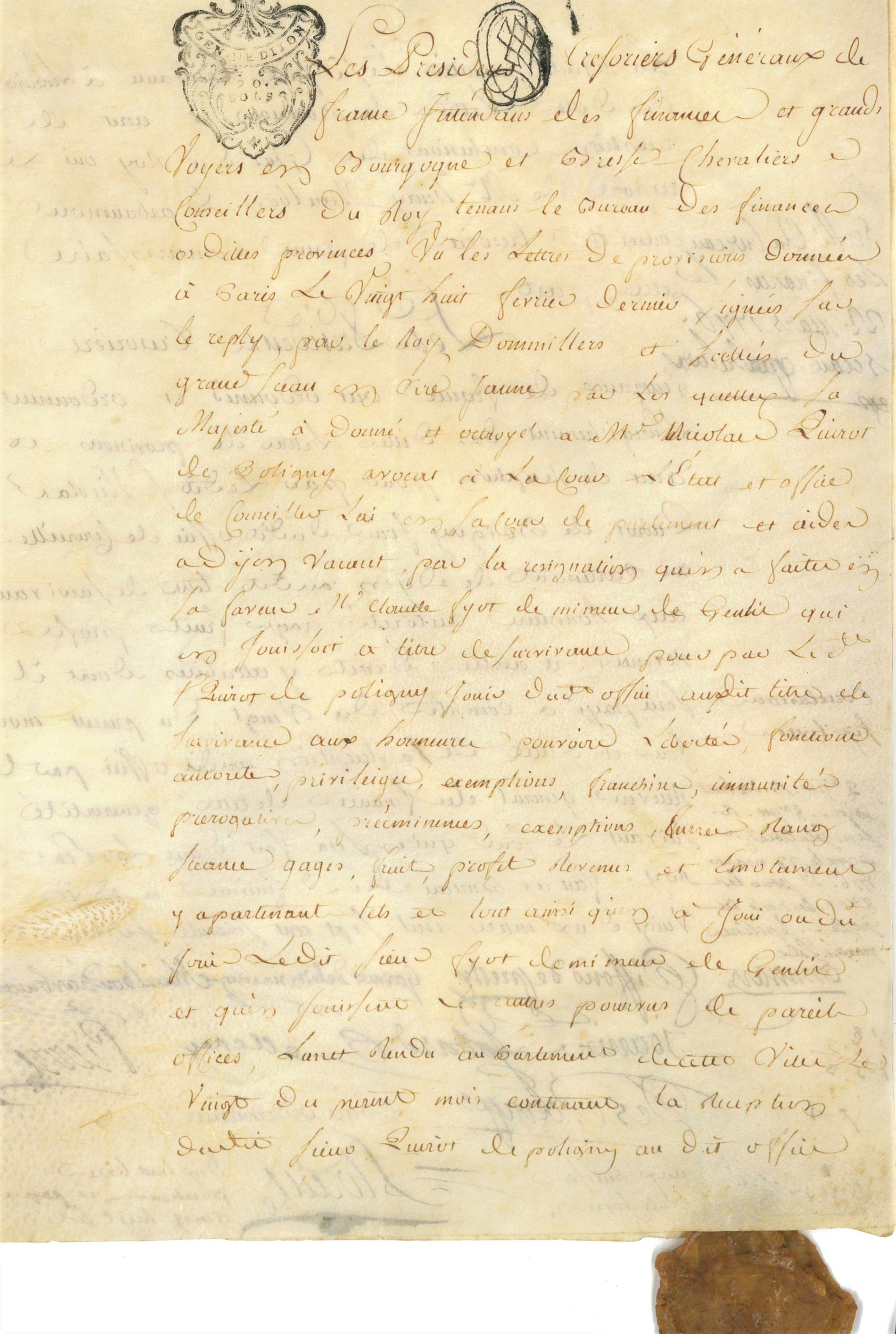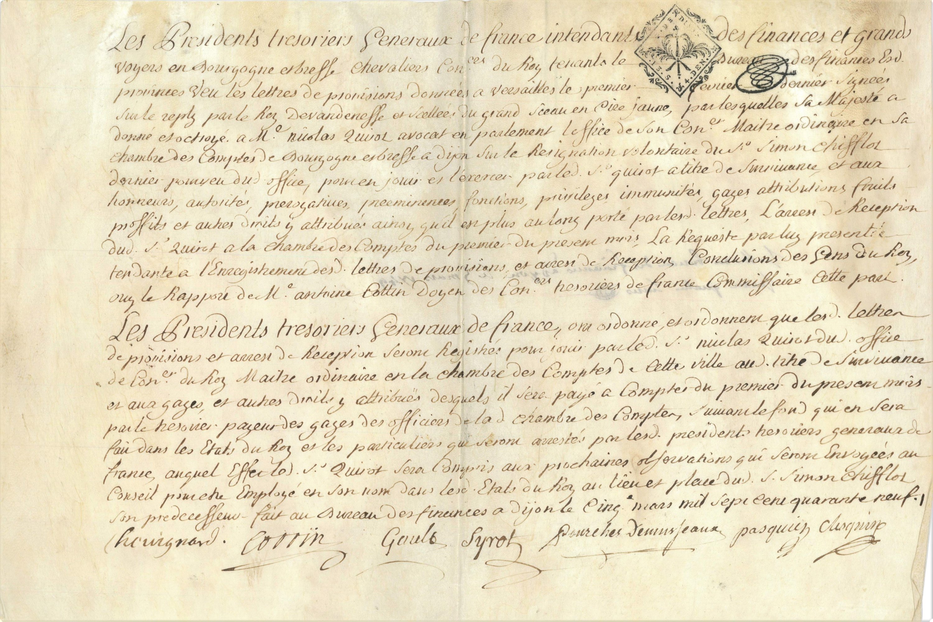 - P.S., Versailles, 25 janvier 1749, « Louis » (secrétaire) et contresignée par Jean-Frédéric Phélypeaux de Maurepas, ministre de la Maison du roi, parchemin oblong ; Dispense dâge accordée par le roi Louis XV à Nicolas Quirot de Poligny laîné afin dêtre pourvu de loffice de conseiller et maître ordinaire en la chambre des comptes de Bourgogne et de Bresse à Dijon ; joint : 5 pièces manuscrites sur parchemin dont acte de vente de loffice pour 55 000 livres daté du 21 décembre 1748 ; lettre denregistrement du 5 mars 1749 signées par les trésoriers généraux de France du bureau des finances de Dijon ;