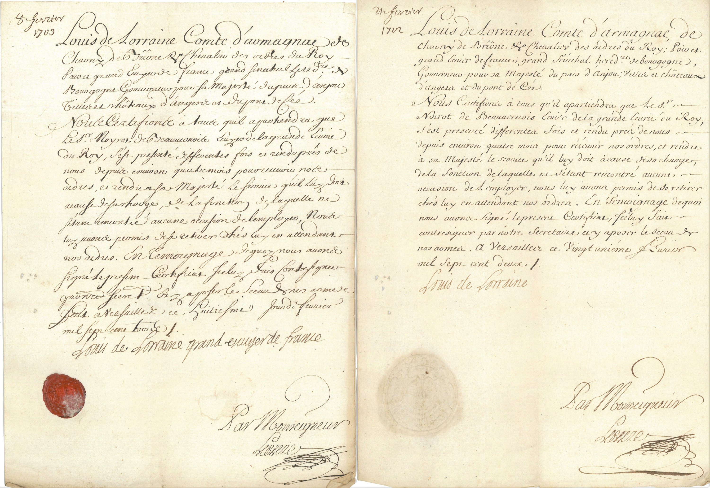 3 P.S., Versailles, 1700-1703, Louis de Lorraine, comte dArmagnac (1641-1718), grand écuyer de France et grand sénéchal héréditaire de Bourgogne, 3 pages in-4, avec sceaux ou cachet de cire ; brevet et certificats de services délivrés à Jacques Noirot ;