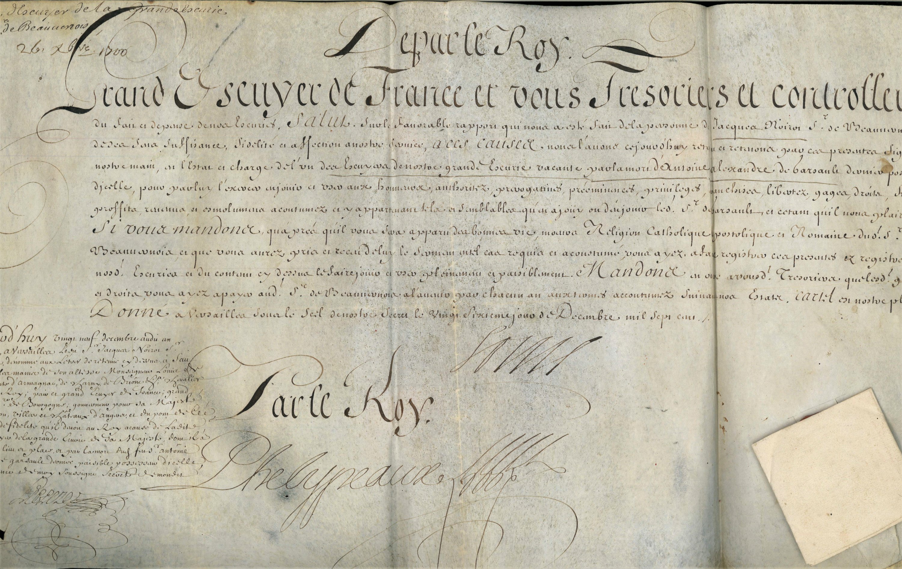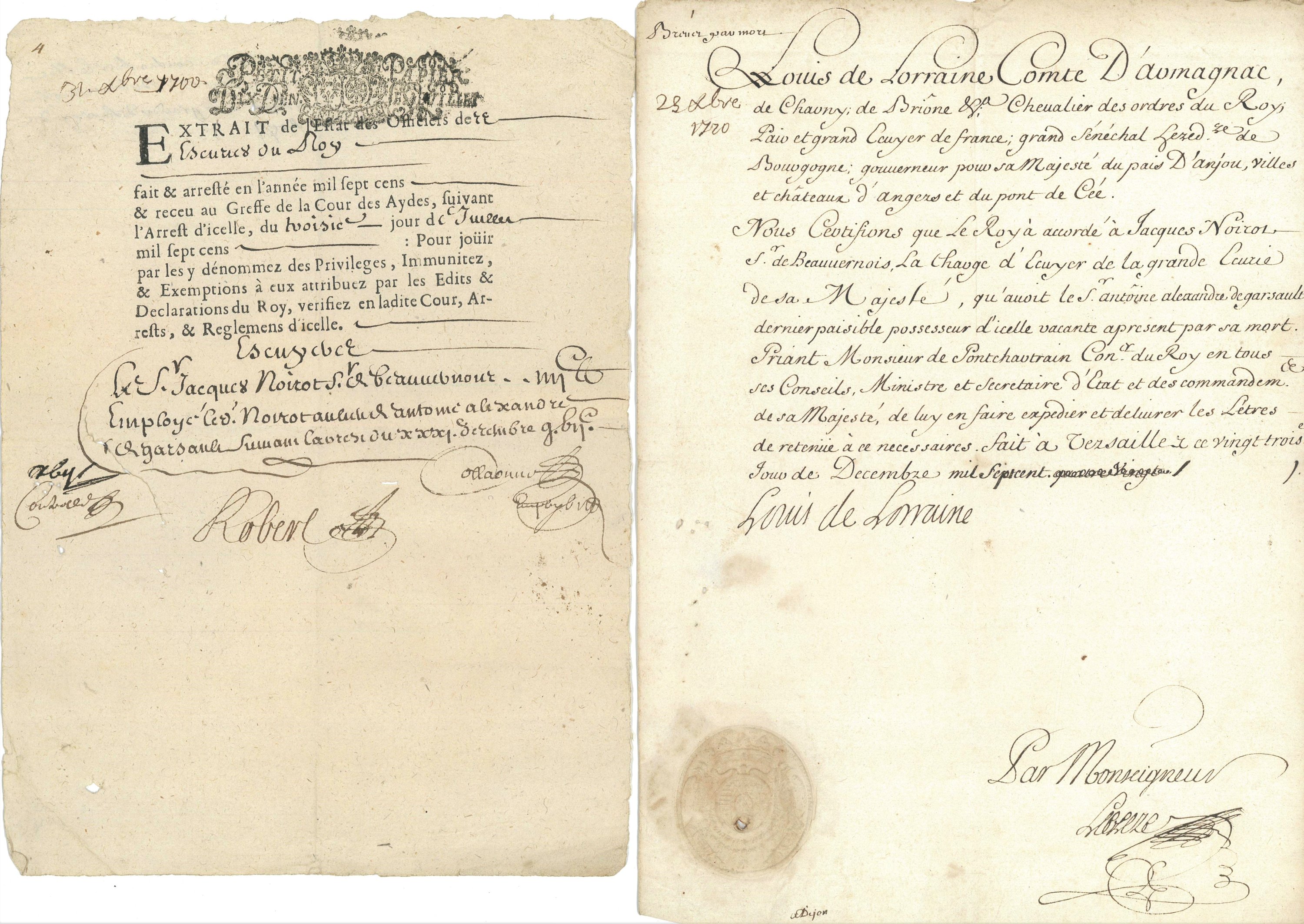 P.S., Versailles, 6 décembre 1700, « Louis » (secrétaire) et contresignée par Louis Phélypeaux de Pontchartrain, parchemin oblong, avec cachet de cire ; retenue décuyer ordinaire du roi en la grande écurie accordée à Jacques Noirot, sieur de Beauvernois, charge vacante par le décès dAntoine Alexandre de Garsault ;