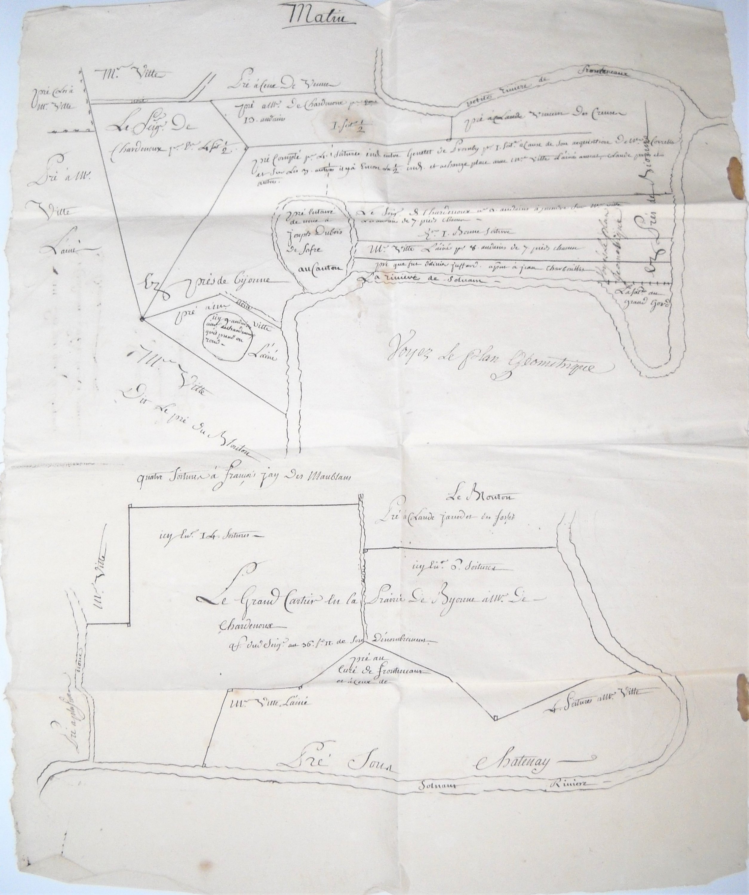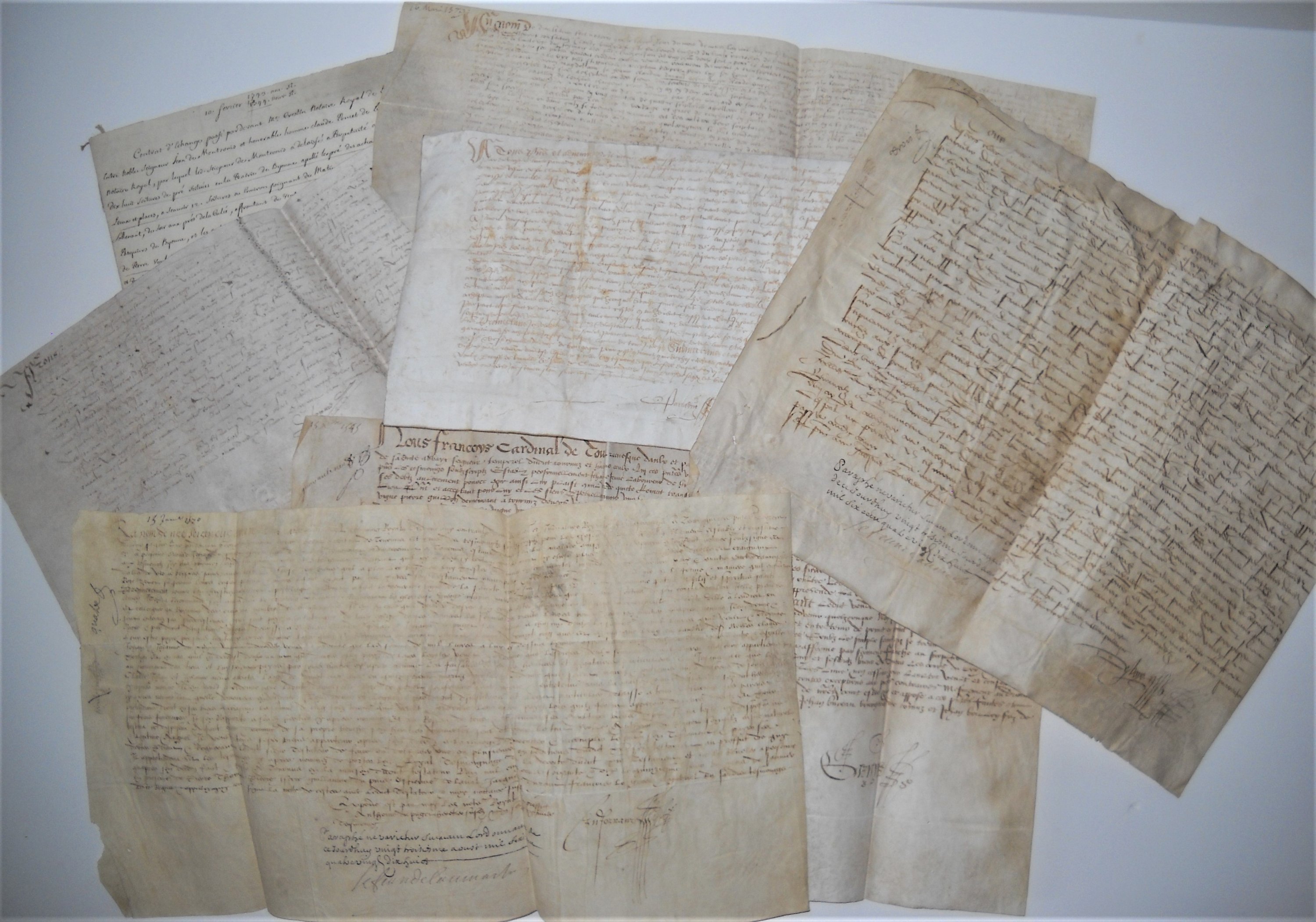 Lot de 15 pièces manuscrites, papier et parchemin, formats divers, dont copie du : Contrat de mariage entre Jean du Puget, seigneur dudit lieu, demeurant à Tournus, et Louise de Penot, 9 mai 1547 ; acquisition dune vigne sur le territoire de Chardonnay par Jean du Puget, 15 décembre 1545 ; testament de Jean du Puget, 15 janvier 1570 ; Titres de propriété de la prairie de Bionne à Bruailles près de Louhans : actes du 10 février 1476, 4 septembre 1487, 10 février 1543, 5 avril 1574, 16 mars et 1er décembre 1579, 2 août 1587 ; Contrat déchange à Bruailles, 17 mai 1649 ; Plan des prés que le seigneur de Chardenoux possède en la prairie de Bionne, 17e siècle, 51 x 41 cm ; etc.