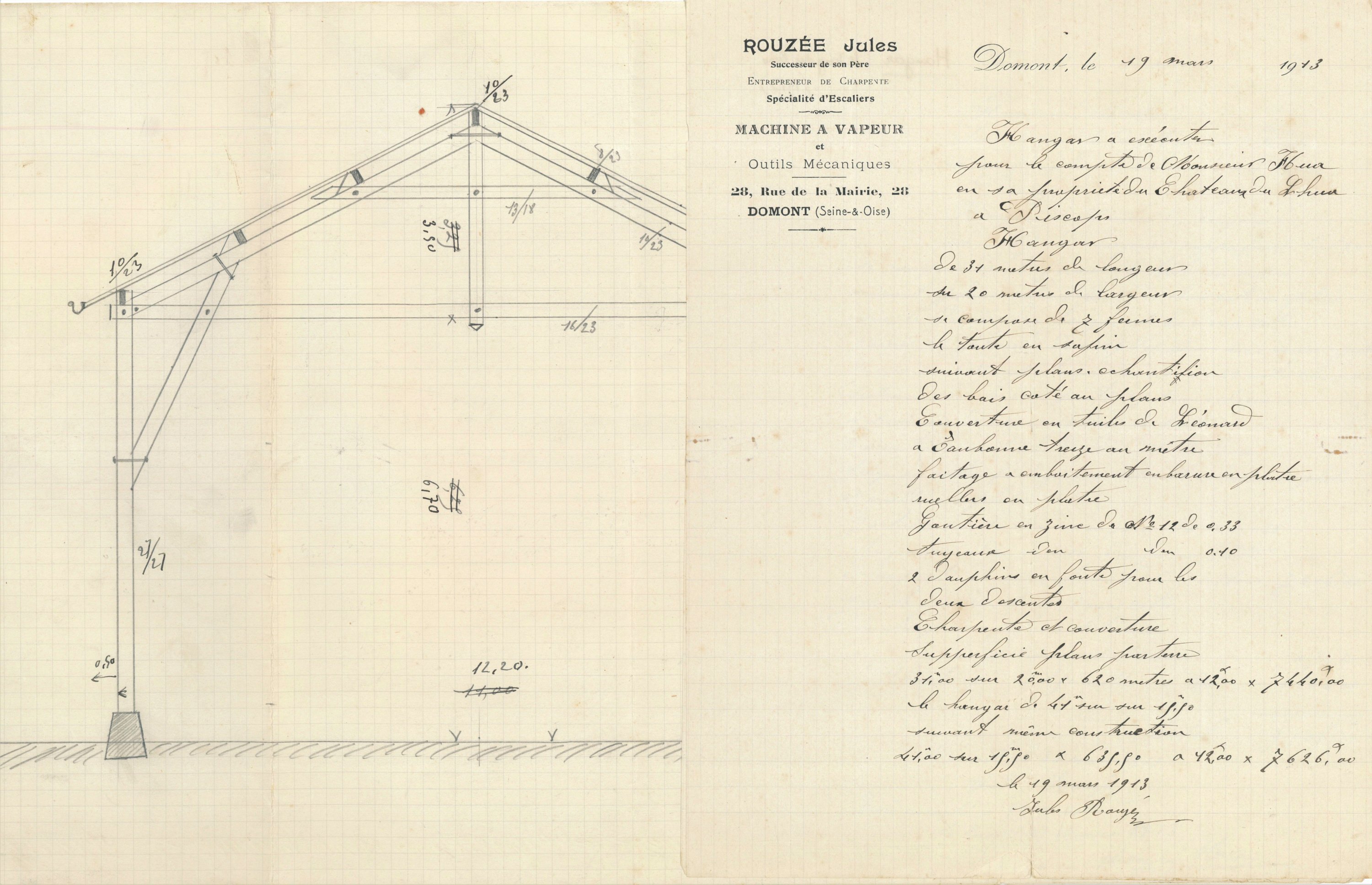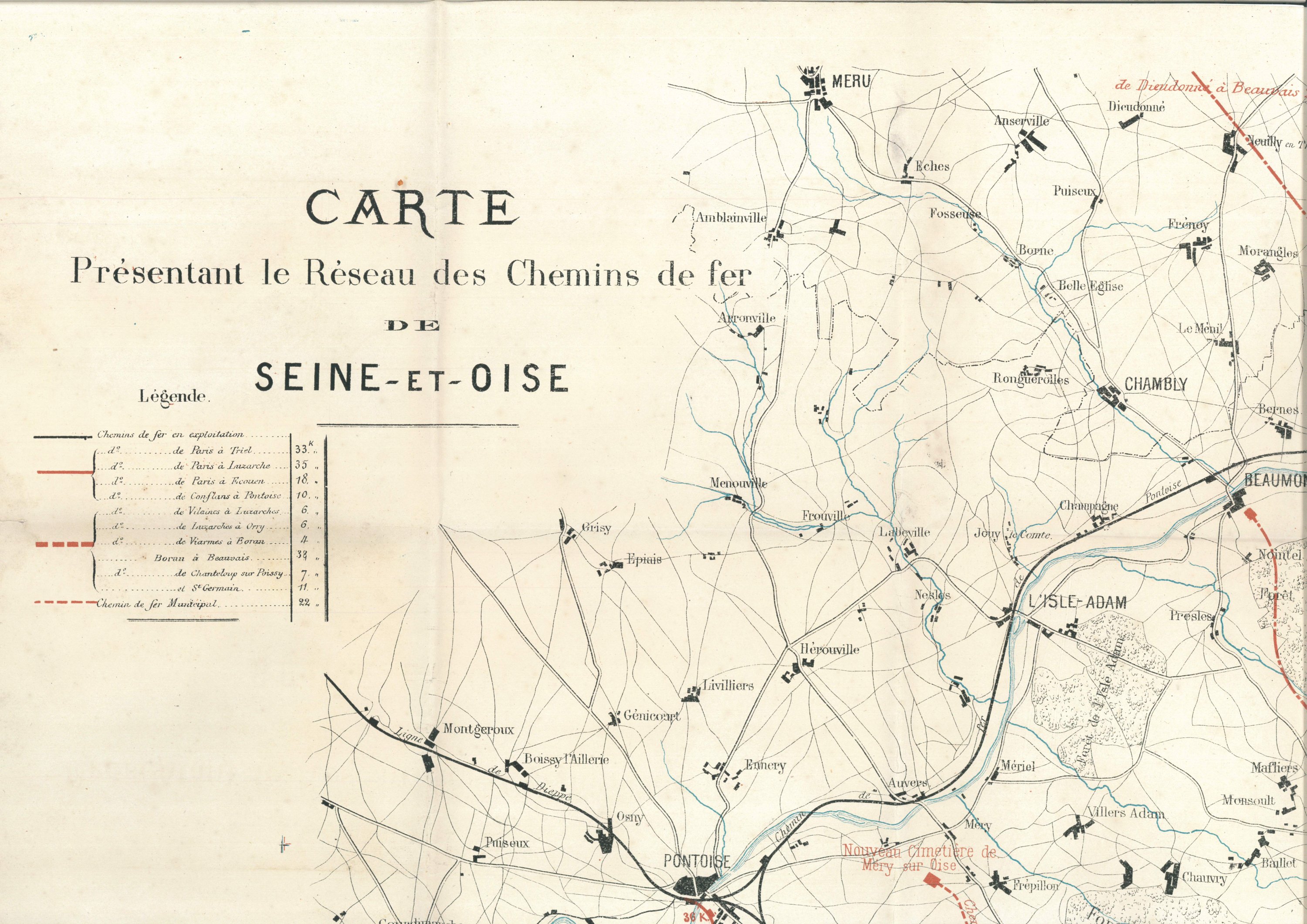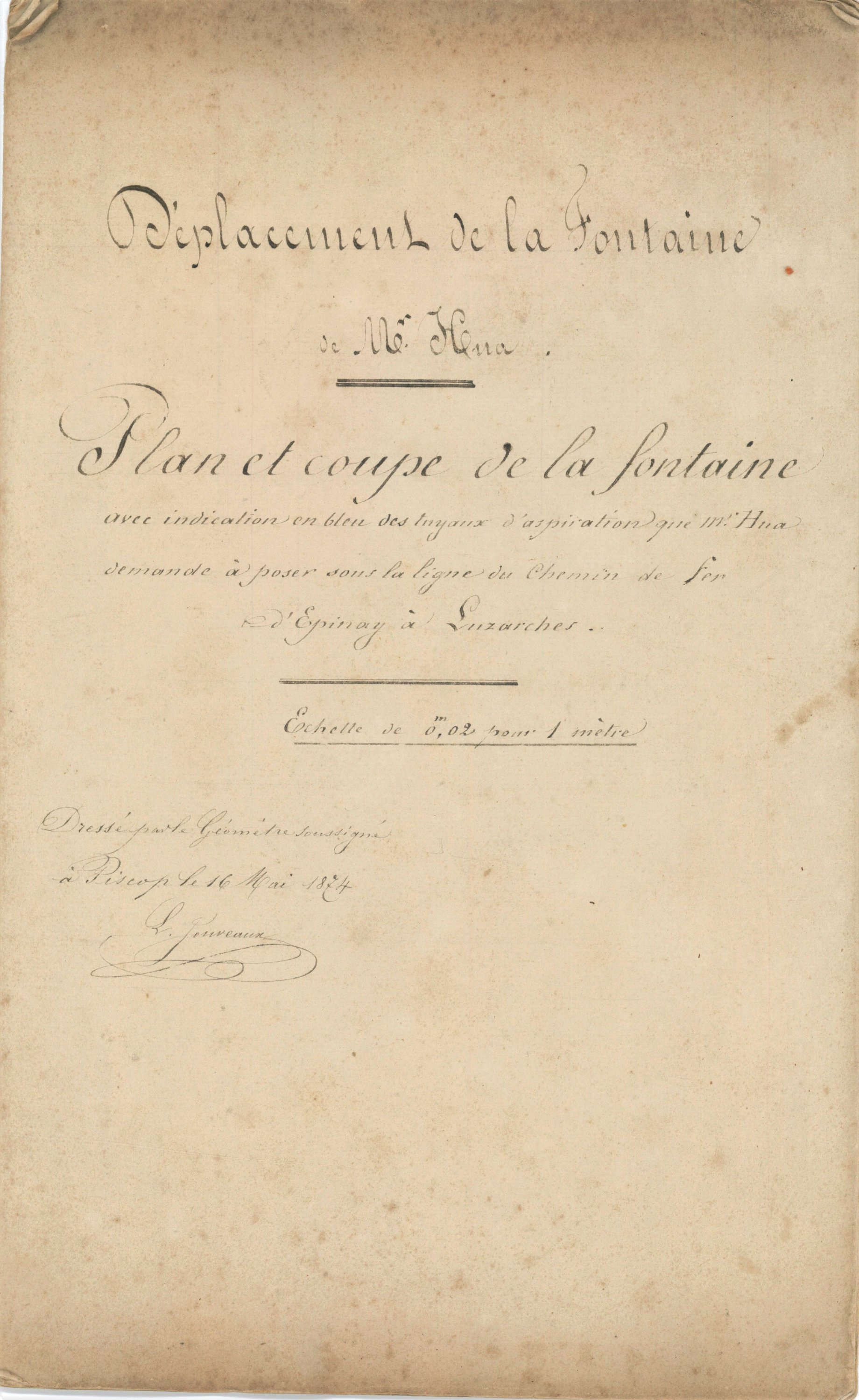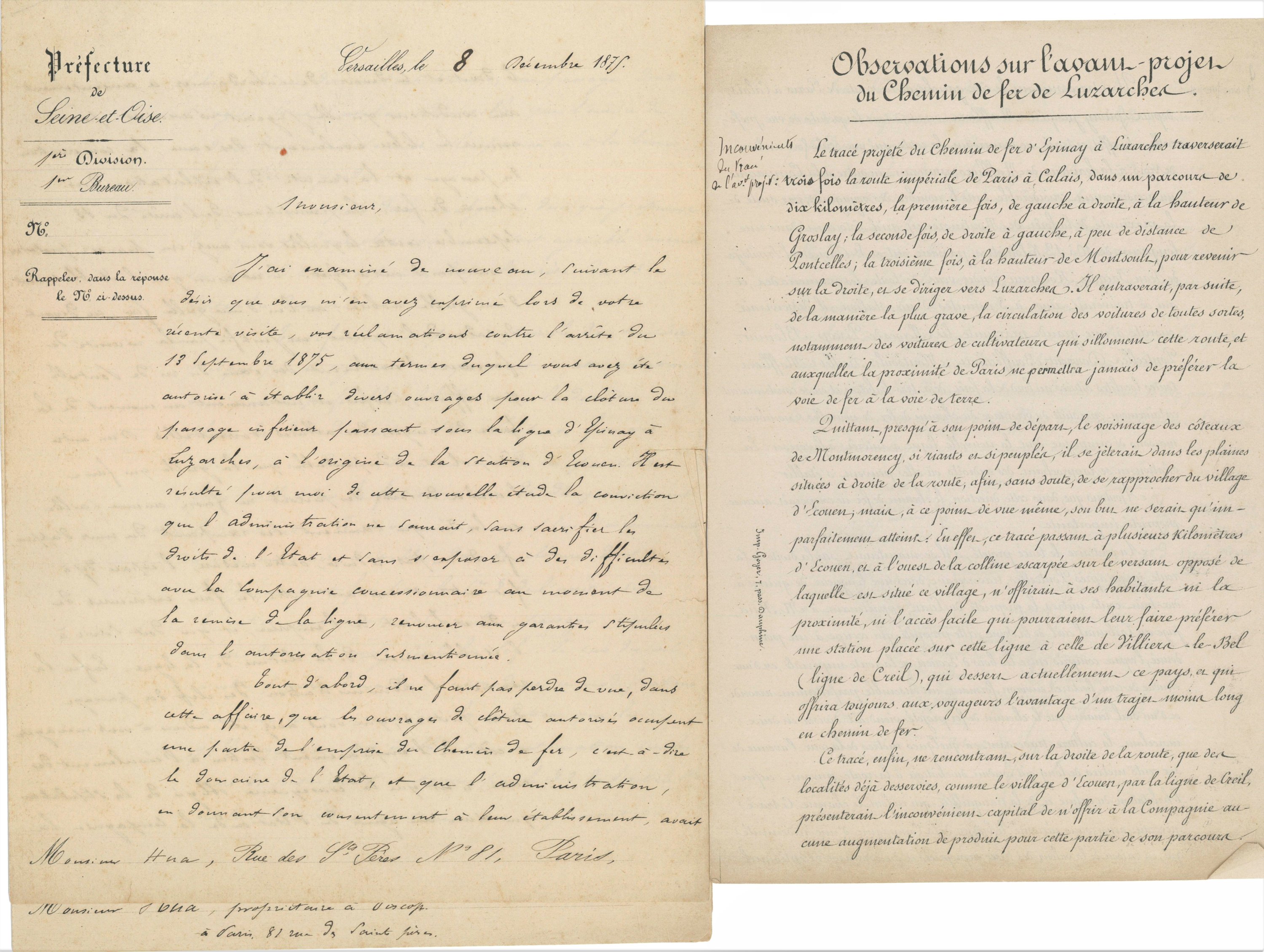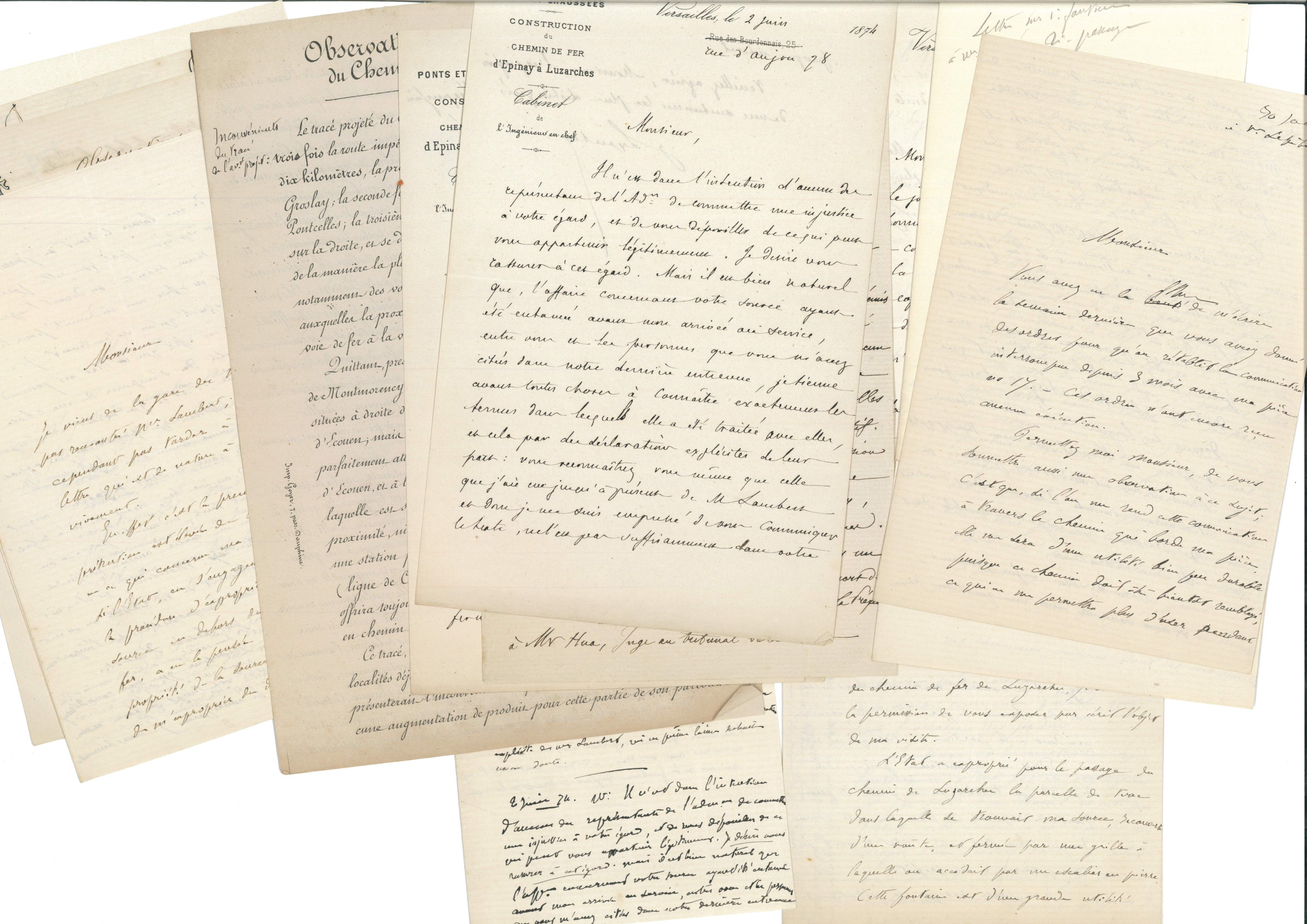 Lot d’env. 45 documents ayant appartenu à la famille Hua, propriétaire du château de Luat à Piscop (Val d’Oise) au 19e et première moitié du 20e siècle, concernant la construction de la nouvelle ligne de chemin de fer entre Epinay et Luzarche, vers 1860-1875, dont carte imprimée présentant le réseau des chemins de fer de Seine-et-Oise, 55 x 67 cm ; Nouveau mémoire à l’appui des projets de chemins de fer de Seine-et-Oise, par Paul de la Cornillère de Narbonne, 1867 ; plan et coupe de la fontaine du château, devant être déplacée et construction d’un aqueduc sous la ligne de chemin de fer, 1874 ; actes d’expropriations, brouillons de lettres et correspondances relatives au projet et aux réclamation d’Henri Hua, 1865-1875 ; etc.