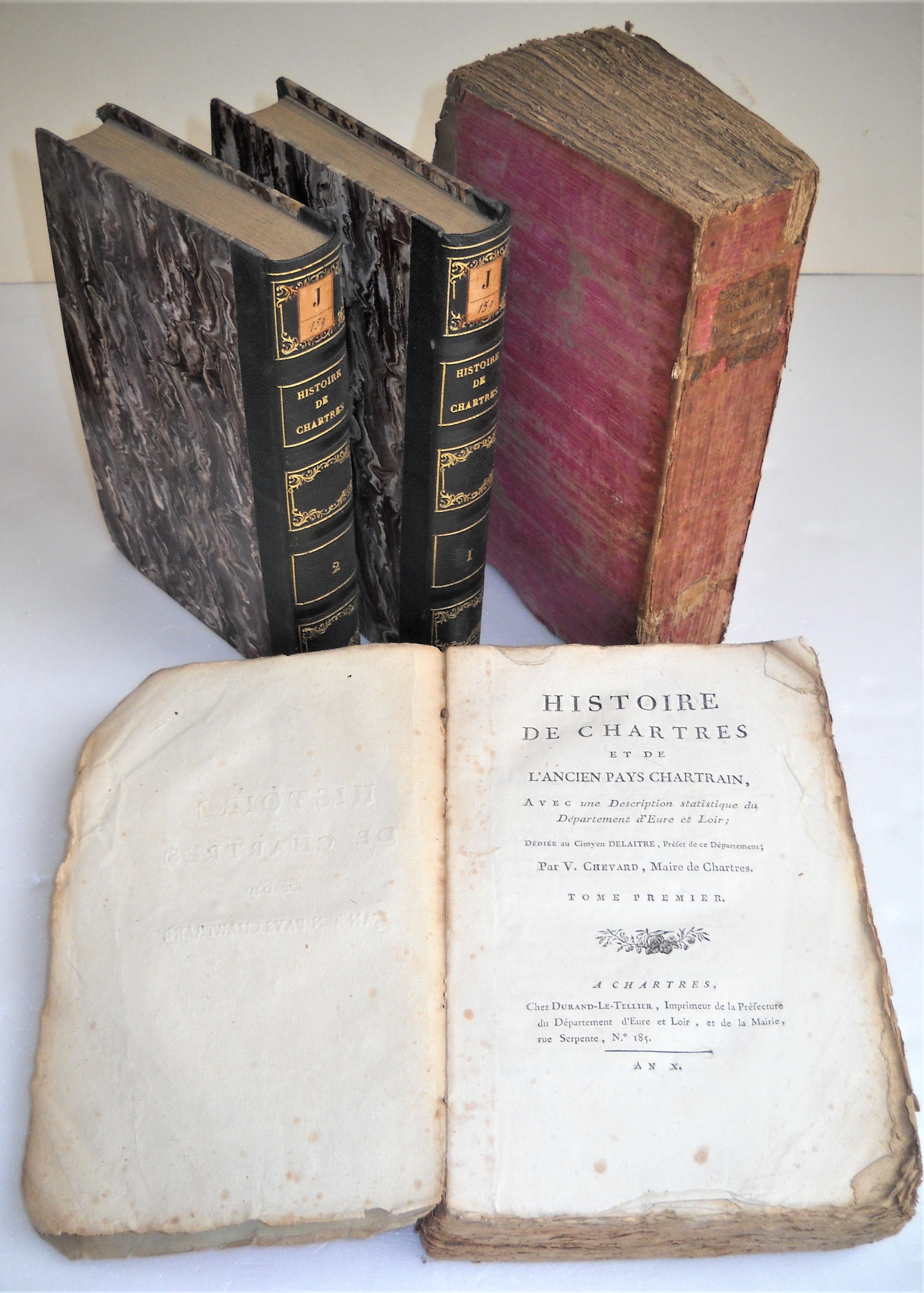 Vincent Chevard, maire de Chartres, Histoire de Chartres et de l'ancien pays chartrain, avec une description statistique du Département dEure-et-Loir, 2 vol., Chartres, Durand-Letellier, An X [1802], br. in-8, couv. muette dépoque, 571-600-103 pp.