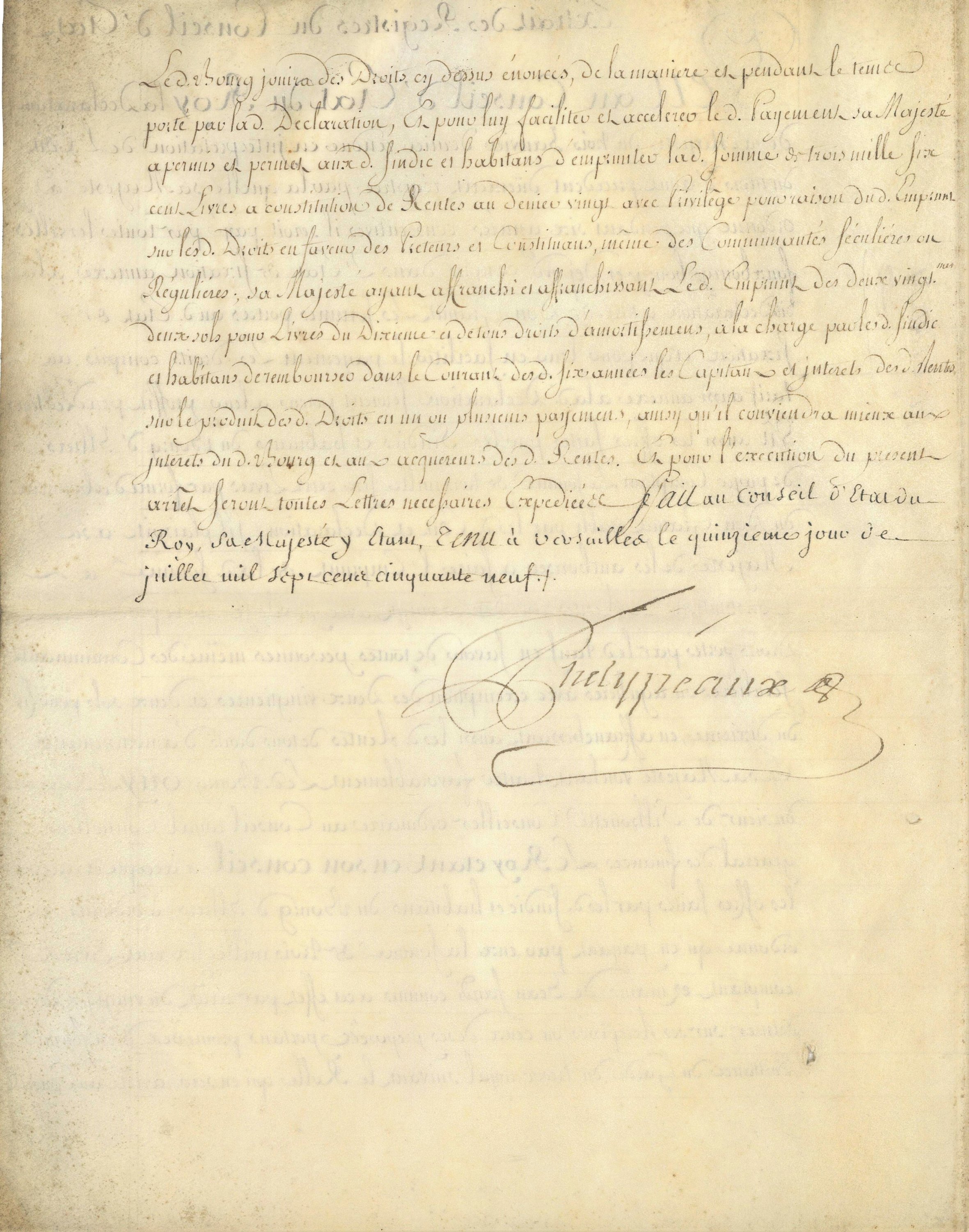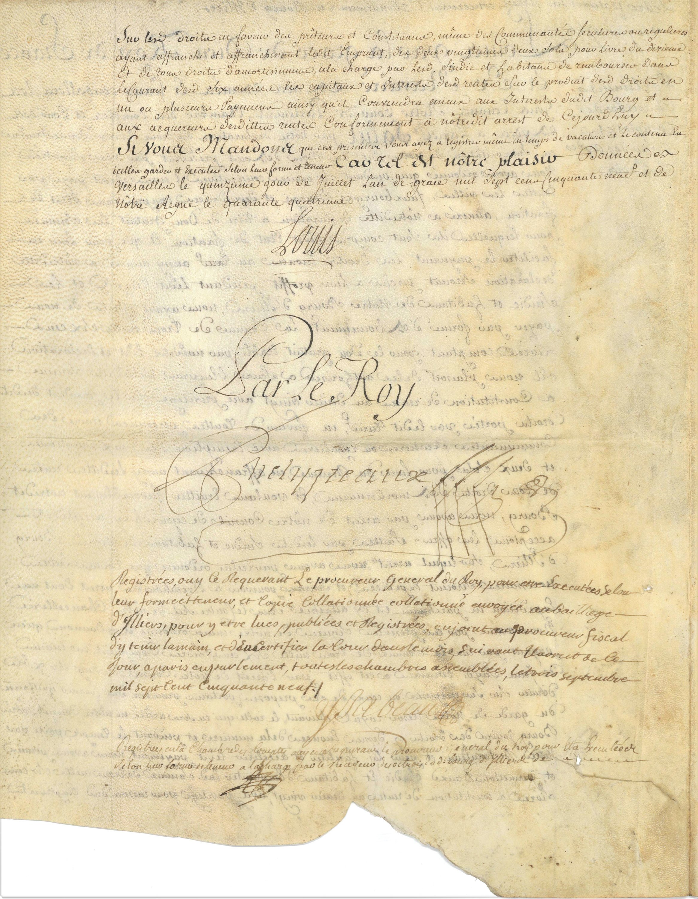 2 P.S., Versailles, 15 juillet 1759, dont une signée « Louis » (secrétaire) et contresignée par son secrétaire détat Phélypeaux, parchemins, 3 et 2 pp. in-4 ; Lettres patentes du roi relative au paiement de labonnement de 3600 livres à Illiers-Combray.