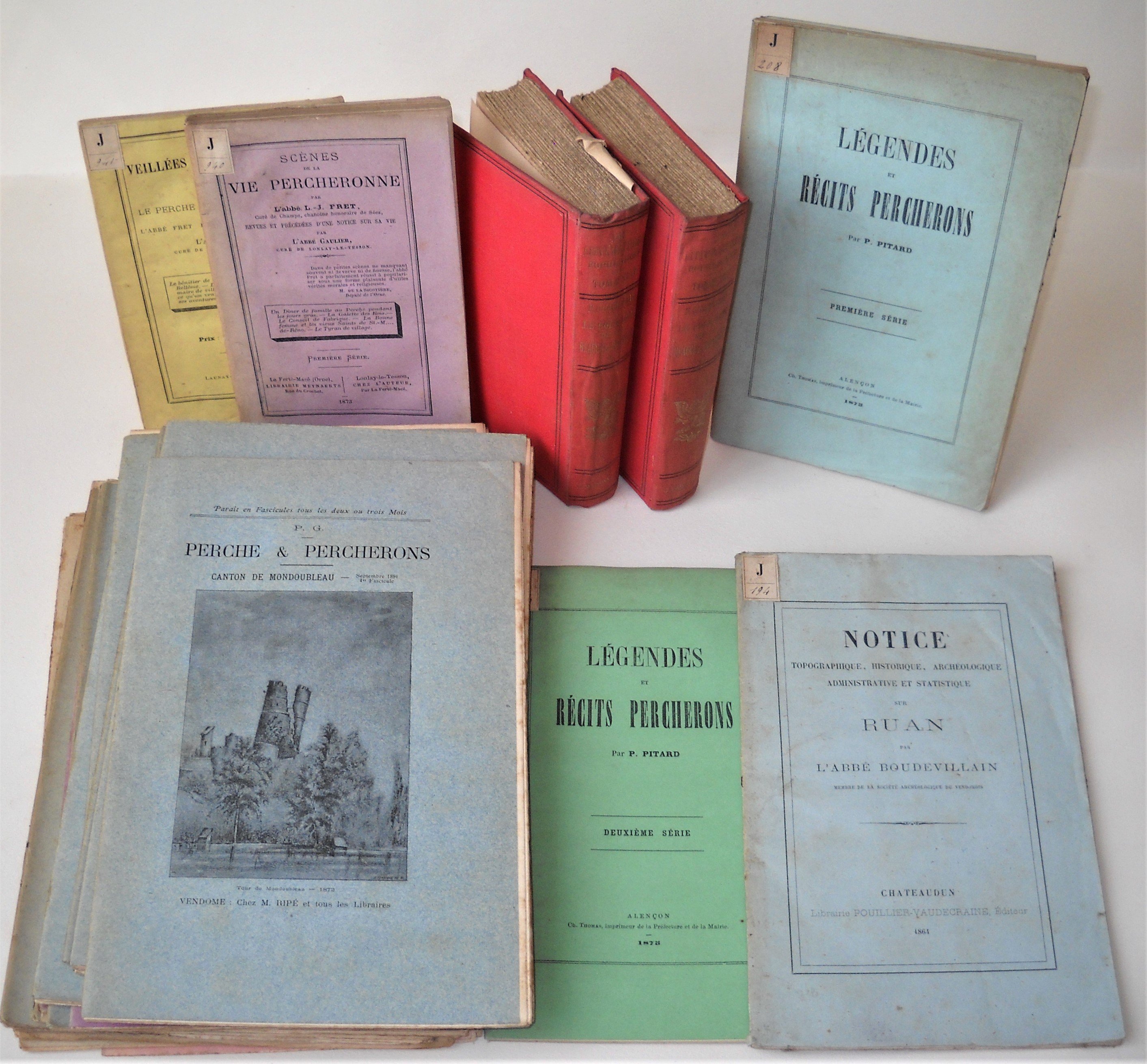 sur Ruan, Châteaudun, 1864, 44-3 pp. ; Abbé Gaulier : Scènes de la vie percheronne par labbé Fret revue et corrigée, La Ferté Macé, 1873, 118 pp. ; Les veillées percheronnes et récits sur le Perche et la Normandie, Mortagne, 1874, 60 pp. ; Pitard, Légendes et récits percherons, Alençon, 1875, 72 pp. (double exemplaire) ; Abbé Blanchard, Perche et percherons : Le canton de Mondoubleau, 1891-1893, parus en 14 fascicules, complet (qqs doublons) ; Félix Chapiseau, Le Folk-lore de la Beauce et du Perche, 2 vol., Maisonneuve édit., Paris, 1902, xiii-366 et 353 pp.