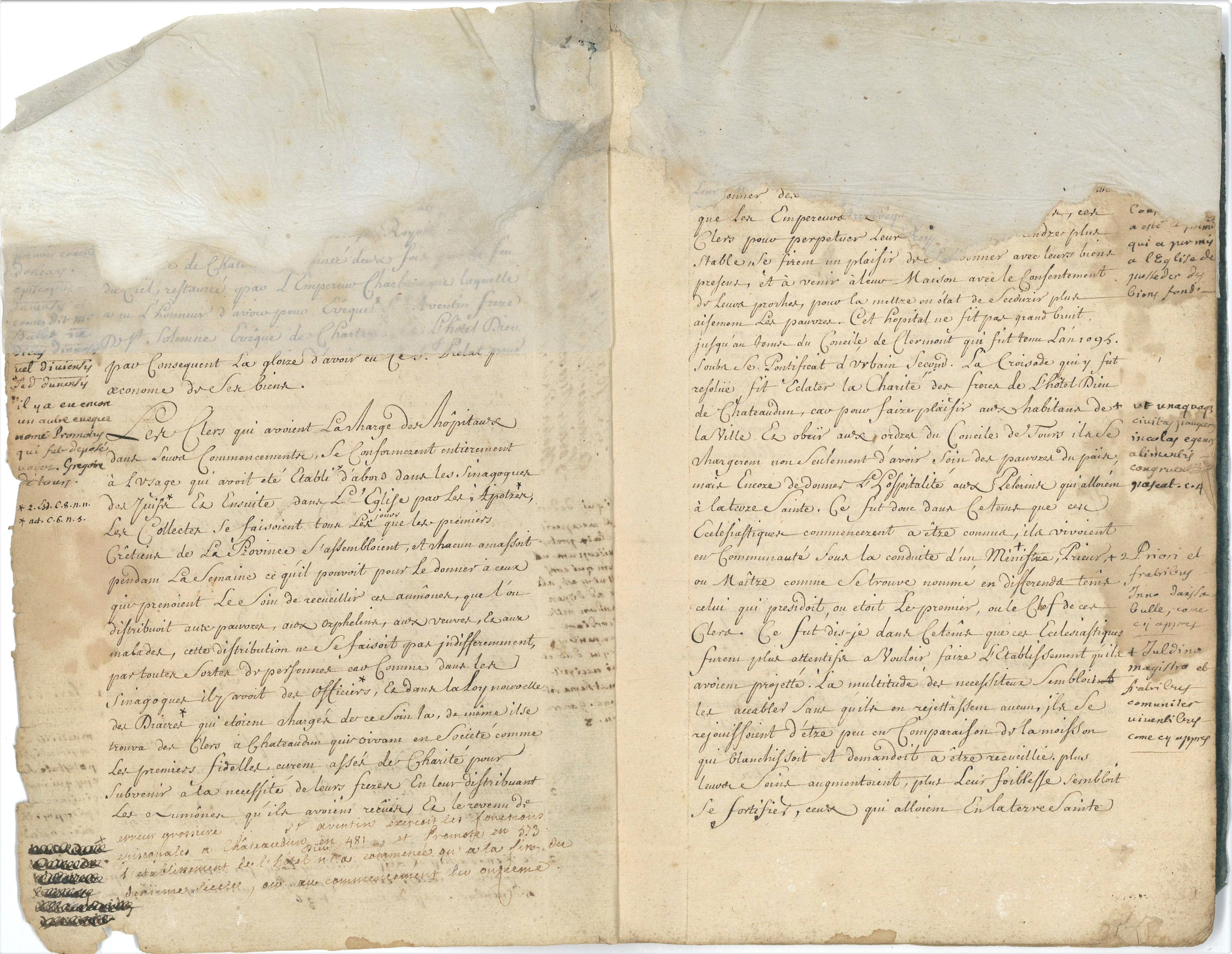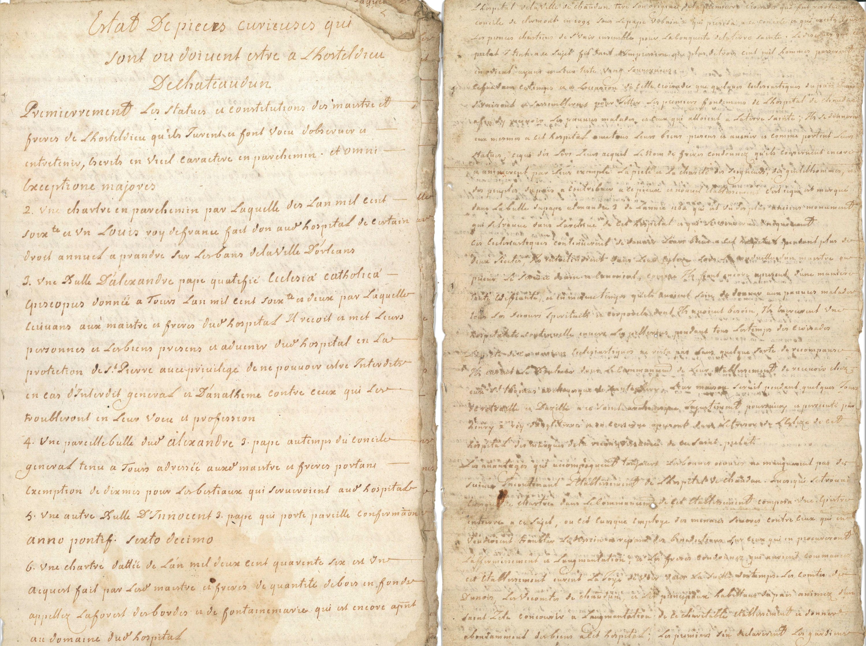 Lhôtel Dieu de chasteaudun, manuscrit anonyme, fin du 17e siècle, 12 pp. in-fol. ; court mémoire historique depuis son origine jusque dans les années 1690 ;