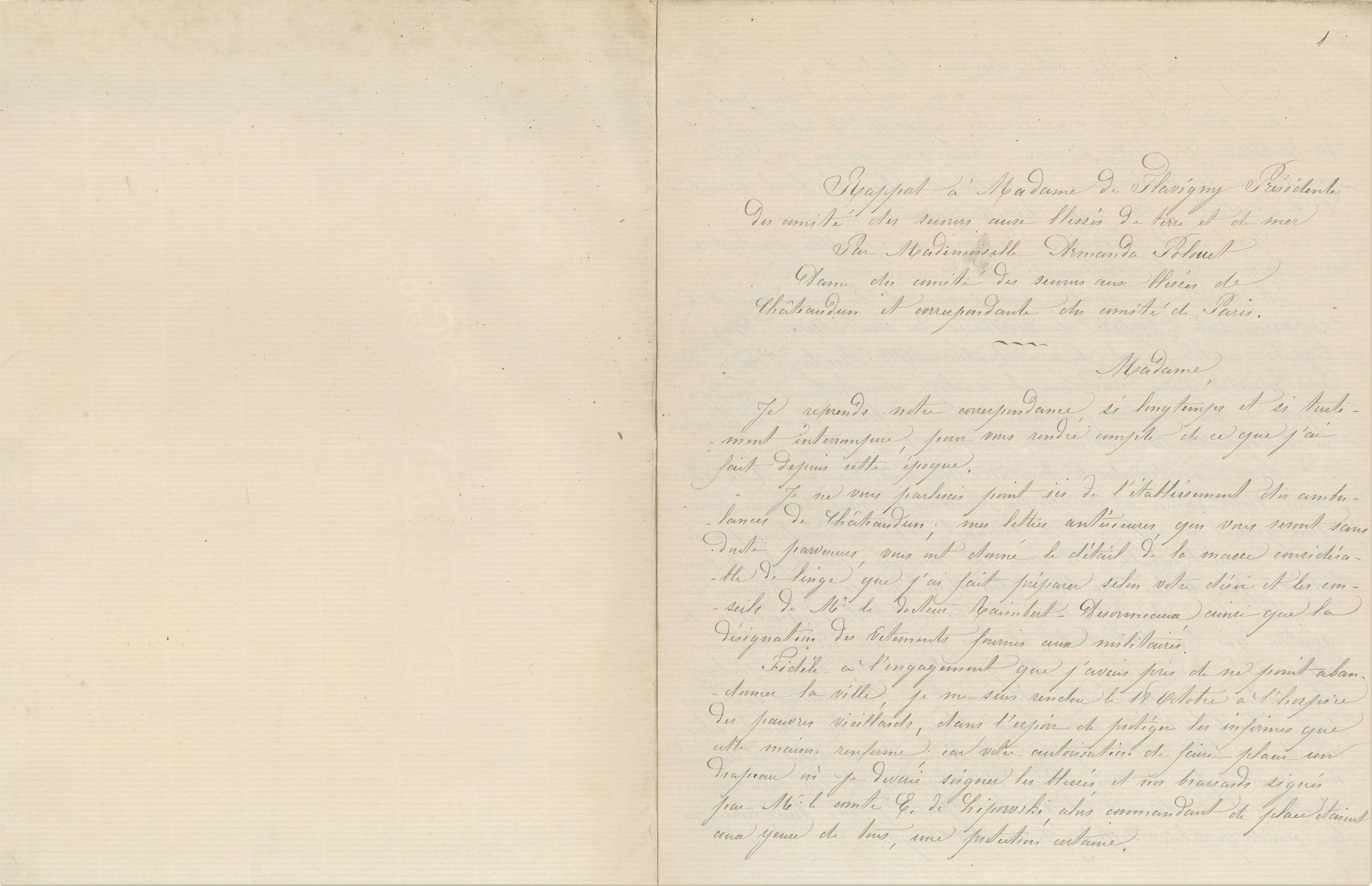Copie manuscrite du Rapport à Madame de Flavigny présidente du comité des secours aux blessés de terre et de mer, par mademoiselle Armanda Polonet dame du comité des secours aux blessés de châteaudun et correspondante au comité de Paris, 15 juin 1871, 12 pp. in-4 ; etc.