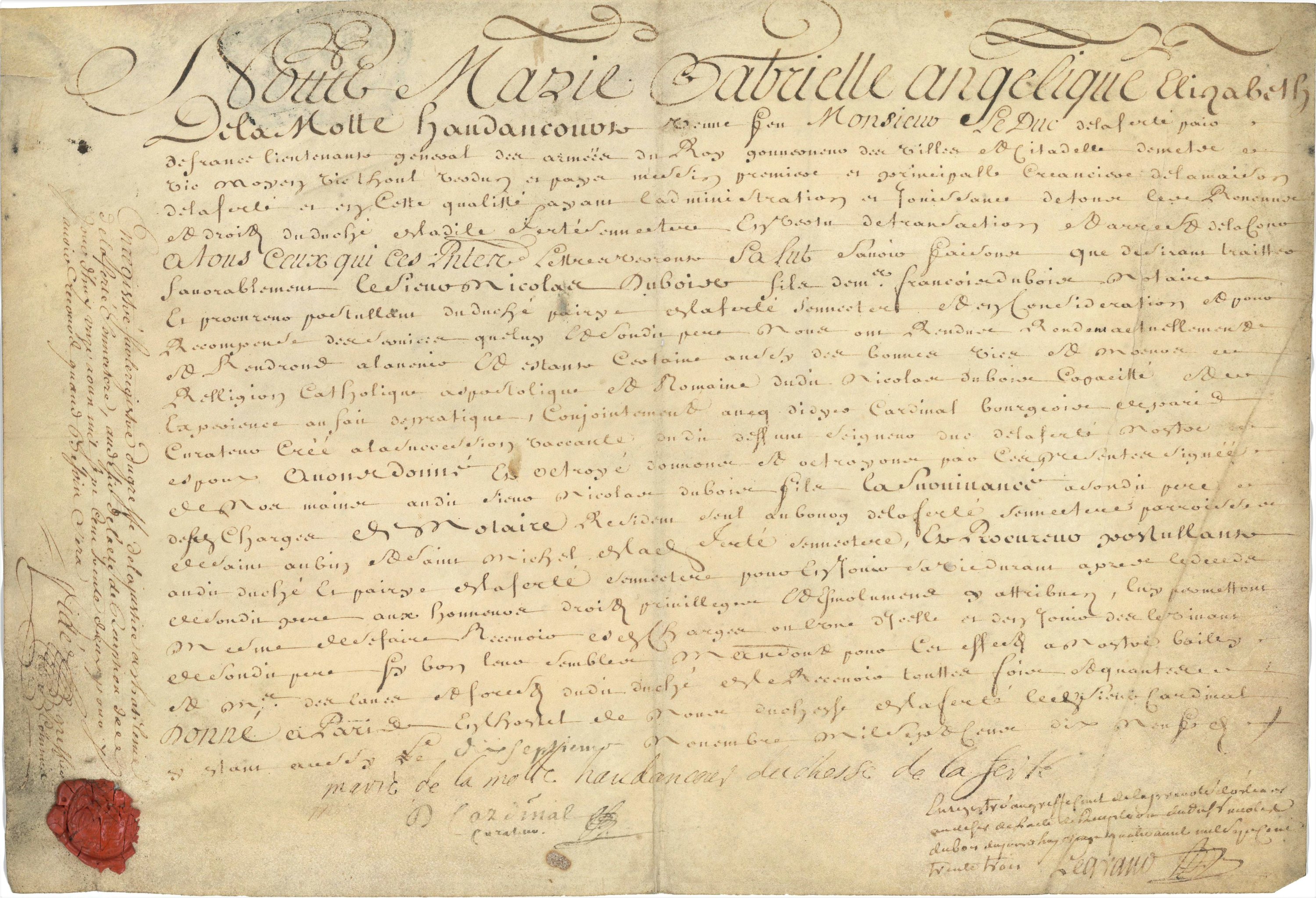 P.S., 17 novembre 1710, hôtel particulier de la Ferté à Paris, Marie de de La Mothe Haudancourt (1654-1726), duchesse de la Ferté-Sennetere, gouvernante des enfants royaux, parchemin ; Provision de survivance de la charge de notaire et procureur seigneurial du duché de la Ferté-Sennetere, avec cachet de cire rouge aux armes ;