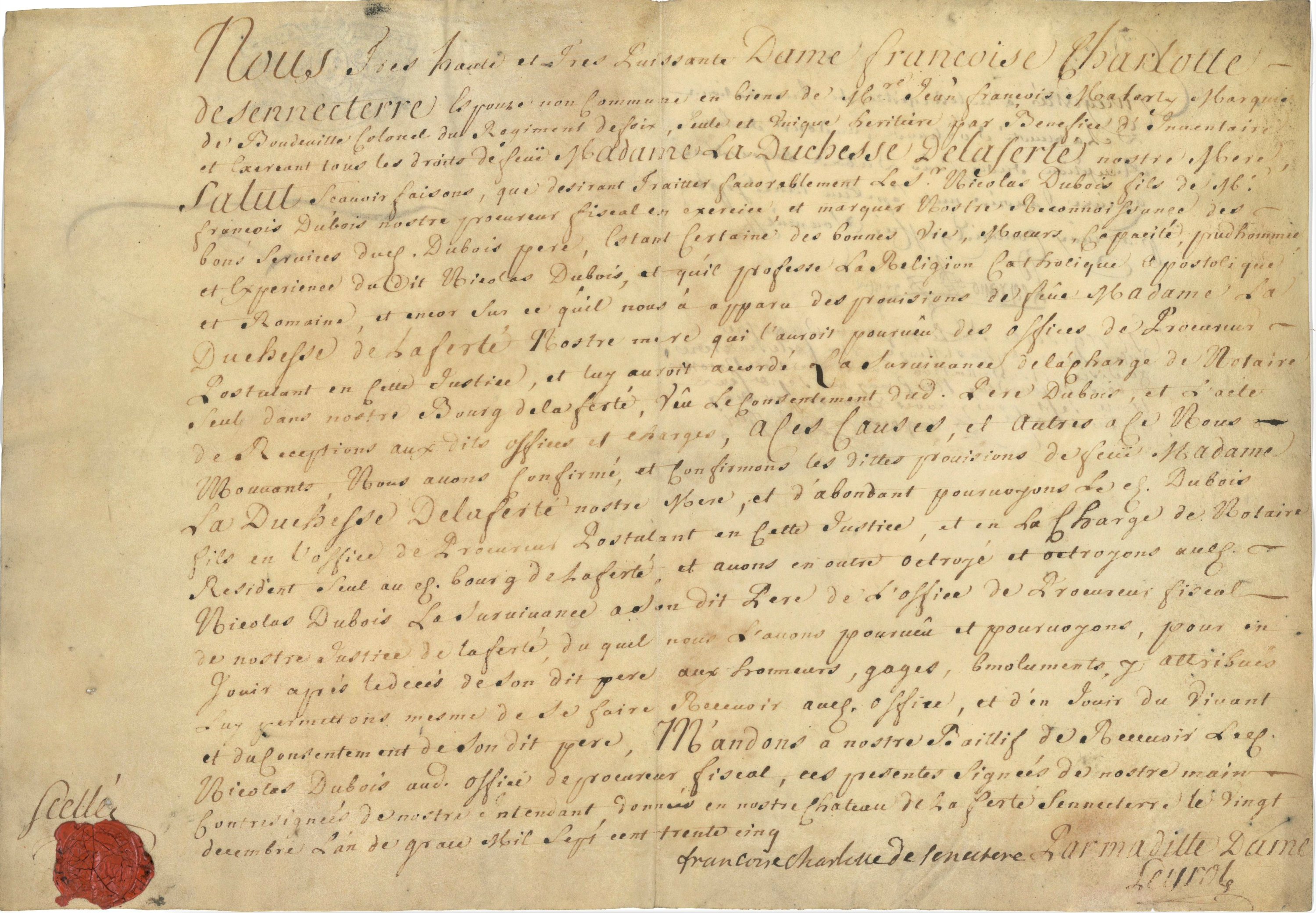 P.S., 27 octobre 1736, château de la Ferté, Françoise Charlotte de Sennectere (1679-1745), dite Mademoiselle de Menetou, claveciniste et compositrice, dame de la seigneurie de la Ferté Sennectere, épouse en secondes noces du marquis de Boudeville ; Provision de la charge de lieutenant du bailli et maître particulier de la seigneurie de la Ferté, avec mention manuscrite de la marquise « en notre château de la Ferté Senectere ce vingt-sept octobre 1736 » signée « Senectere M. de Boudeville », et beau cachet de cire rouge aux armes.