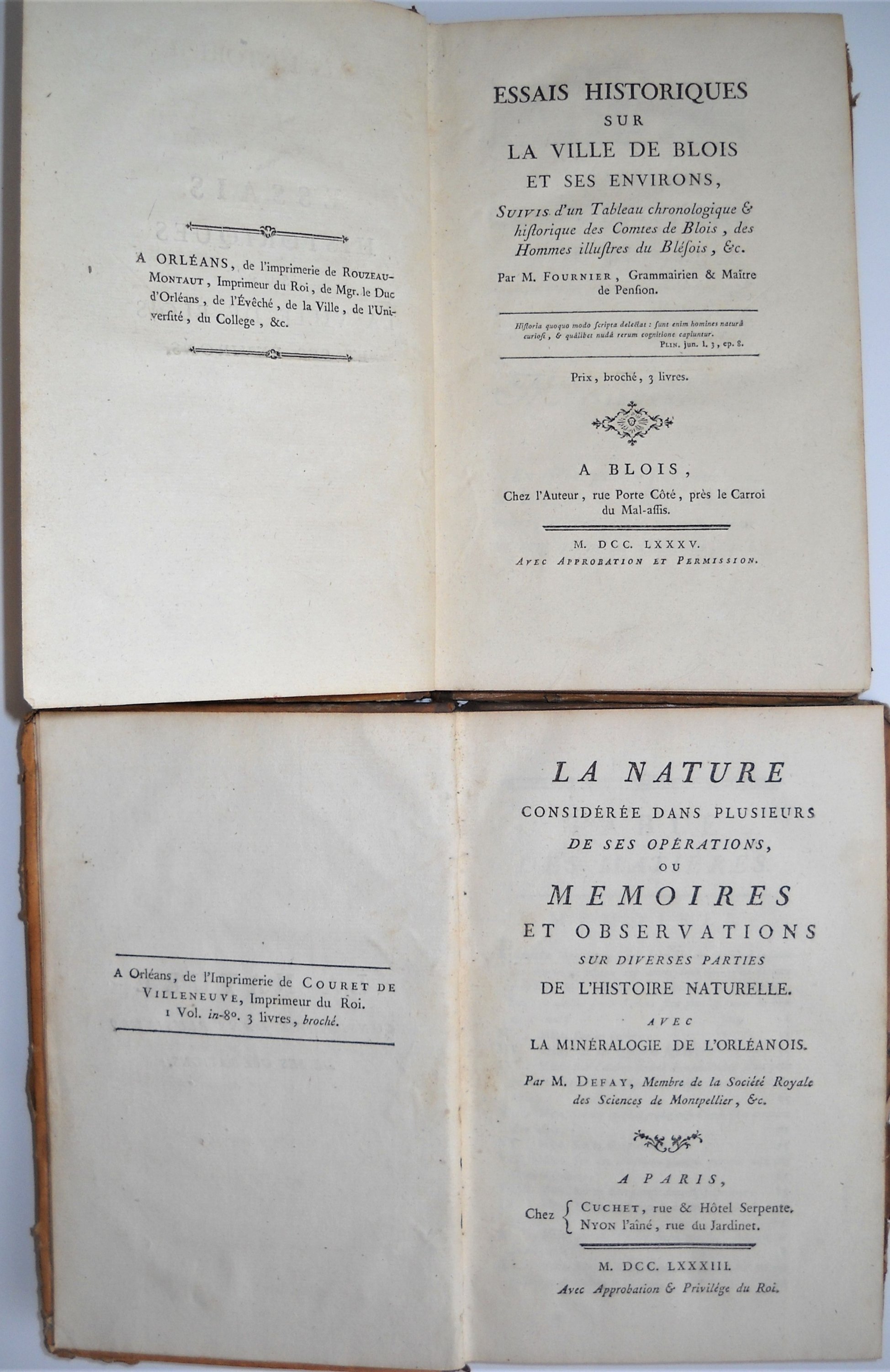 Recueil factice en 2 vol., rel. cartonnage in-8, contenant : Fournier, Essais historiques sur la ville de Blois et ses environs, Blois, chez l’auteur, 1785, 185 pp. ; Polluche, Essais historiques sur Orléans, ou Description topographique et critique de cette capitale et de ses environs..., Orléans, Couret de Villeneuve, 1778, 210 pp. avec plan dépliant ; Hortus Aurelianensis, 12 pp. ; Defay Boutheroue, La nature considérée dans plusieurs de ses opérations ou mémoires et observations sur diverses parties de l'histoire naturelle, avec de la minéralogie de l'Orléanais, Paris, Cuchet & Nyon, 1783, (viii)-221-(3) pp. ; Beauvais de Preau, Essai sur la topographie d’Olivet, Orléans, Couret de Villeneuve, 1784, (iv)-93-(iv) pp.