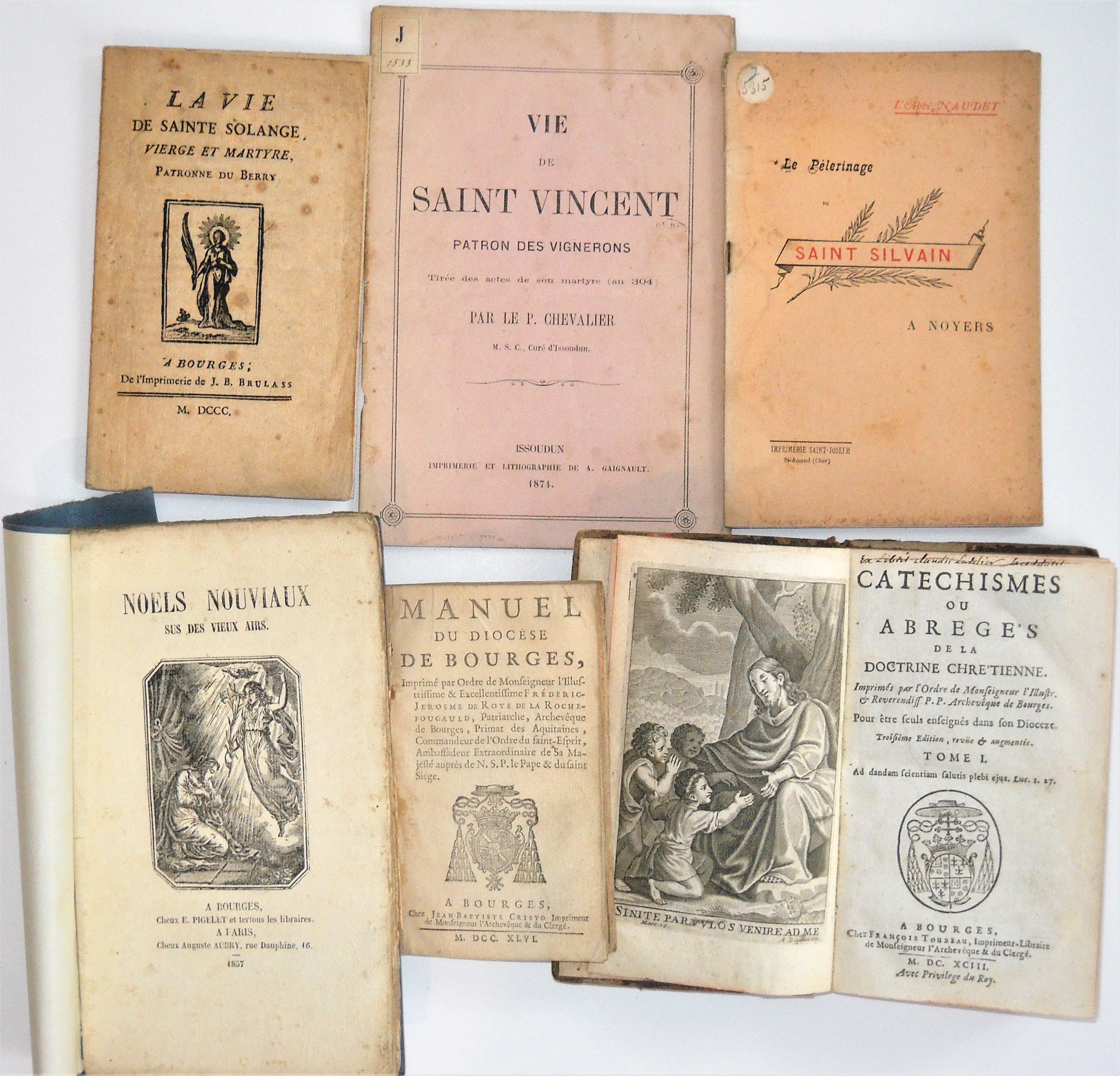 Paris, Lottin, 1788, 48 pp. ; La vie de sainte Solange Vierge et martyre patronne du Berry, Bourges, Impr. Brulass, éditions de 1800 et de 1810, 12 pp. chacune ; Noël nouveaux sur des vieux airs, Bourges, Pigelet, 1857, 48 pp. ; Chevalier, Vie de Saint Vincent patron des vignerons, Issoudun, Gaignault, 1874, 14 pp. ; Abbé Naudet, Le pèlerinage de saint Silvain à Noyers, St Amand, Impr. Saint Joseph, 35 pp. ; Instruction pastorale de monseigneur de larchevêque de Bourges à loccasion du millénaire de sainte Solange patronne du Berry, Bourges, Pigelet, 1878, 34 pp.