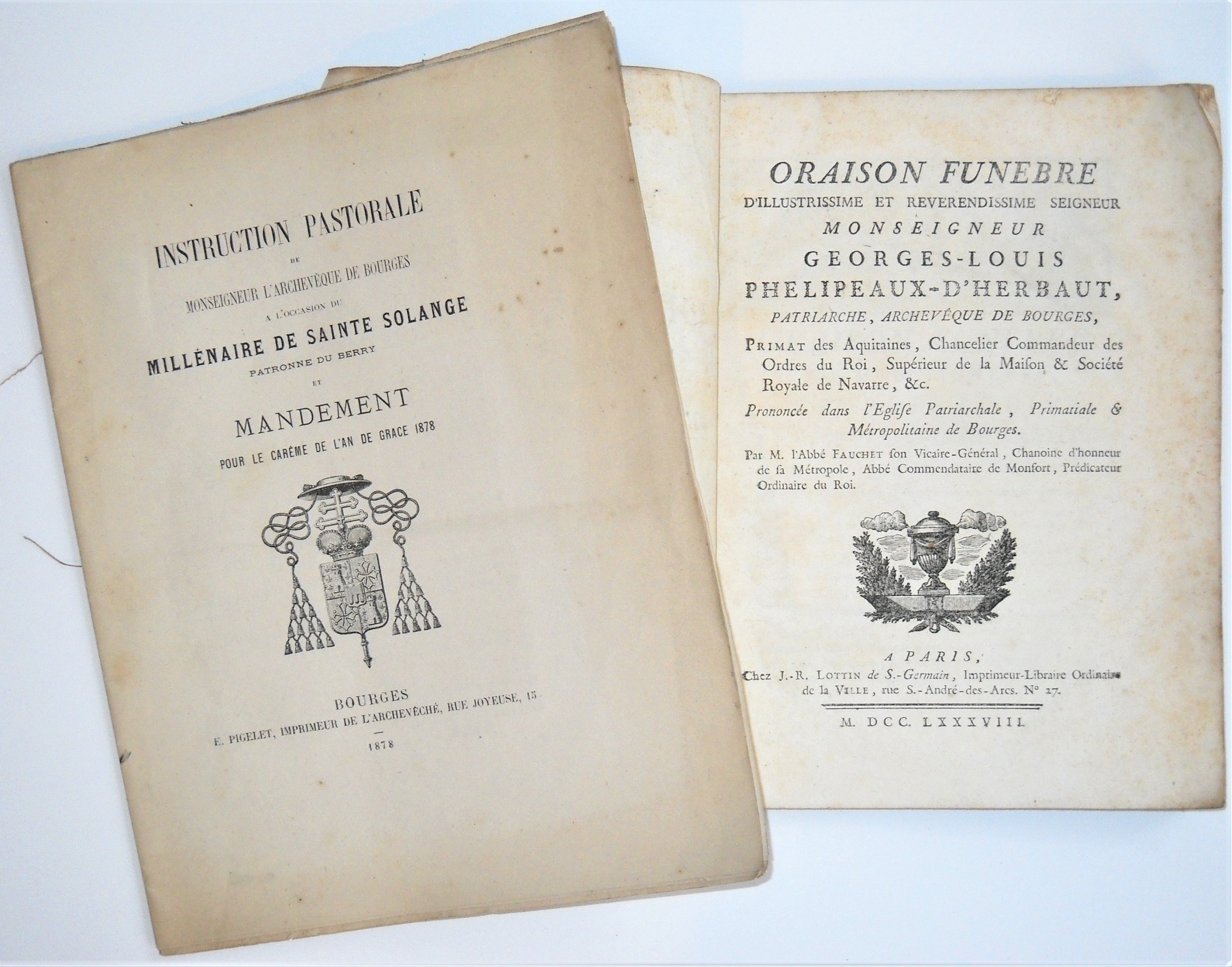 Catéchismes ou abrégés de la doctrine chrétienne, tome 1er, Bourges, Toubeau, 1693, rel. in-8 plein veau (en létat), 498 pp. + p.499 manuscrite ; Manuel du diocèse de Bourges, Bourges, Jean baptiste Cristo, 1746, in-16, iv-148 pp. ; Oraison funèbre dillustrissime et révérendissime seigneur monseigneur Georges-Louis Phelipeaux-dHerbault, patriarche, archevêque de Bourges