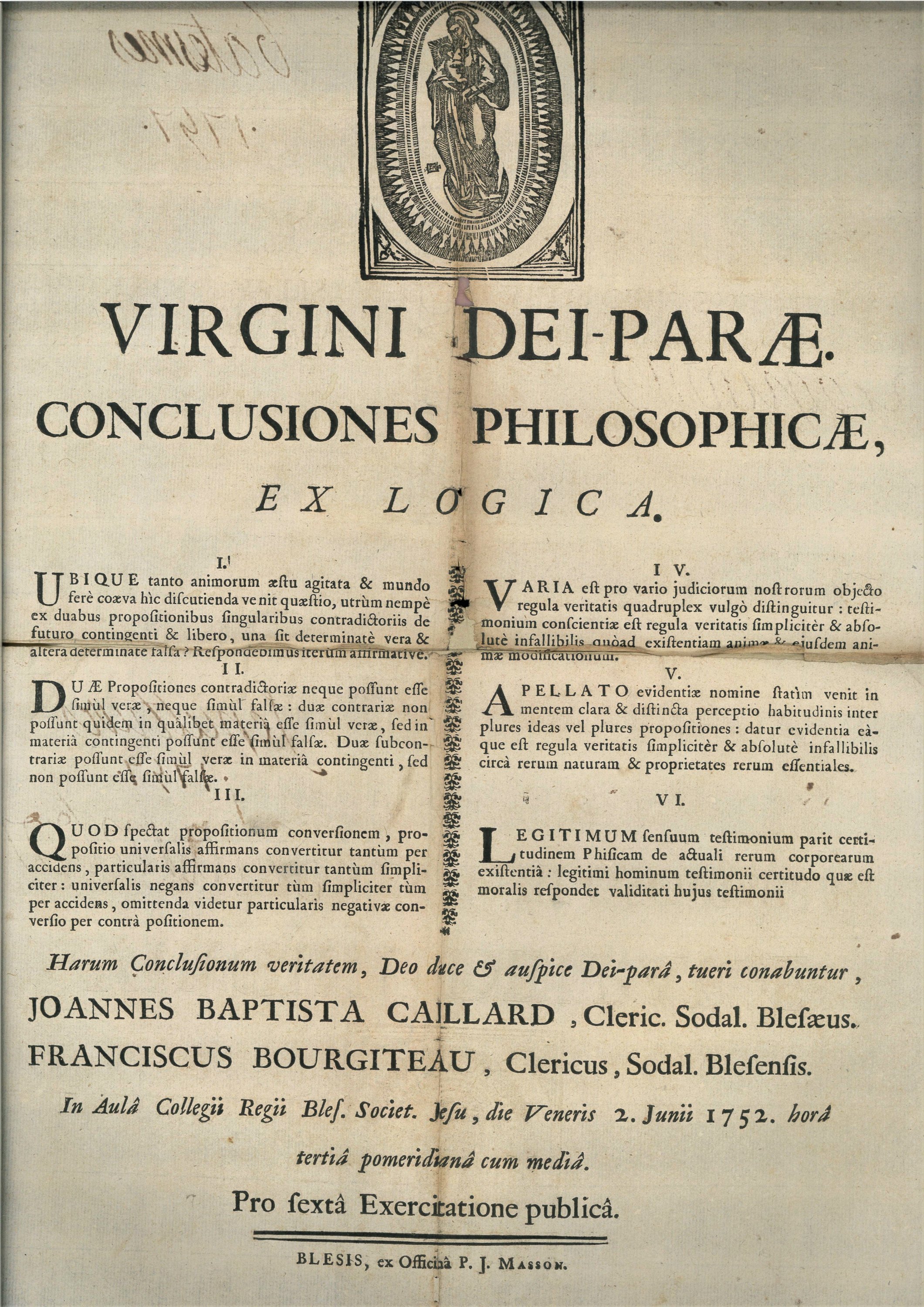 • Virgini Dei-Parae, conclusiones philosophicae ex logica, Blois, P.J. Masson, 1752, affichette 47 x 36 cm ;