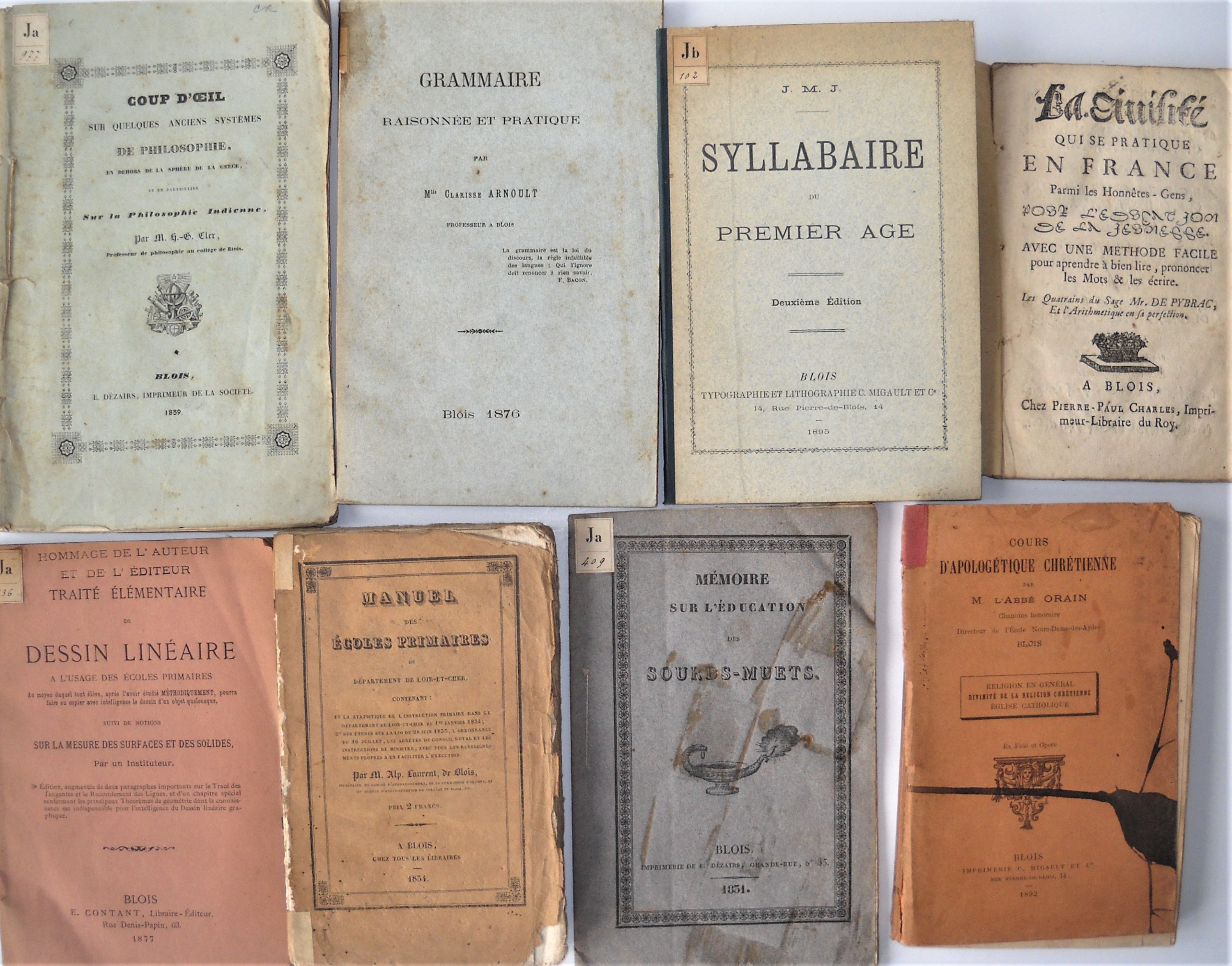, 1834 ; Gaudeau ex-principal du collège de Blois, Leçons synchroniques dhistoire générale en colonnes synoptiques, 1835 ; Burat professeur de mathématiques au collège de Blois, Arithmétique à lusage des collèges et des écoles normales, 1837 ; Cler professeur de philosophie au collège de Blois, Coup dil sur quelques anciens systèmes de philosophie
