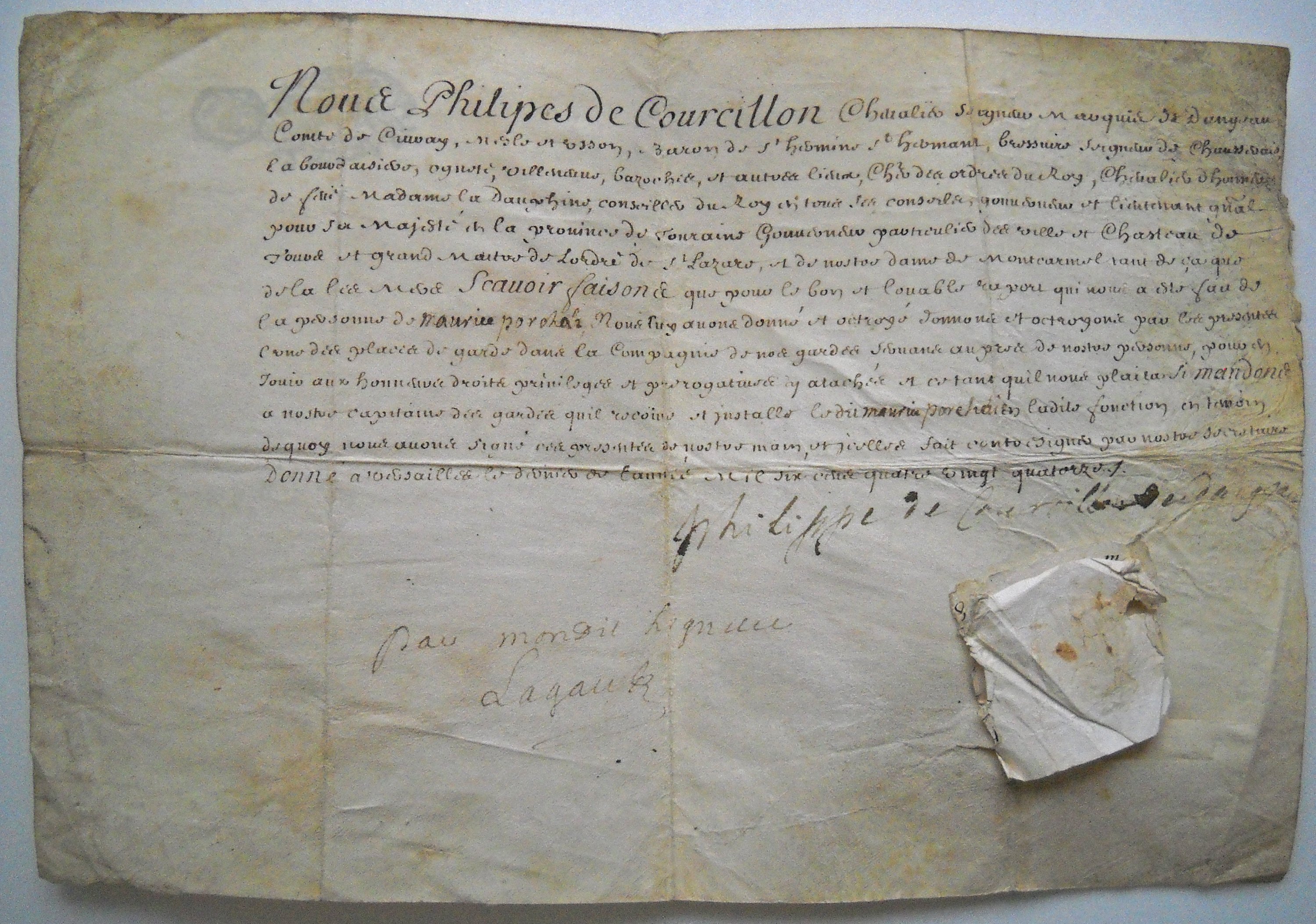 P.S., Versailles, 31 décembre 1694, Philippe de Courcillon, marquis de Dan-geau, gouverneur et lieutenant-général en la province de Touraine, gouver-neur particulier des ville et château de Tours, et contresignée par Jean La-gau, secrétaire du roi.