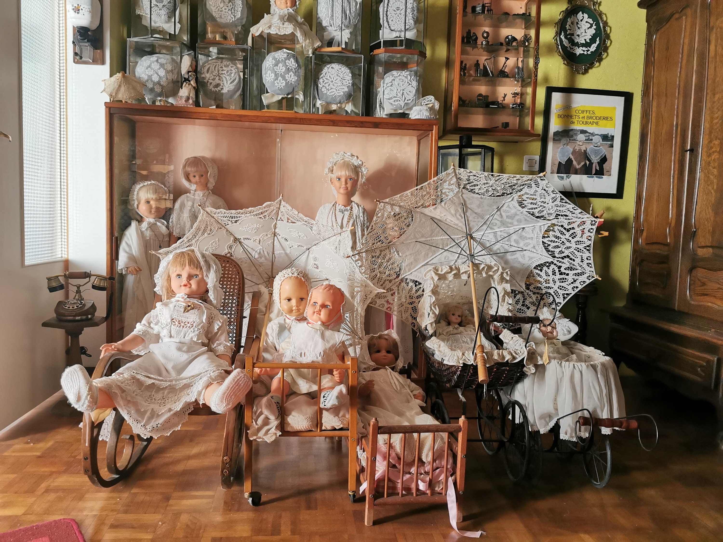 environ 230 coiffes, une quarantaines de mannequin costumés, quinze landaus et leurs baigneurs costumés.