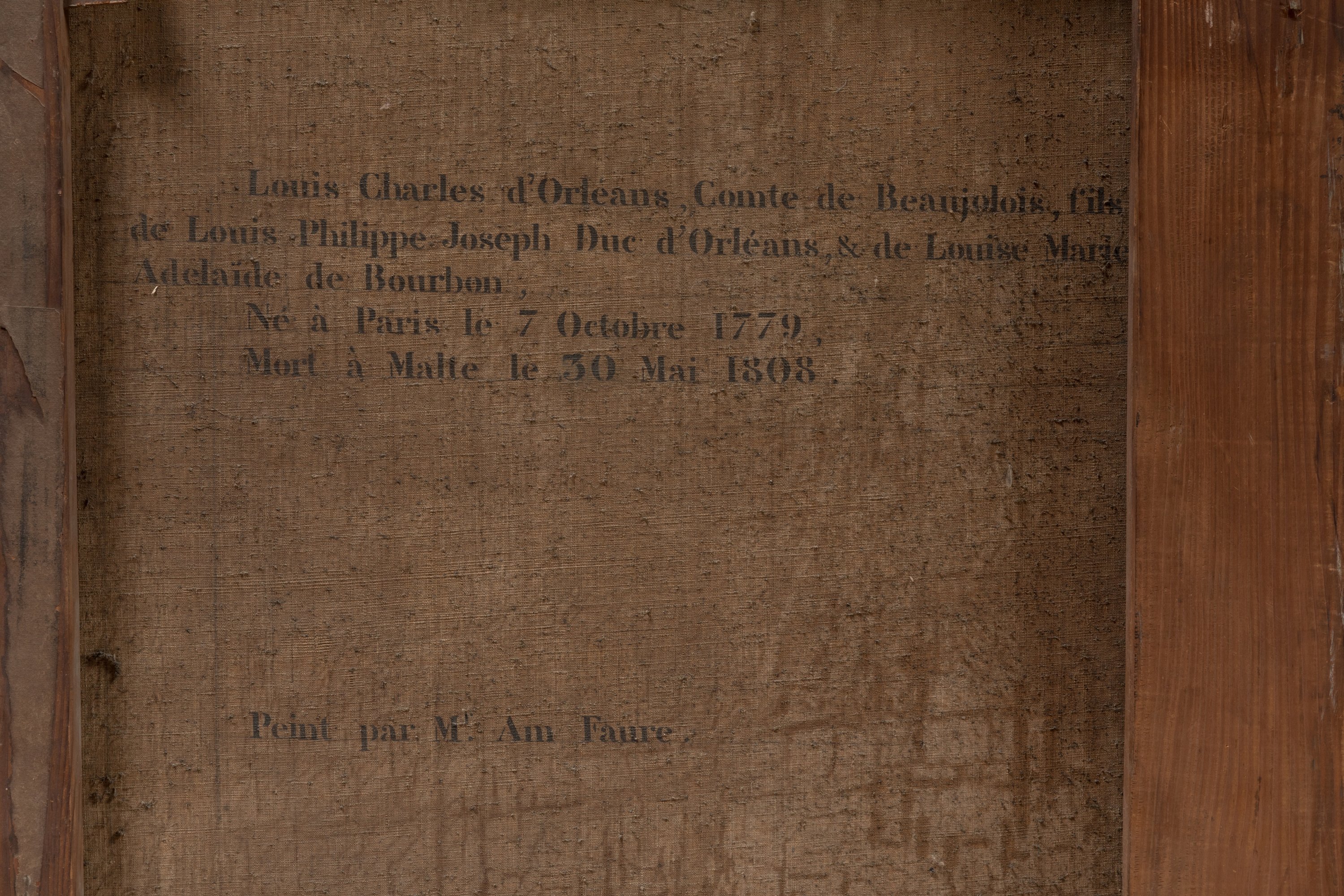 Devenu Roi en 1830 sous le nom de Louis-Philippe Ier, le duc d'Orléans initie une vaste campagne de commandes artistiques visant à réconcilier les Français avec leur Histoire et à inscrire son règne dans le récit national. En juin 1837 sont inaugurées au château de Versailles les Galeries Historiques dédiées « à toutes les gloires de la France ». Victor Amédée Faure bénéficie largement du mécénat royal, devenant l'un des peintres attitrés de la famille d'Orléans. Il réalise en 1835 pour le château d'Eu deux grands portraits du frère puiné et du dernier frère du monarque, Louis-Charles, dont les répliques sont conservées à Compiègne. Il représente en pied les deux frères du souverain, décédés prématurément, soulignant leurs présences sur les champs de batailles révolutionnaires. De mai à juillet 1792, le comte de Beaujolais, âgé de douze ans, accompagne en effet son père le duc d'Orléans sur le front où servent ses frères les ducs de Montpensier et de Chartres, futur Louis-Philippe. Ces portraits sont ensuite passés dans la descendance du Duc de Nemours, fils ainé de Louis-Philippe.
