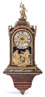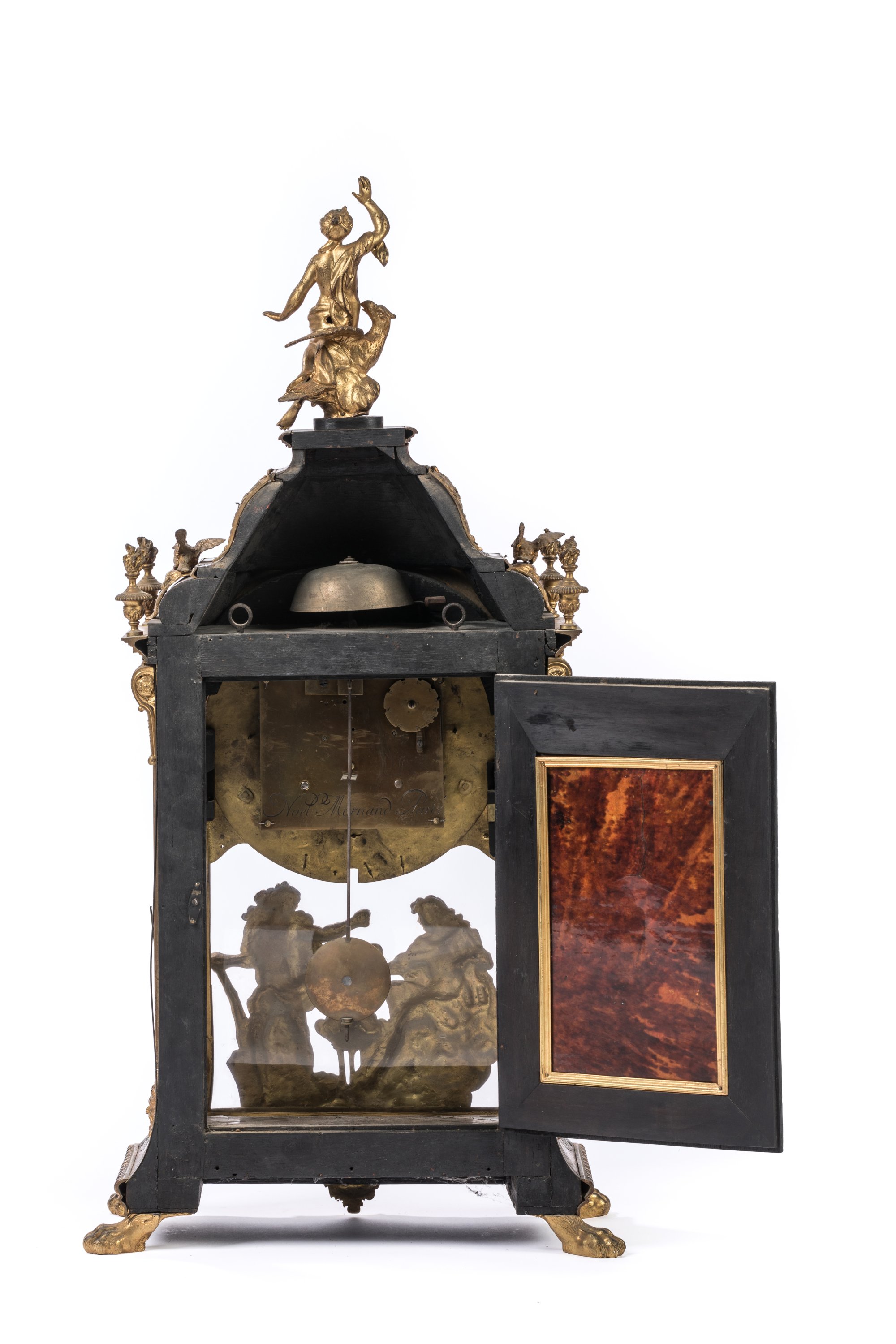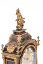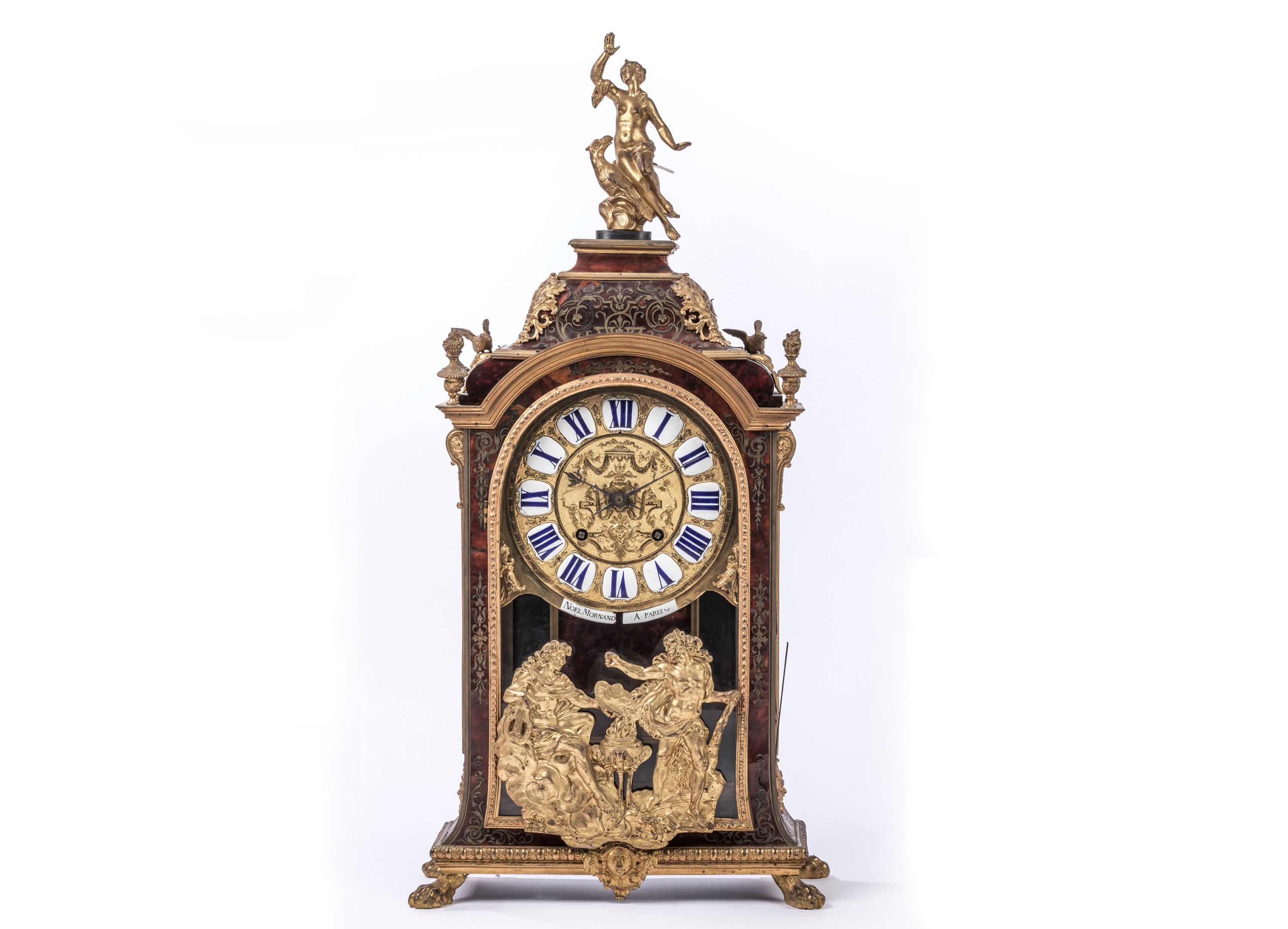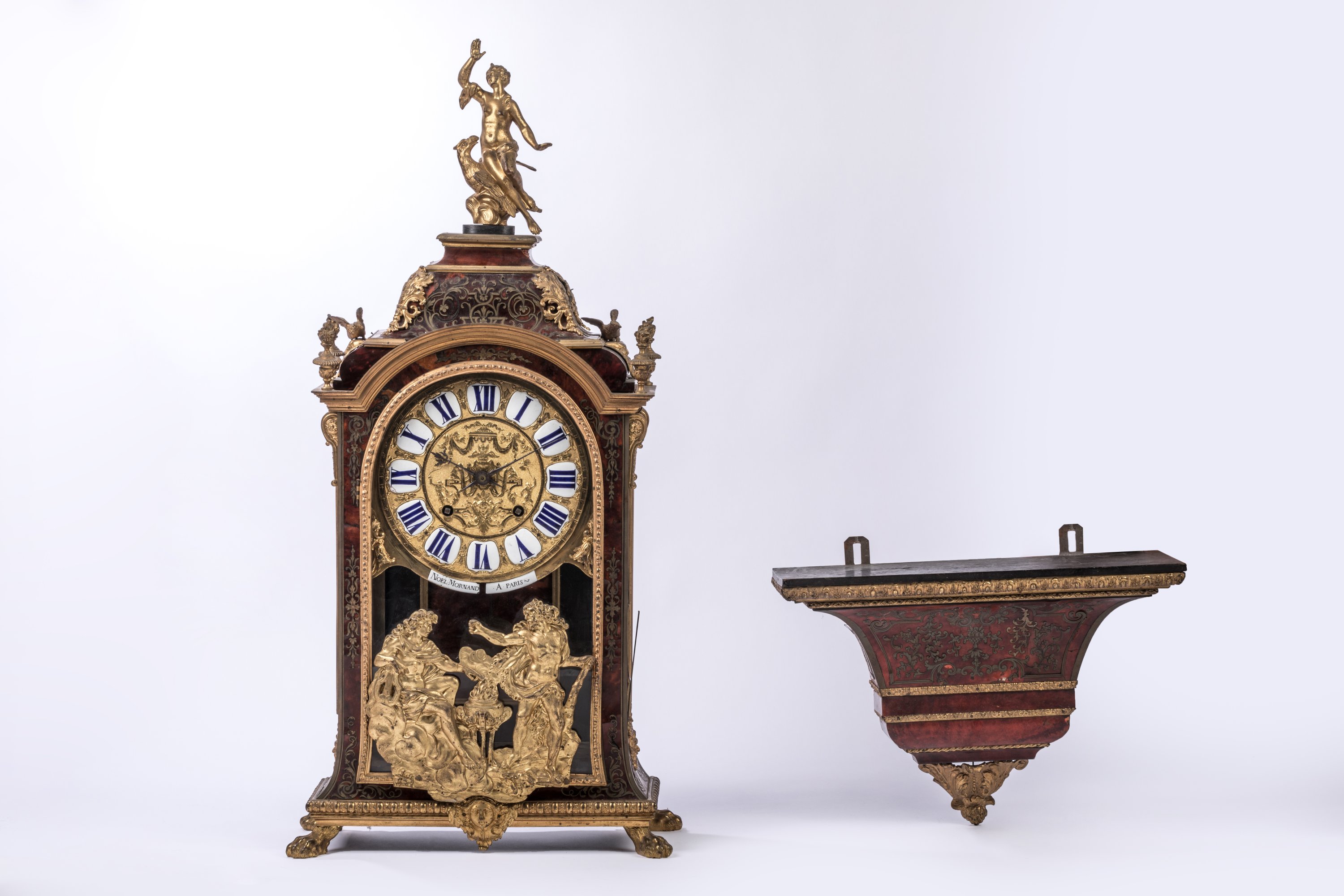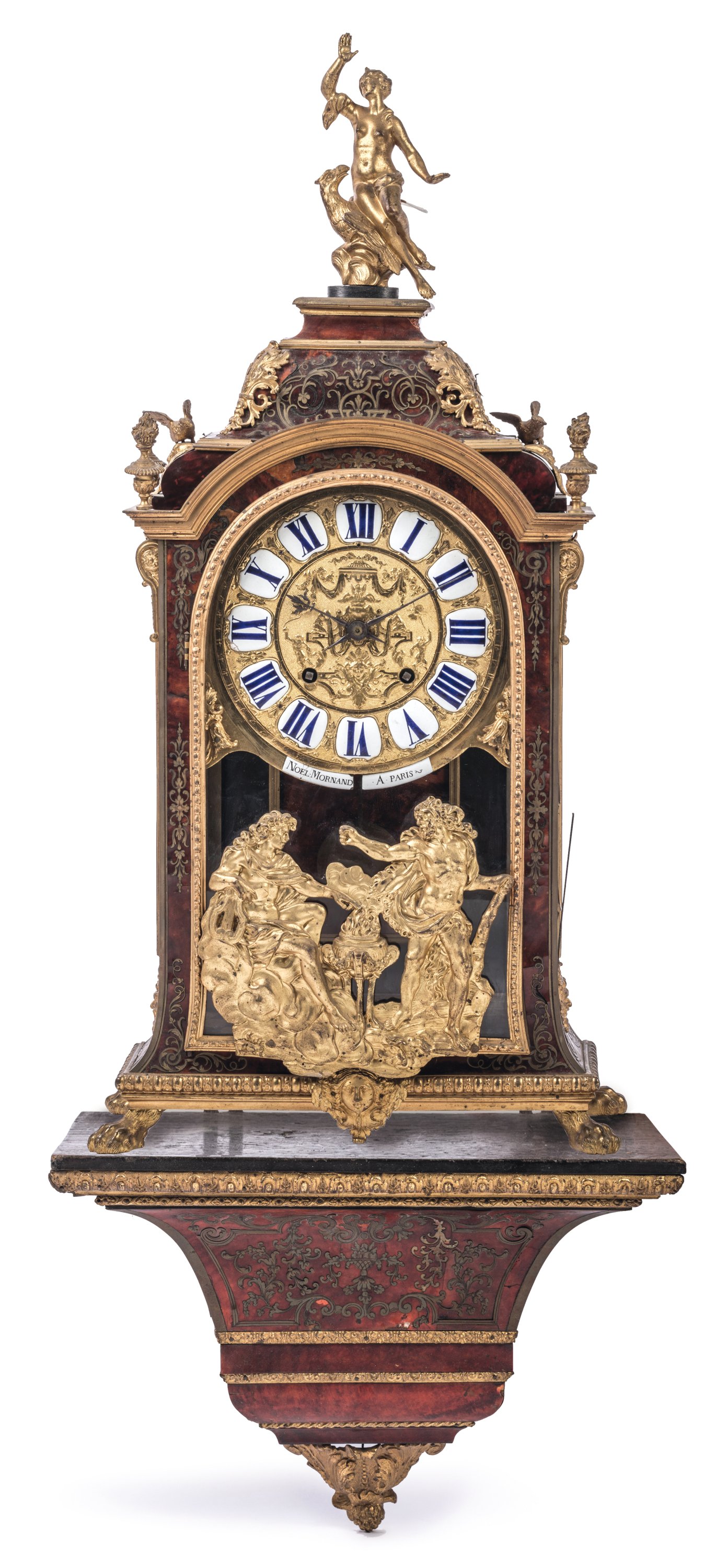 en écaille, laiton et bronze doré. La partie haute en forme de dôme est surmontée d'une figure de La Renommée sur l'aigle de Zeus. Le boitier d'horloge, de forme rectangulaire en laiton gravé sur fond d'écaille rouge, est orné de galeries, d'enroulements feuillagés, d'oiseaux et de pots-à-feux en bronze doré et ciselé. Il présente quatre consoles feuillagées. La porte vitrée en façade est ornée d'un bas-relief figurant Apollon et Héraclès se disputant le trépied de Delphes. Le cadran à chiffres romains est orné de quatorze pièces émaillées sur cuivre et signé "Noel Mornand à Paris". L'ensemble repose sur quatre pieds griffus.